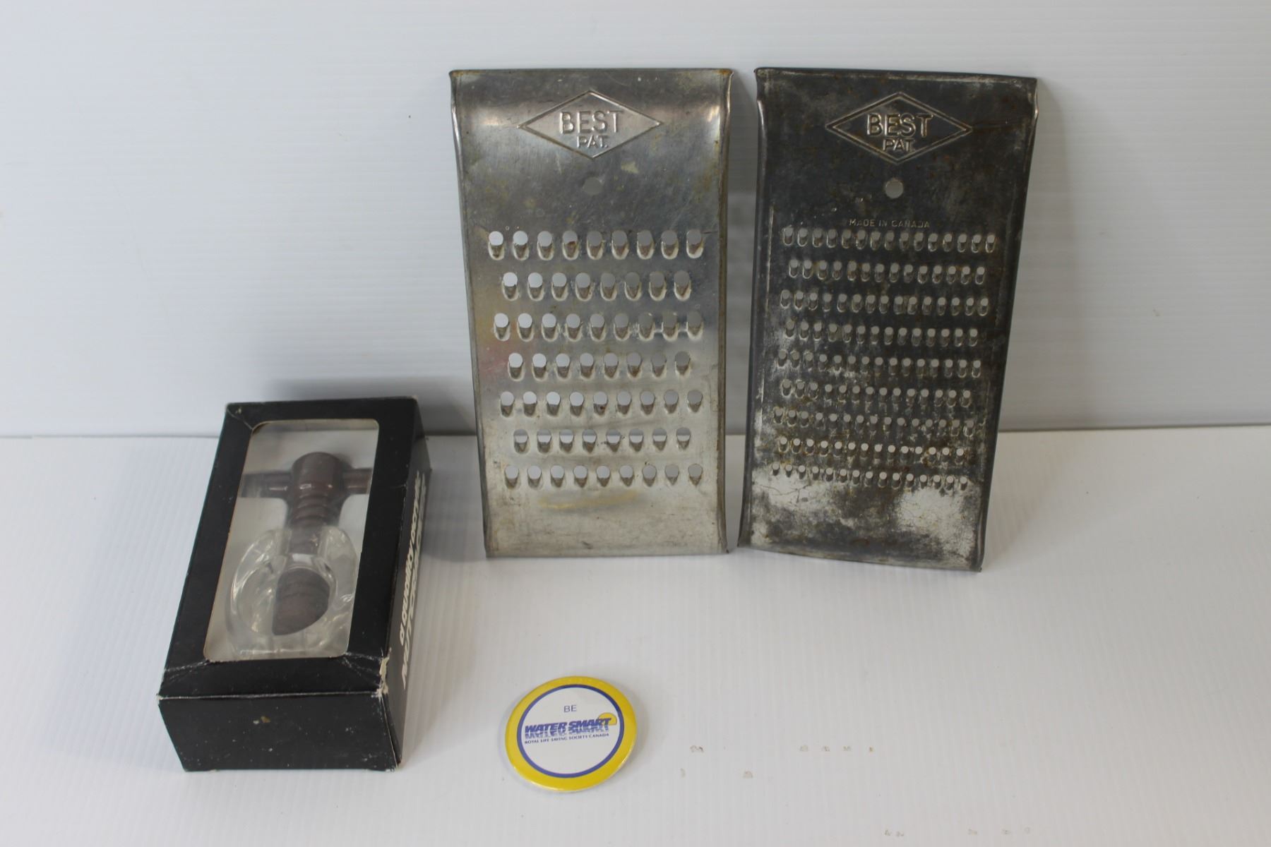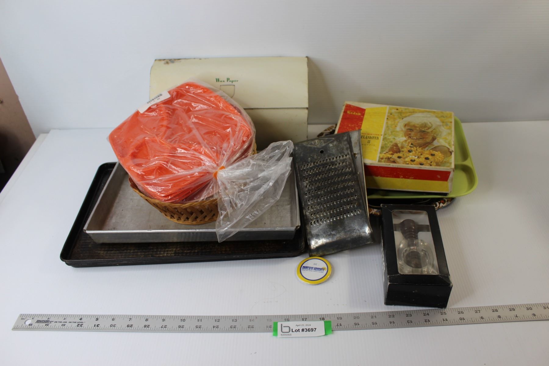 Vintage Wax Paper Dispenser, Kodak Camera, Baking Pans, Wicker Plates, Graters, Nutcracker, etc.