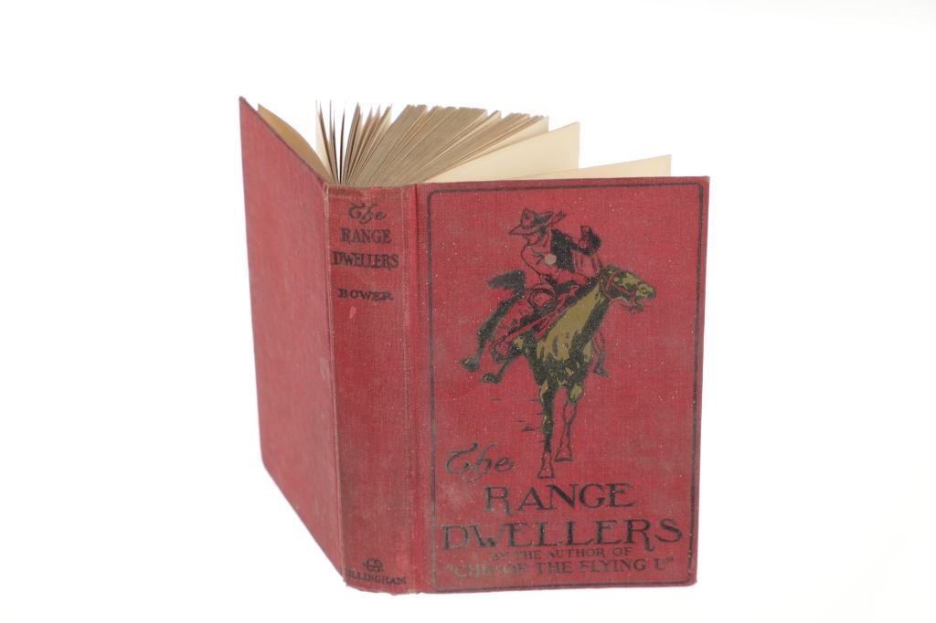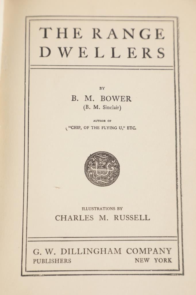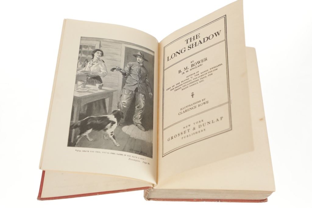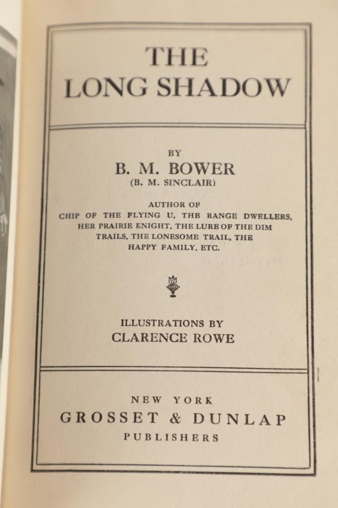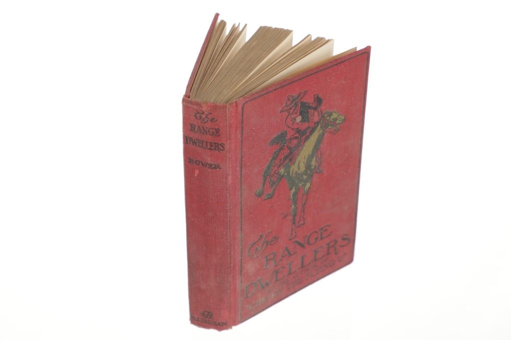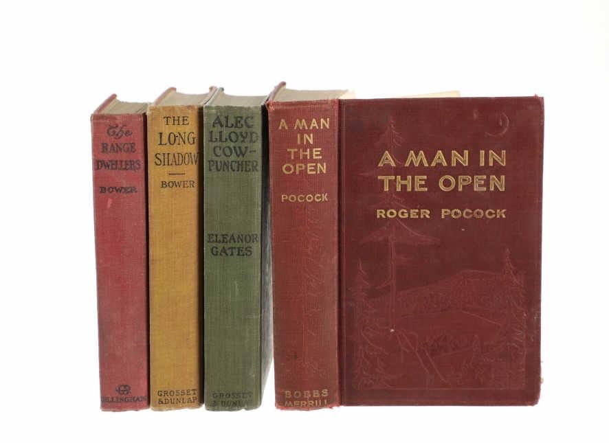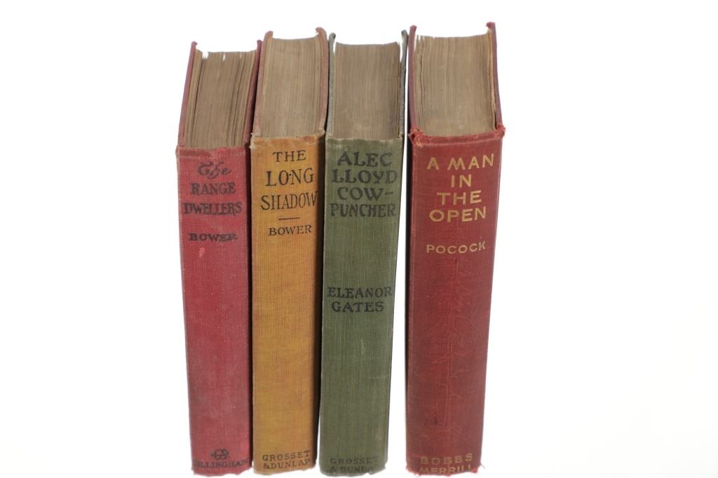 For your consideration is this collection of four (4) vintage Western books from various authors. The first book in this collection is titled, "Alec Lloyd, Cowpuncher" by Eleanor Gates, published by Grosset & Dunlap in New York 1907 and copy-righted by The McClure Company in 1907. This is a collection of stories loosely strung together about an Oklahoma cowboy with romance on his mind. Known to one and all as “Cupid” Lloyd, he likes to match up folks he thinks would make good couples. A matchmaking cowboy is an odd premise for a book of fiction, but given Lloyd’s lack of prospects for marriage himself, there is poignance in his situation and potential for seriocomic developments. The books front cover is loosely connected from the inside. The interior pages are in good condition with no tears or signs of foxing. The book is overall in good condition. It measures 7 1/2" L x 5 1/4" W x 1 1/4" D. The second book is titled, "The Long Shadow" by B. M. Bower and illustrated by Clarence Rowe. The book was published by Grosset & Dunlap in New York and copy-righted by G. W. Dillingham Company in 1909. The story takes place in Montana as civilization is pressing in, with its fences, plows, farmers....what is a lifelong cowboy supposed to do with himself when he realizes that his world is threatened by that menacing, long shadow of civilization? The book is in good condition with very slight wear from its vintage age. The interior pages are in good condition as well with no tears or signs of foxing present. The book measures 7 1/2" L x 5 1/2" W x 1 1/4" D. The third book in this collection is titled, "A Man In The Open" by Roger Pocock, published by The Bobbs-Merrill Company in Indianapolis and copy-righted by The Bobb-Merrill Company in 1912. The book features drawn in illustrations from an unknown persons. Overall the book is in good condition with slight wear to the outside cover and top of spine. The interior pages are in good condition with no tears or signs of foxing present. The book measures 7 3/4" L x 5 1/2" W x 1 1/2" D. The fourth and final book in this collection is titled, "The Range Dwellers" by B. M. Bower and illustrations by Charles M. Russell. The book was published by G. W. Dillingham Company in New York and copy-righted by the same company in 1907. The story is about a millionaire's son, who's gotten somewhat out of hand, is sent out to his dad's ranch in Montana to reform, but he spends most of his time trying to woo a young woman from a neighboring ranch. The books cover and spine are loose but still connected, while the entirety of the book is in good condition. The interior pages are in good condition as well with no tears or signs of foxing present. The book measures 7 1/4" L x 5" W x 1 1/4" D.