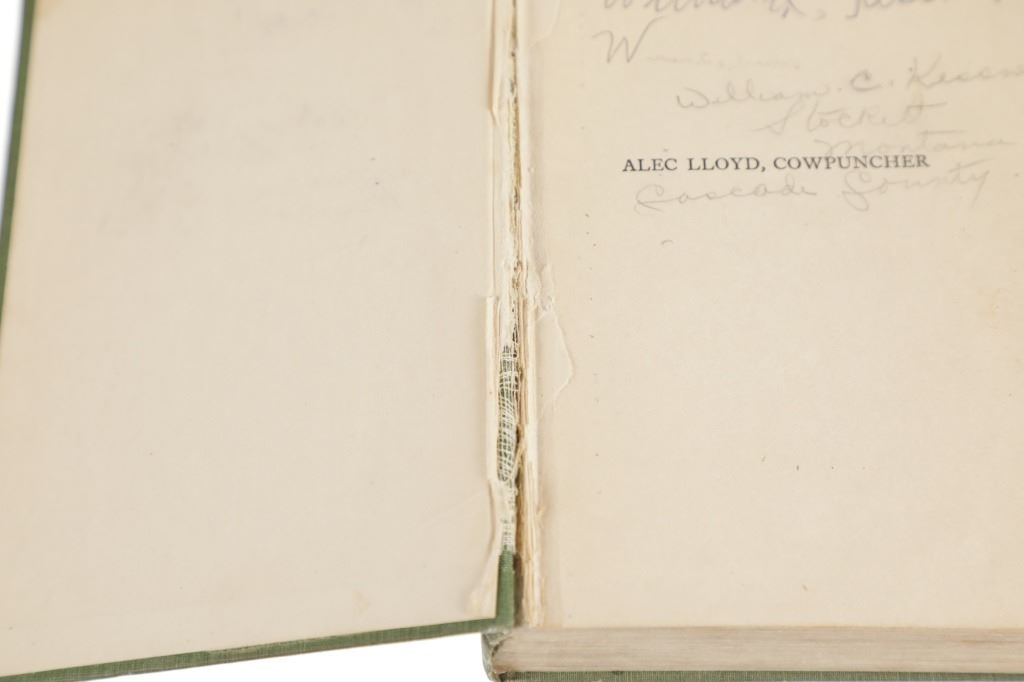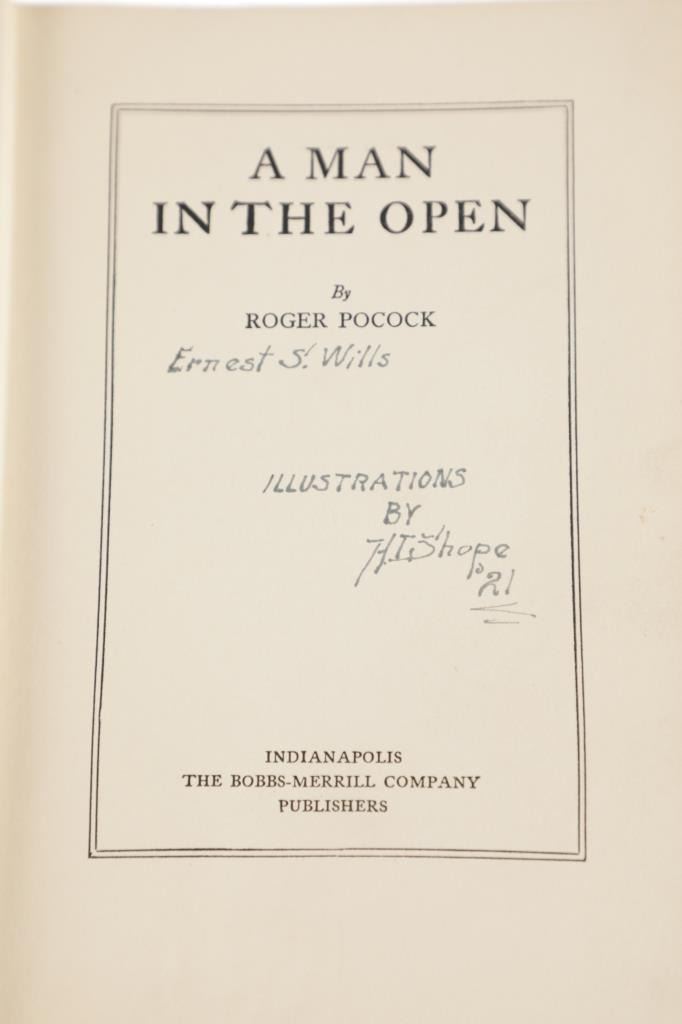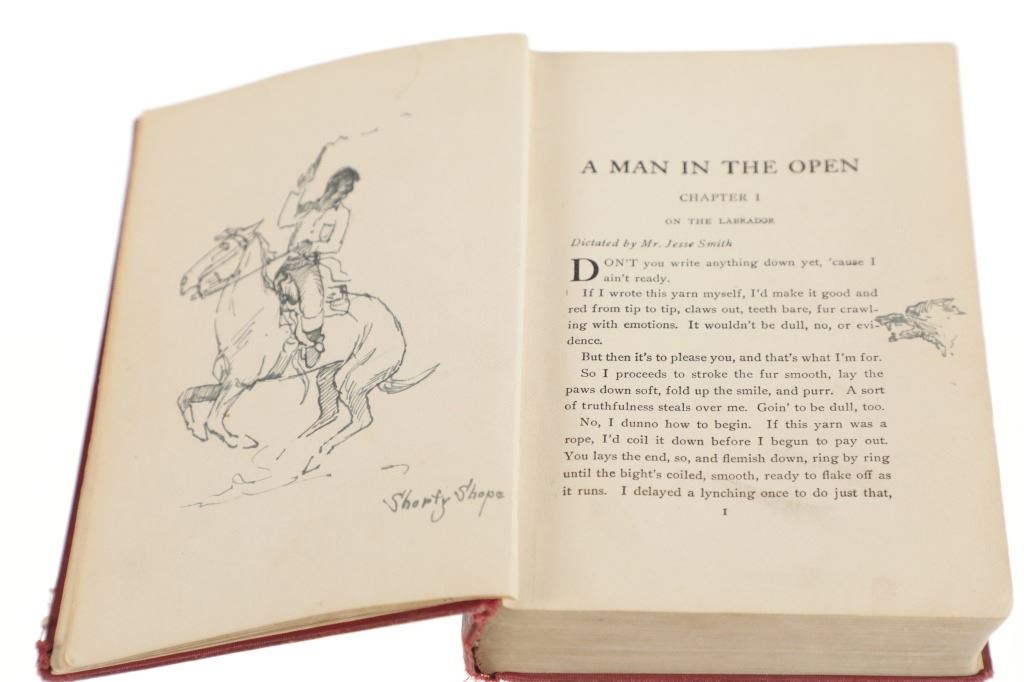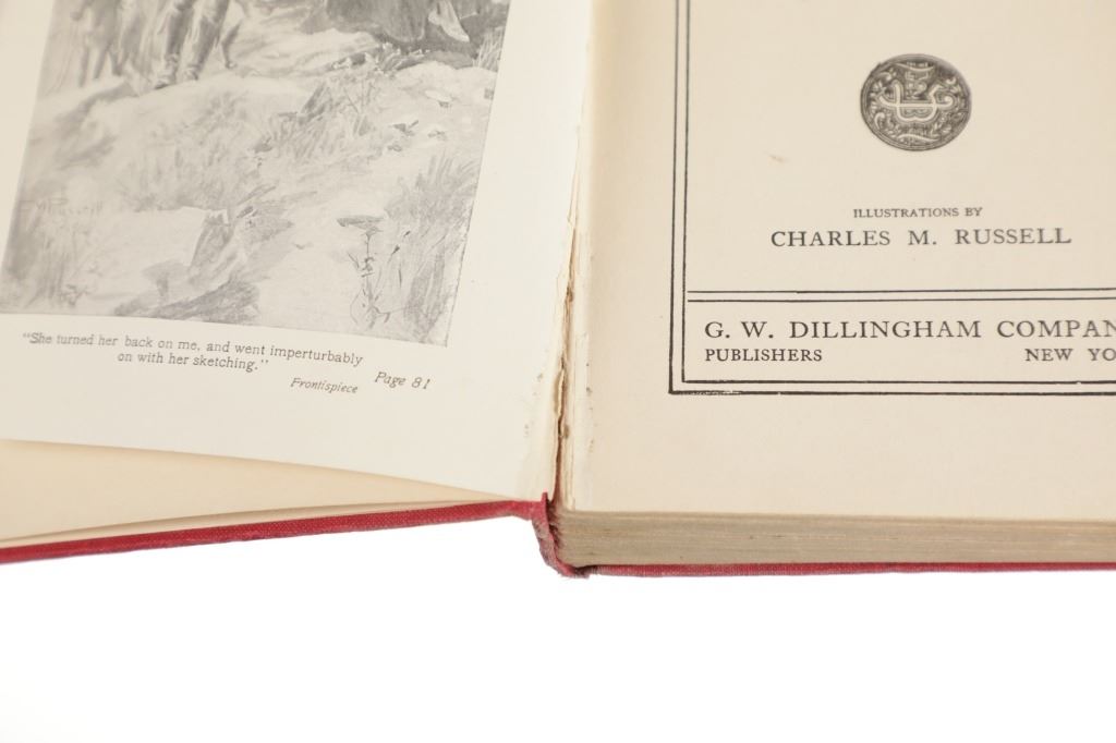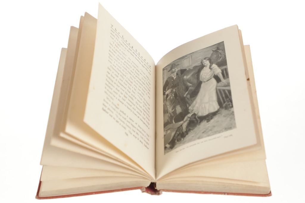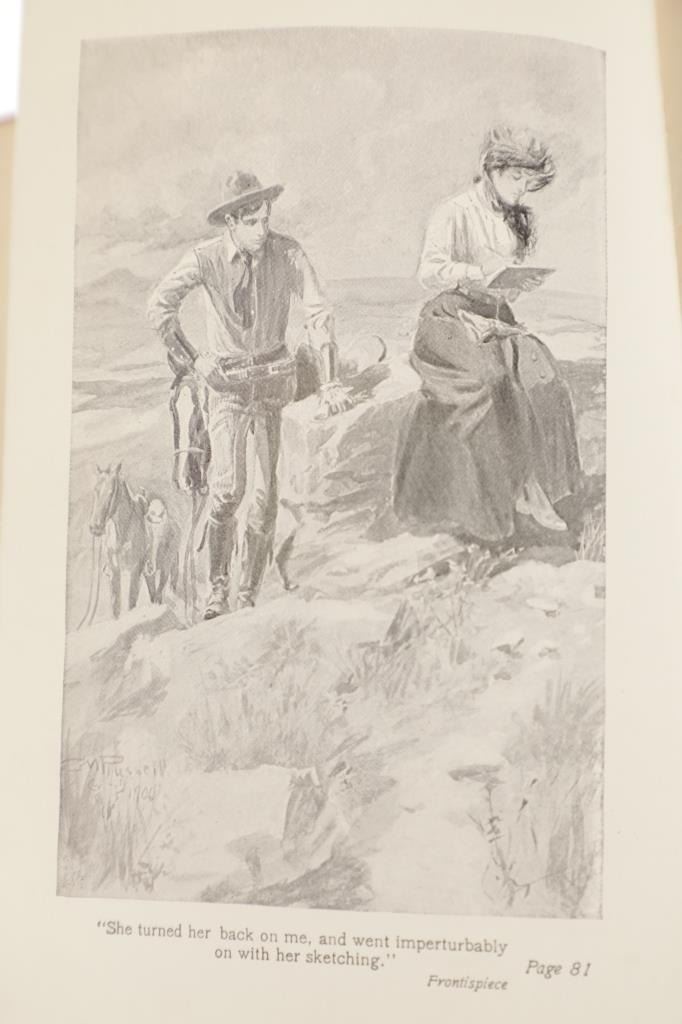 For your consideration is this collection of four (4) vintage Western books from various authors. The first book in this collection is titled, "Alec Lloyd, Cowpuncher" by Eleanor Gates, published by Grosset & Dunlap in New York 1907 and copy-righted by The McClure Company in 1907. This is a collection of stories loosely strung together about an Oklahoma cowboy with romance on his mind. Known to one and all as “Cupid” Lloyd, he likes to match up folks he thinks would make good couples. A matchmaking cowboy is an odd premise for a book of fiction, but given Lloyd’s lack of prospects for marriage himself, there is poignance in his situation and potential for seriocomic developments. The books front cover is loosely connected from the inside. The interior pages are in good condition with no tears or signs of foxing. The book is overall in good condition. It measures 7 1/2" L x 5 1/4" W x 1 1/4" D. The second book is titled, "The Long Shadow" by B. M. Bower and illustrated by Clarence Rowe. The book was published by Grosset & Dunlap in New York and copy-righted by G. W. Dillingham Company in 1909. The story takes place in Montana as civilization is pressing in, with its fences, plows, farmers....what is a lifelong cowboy supposed to do with himself when he realizes that his world is threatened by that menacing, long shadow of civilization? The book is in good condition with very slight wear from its vintage age. The interior pages are in good condition as well with no tears or signs of foxing present. The book measures 7 1/2" L x 5 1/2" W x 1 1/4" D. The third book in this collection is titled, "A Man In The Open" by Roger Pocock, published by The Bobbs-Merrill Company in Indianapolis and copy-righted by The Bobb-Merrill Company in 1912. The book features drawn in illustrations from an unknown persons. Overall the book is in good condition with slight wear to the outside cover and top of spine. The interior pages are in good condition with no tears or signs of foxing present. The book measures 7 3/4" L x 5 1/2" W x 1 1/2" D. The fourth and final book in this collection is titled, "The Range Dwellers" by B. M. Bower and illustrations by Charles M. Russell. The book was published by G. W. Dillingham Company in New York and copy-righted by the same company in 1907. The story is about a millionaire's son, who's gotten somewhat out of hand, is sent out to his dad's ranch in Montana to reform, but he spends most of his time trying to woo a young woman from a neighboring ranch. The books cover and spine are loose but still connected, while the entirety of the book is in good condition. The interior pages are in good condition as well with no tears or signs of foxing present. The book measures 7 1/4" L x 5" W x 1 1/4" D.