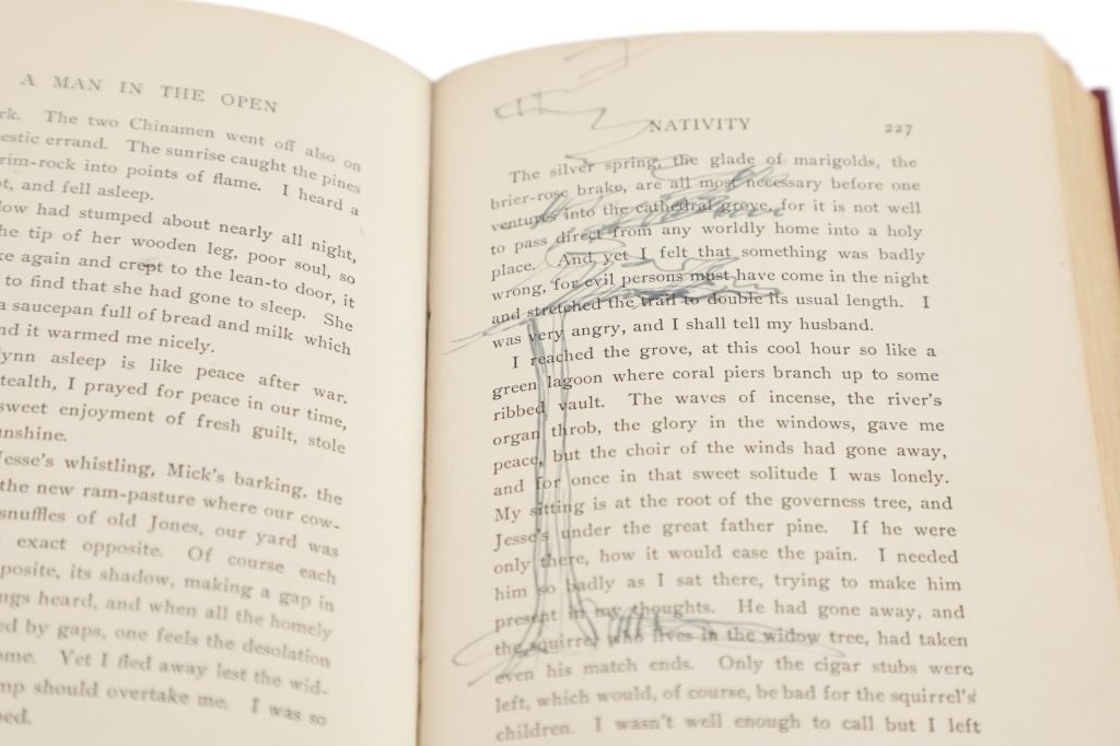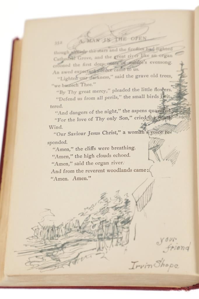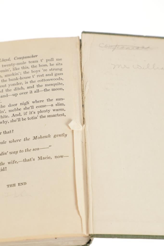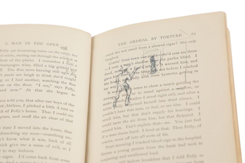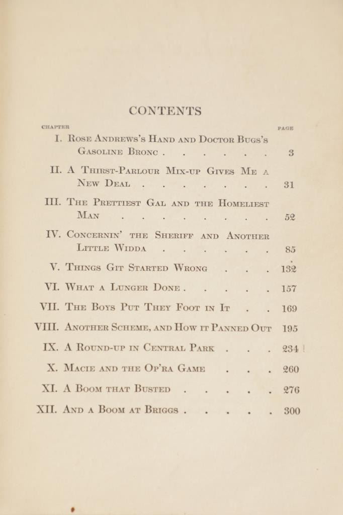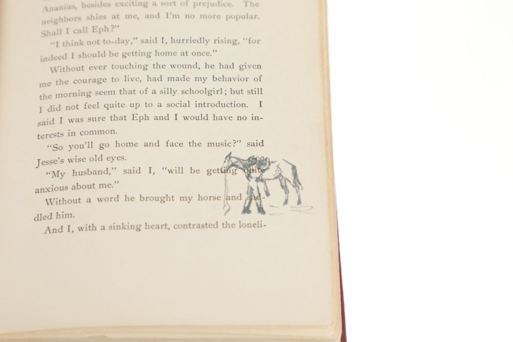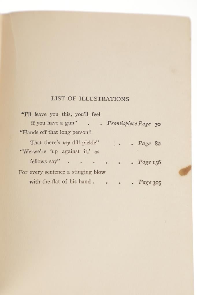 For your consideration is this collection of four (4) vintage Western books from various authors. The first book in this collection is titled, "Alec Lloyd, Cowpuncher" by Eleanor Gates, published by Grosset & Dunlap in New York 1907 and copy-righted by The McClure Company in 1907. This is a collection of stories loosely strung together about an Oklahoma cowboy with romance on his mind. Known to one and all as “Cupid” Lloyd, he likes to match up folks he thinks would make good couples. A matchmaking cowboy is an odd premise for a book of fiction, but given Lloyd’s lack of prospects for marriage himself, there is poignance in his situation and potential for seriocomic developments. The books front cover is loosely connected from the inside. The interior pages are in good condition with no tears or signs of foxing. The book is overall in good condition. It measures 7 1/2" L x 5 1/4" W x 1 1/4" D. The second book is titled, "The Long Shadow" by B. M. Bower and illustrated by Clarence Rowe. The book was published by Grosset & Dunlap in New York and copy-righted by G. W. Dillingham Company in 1909. The story takes place in Montana as civilization is pressing in, with its fences, plows, farmers....what is a lifelong cowboy supposed to do with himself when he realizes that his world is threatened by that menacing, long shadow of civilization? The book is in good condition with very slight wear from its vintage age. The interior pages are in good condition as well with no tears or signs of foxing present. The book measures 7 1/2" L x 5 1/2" W x 1 1/4" D. The third book in this collection is titled, "A Man In The Open" by Roger Pocock, published by The Bobbs-Merrill Company in Indianapolis and copy-righted by The Bobb-Merrill Company in 1912. The book features drawn in illustrations from an unknown persons. Overall the book is in good condition with slight wear to the outside cover and top of spine. The interior pages are in good condition with no tears or signs of foxing present. The book measures 7 3/4" L x 5 1/2" W x 1 1/2" D. The fourth and final book in this collection is titled, "The Range Dwellers" by B. M. Bower and illustrations by Charles M. Russell. The book was published by G. W. Dillingham Company in New York and copy-righted by the same company in 1907. The story is about a millionaire's son, who's gotten somewhat out of hand, is sent out to his dad's ranch in Montana to reform, but he spends most of his time trying to woo a young woman from a neighboring ranch. The books cover and spine are loose but still connected, while the entirety of the book is in good condition. The interior pages are in good condition as well with no tears or signs of foxing present. The book measures 7 1/4" L x 5" W x 1 1/4" D.