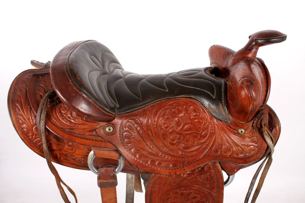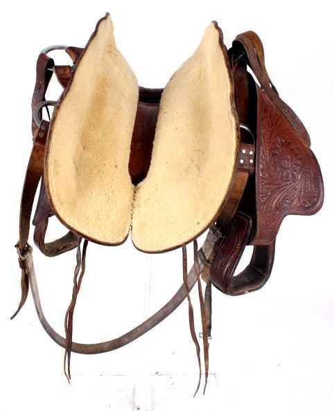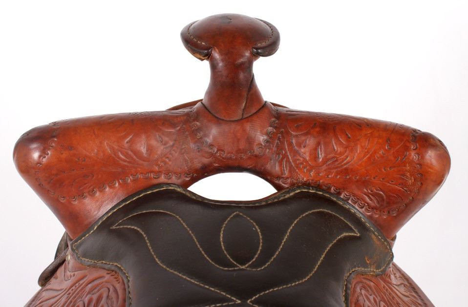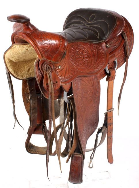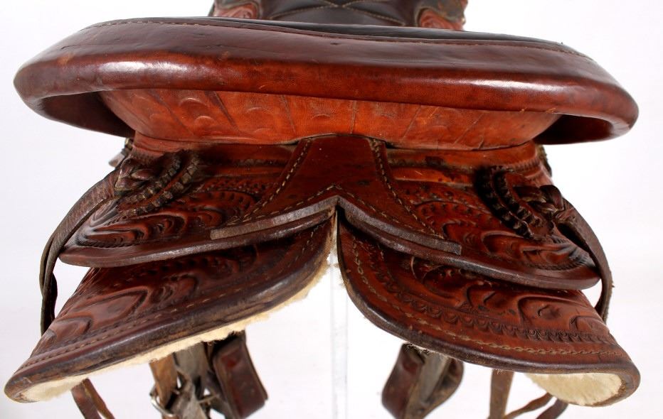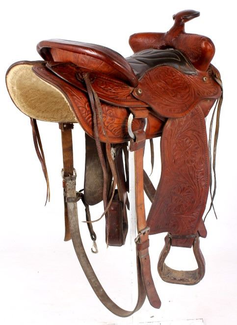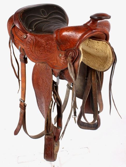 Available in this lot for bidding is an ornate full tooled western saddle. This very supple saddle is tooled in a Sheridan-style from the bottom to the top. The double stacked leather conchos accentuate the gorgeous tooled jockeys. Look closer at the saddle and appreciate the leather wrapped pommel and horn. The gullet has been carved with the name "M. Barney". Finishing off the piece is a 15" stitched leather seat. Overall, the saddle is in very good condition displaying only very small scuffs on the leather.