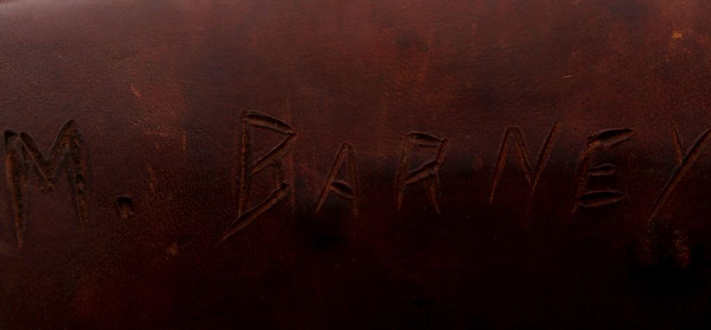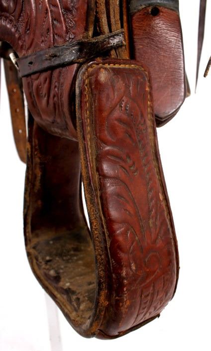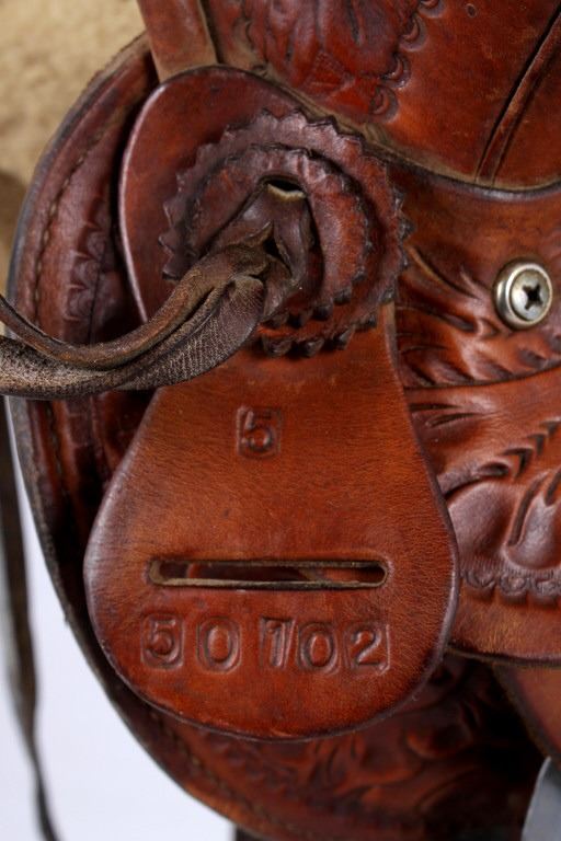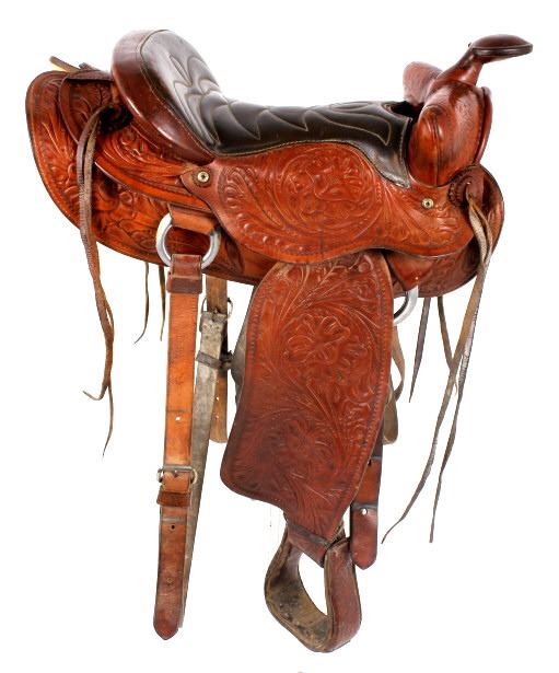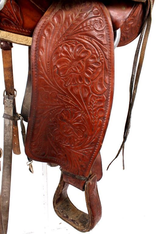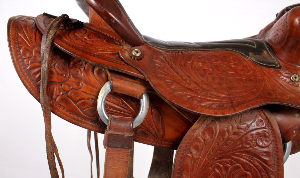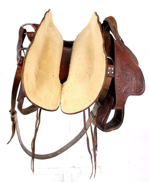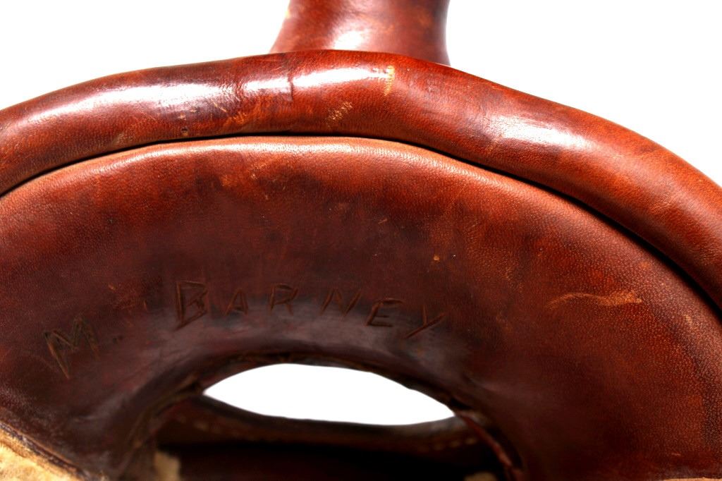 Available in this lot for bidding is an ornate full tooled western saddle. This very supple saddle is tooled in a Sheridan-style from the bottom to the top. The double stacked leather conchos accentuate the gorgeous tooled jockeys. Look closer at the saddle and appreciate the leather wrapped pommel and horn. The gullet has been carved with the name "M. Barney". Finishing off the piece is a 15" stitched leather seat. Overall, the saddle is in very good condition displaying only very small scuffs on the leather.