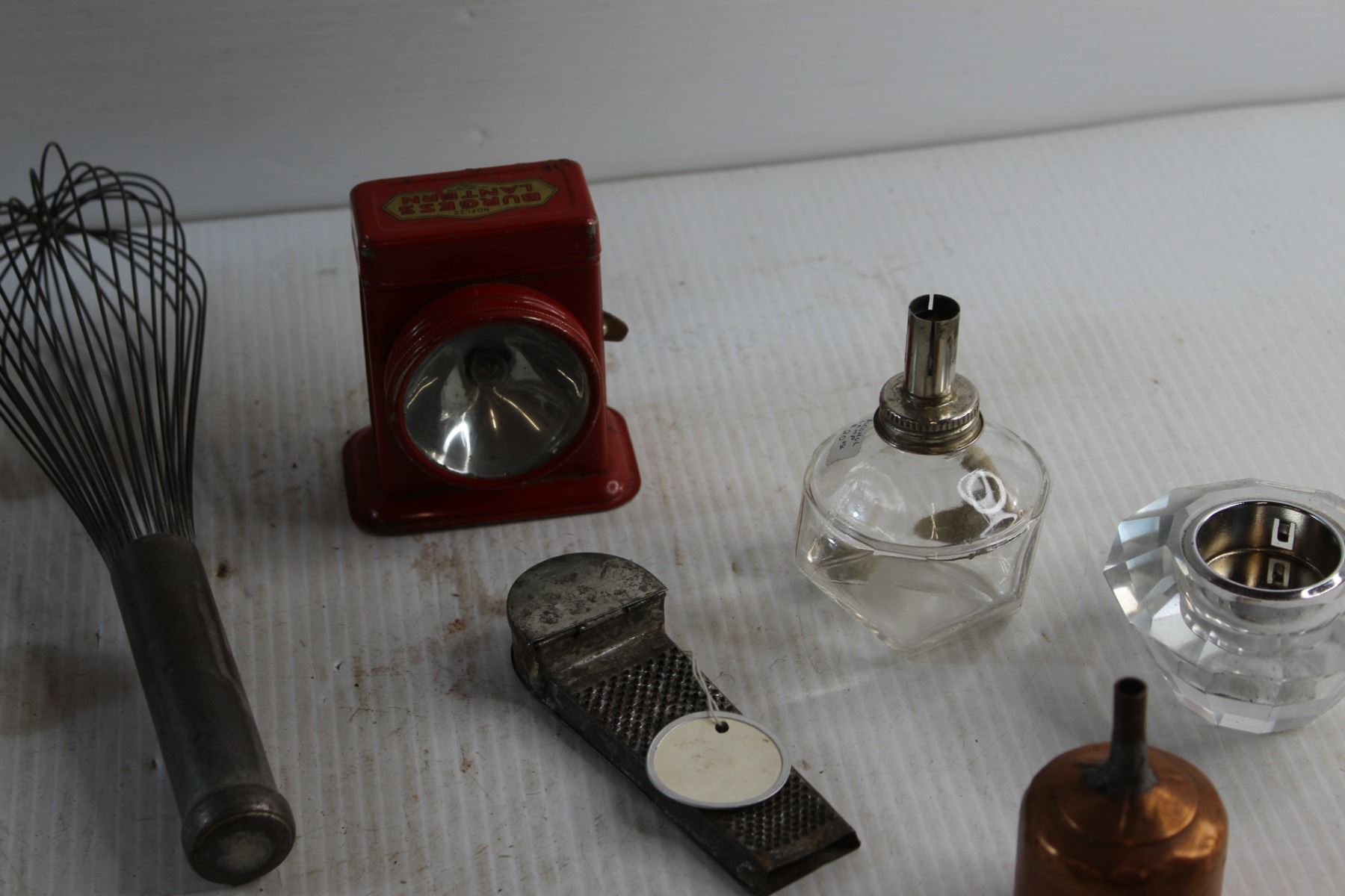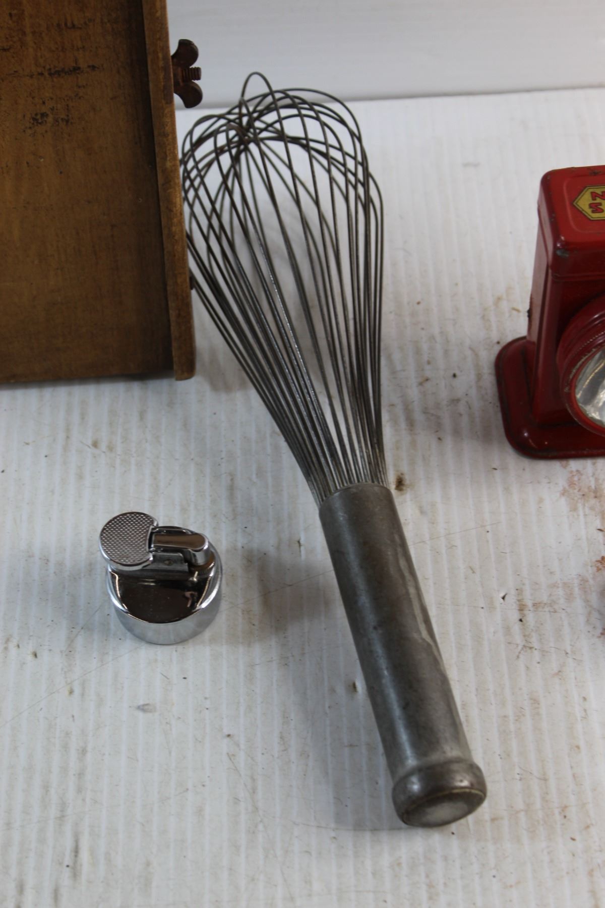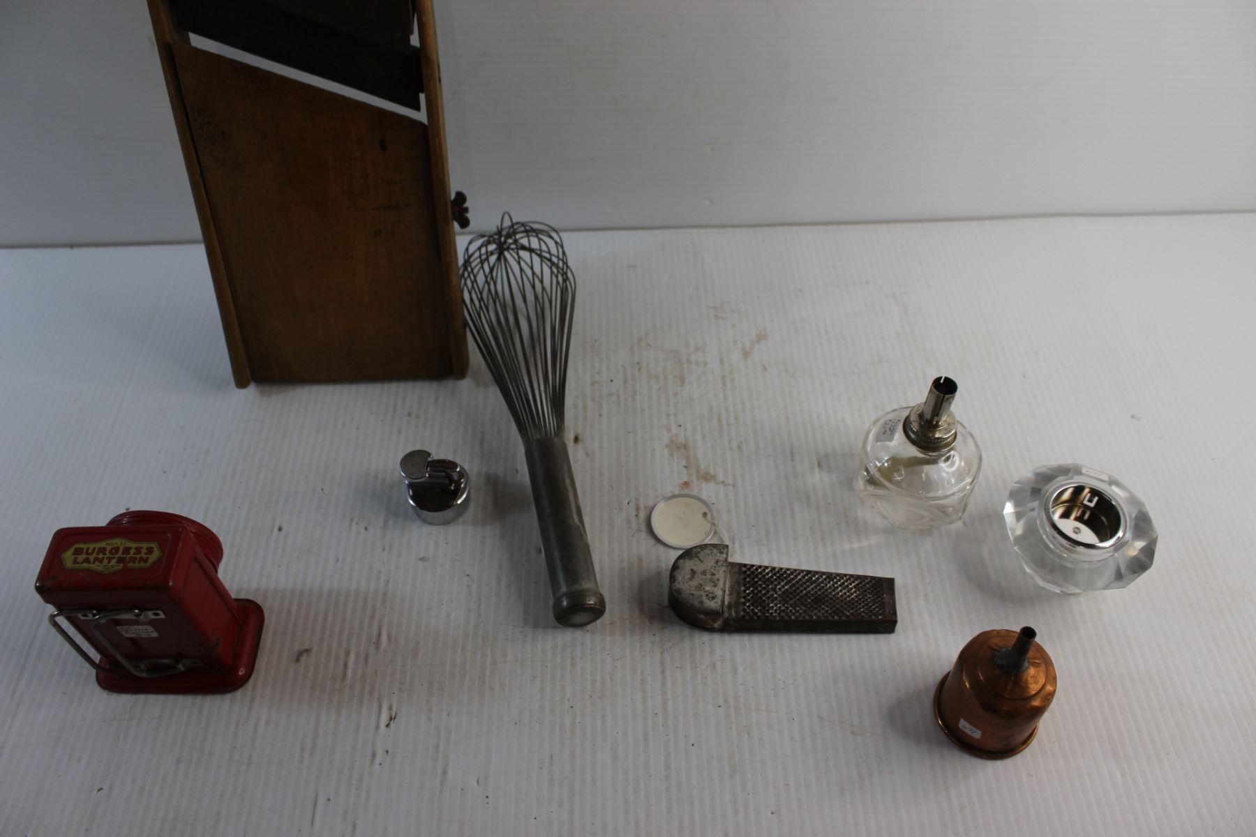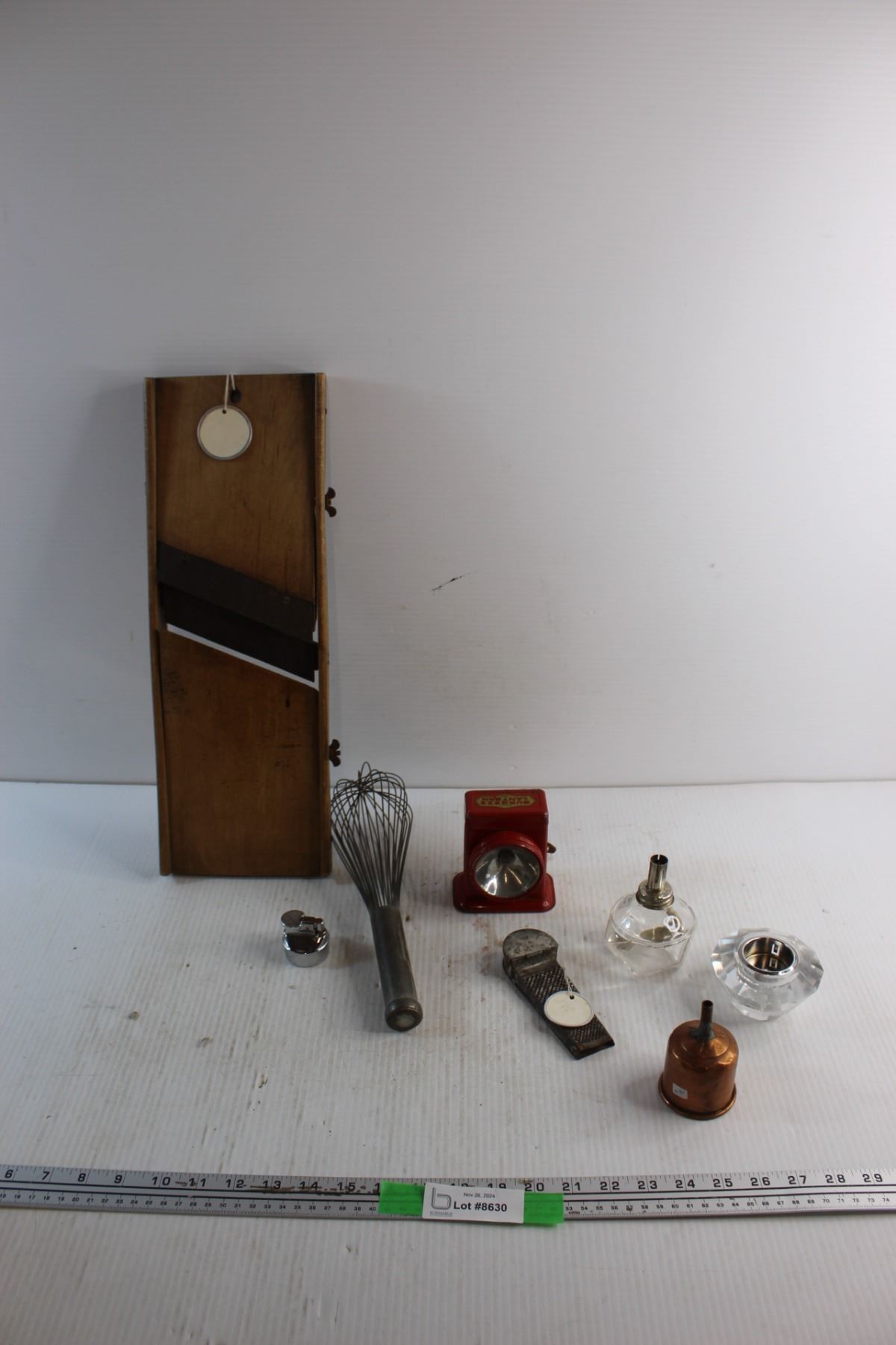 Vintage Whisk, Nutmeg Greater, Cabbage Cutter, Lantern Flashlight, Lighter, Liquid Strainer and Misc.