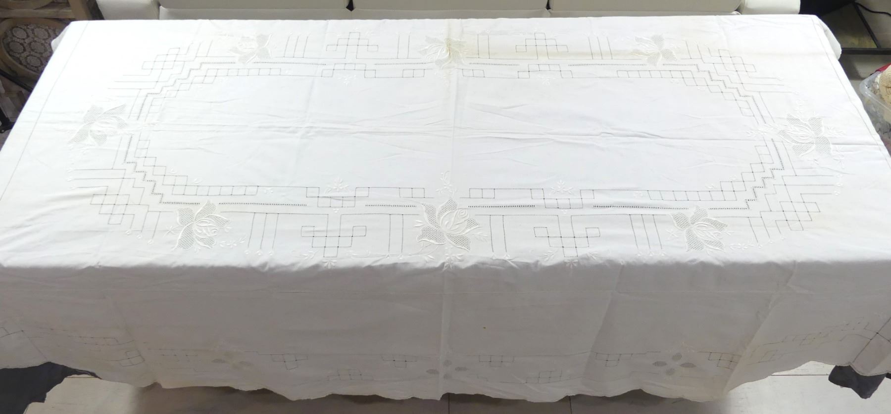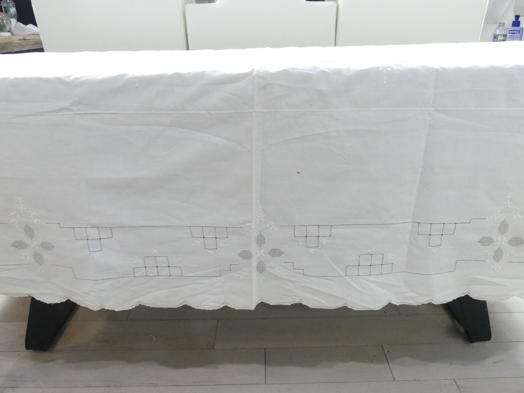 Vintage White Oval Tablecloth with Embroidery & Pulled Thread Work