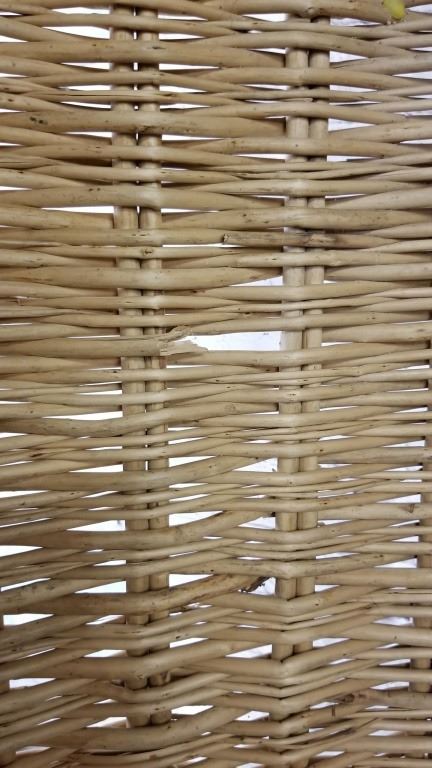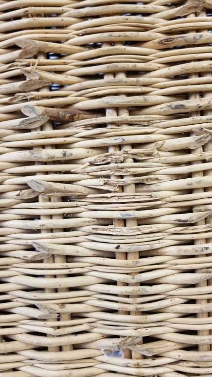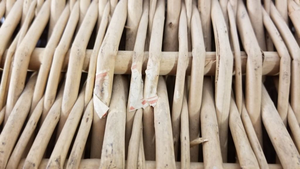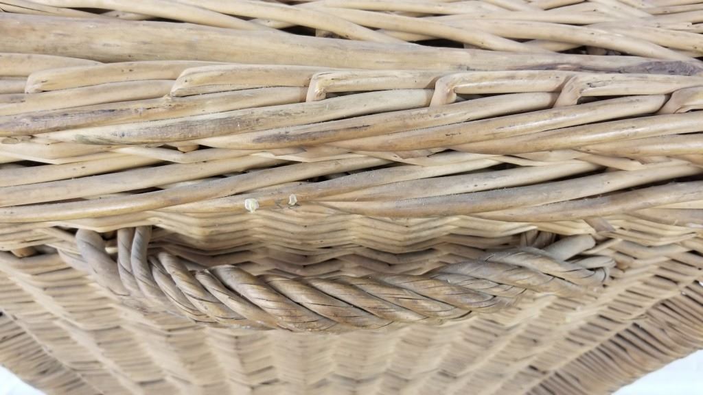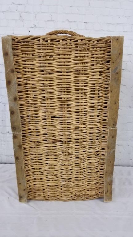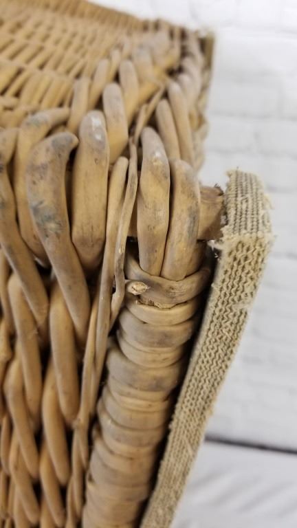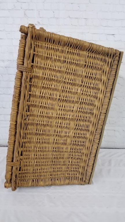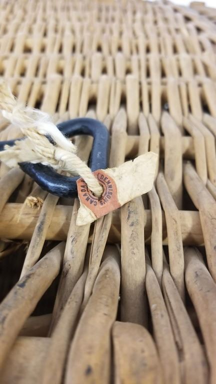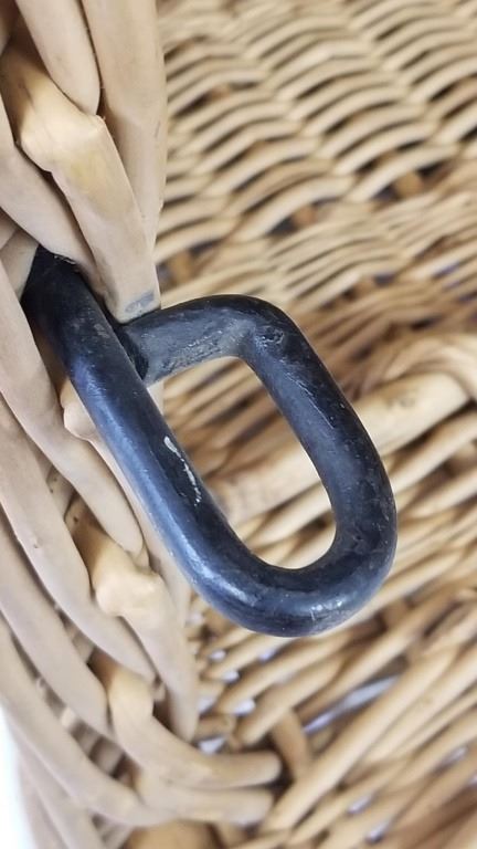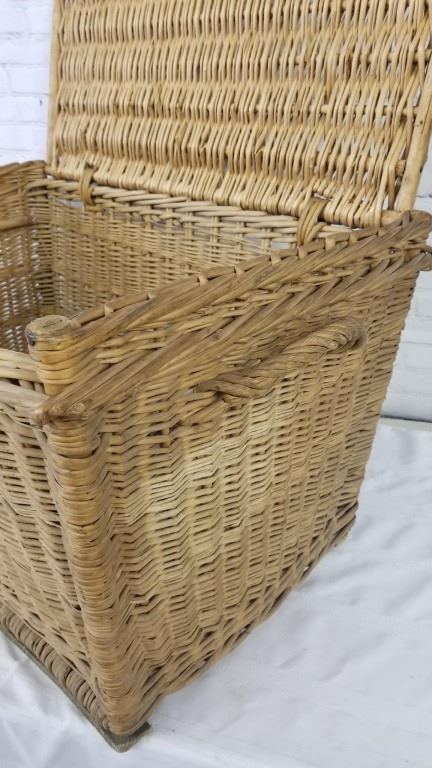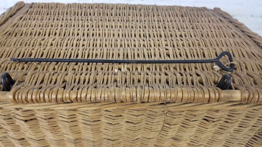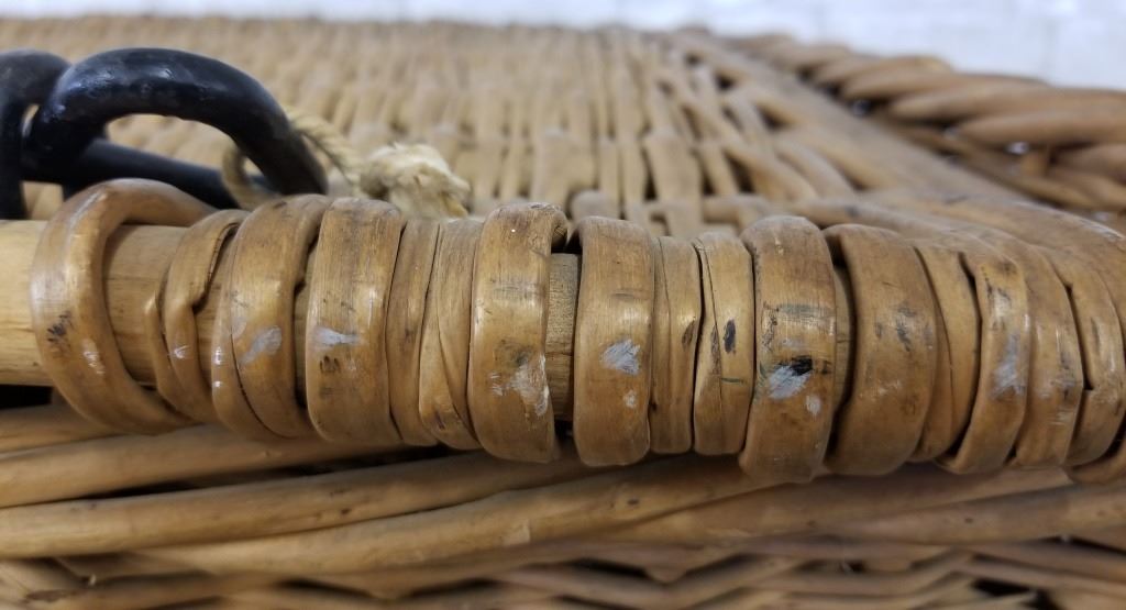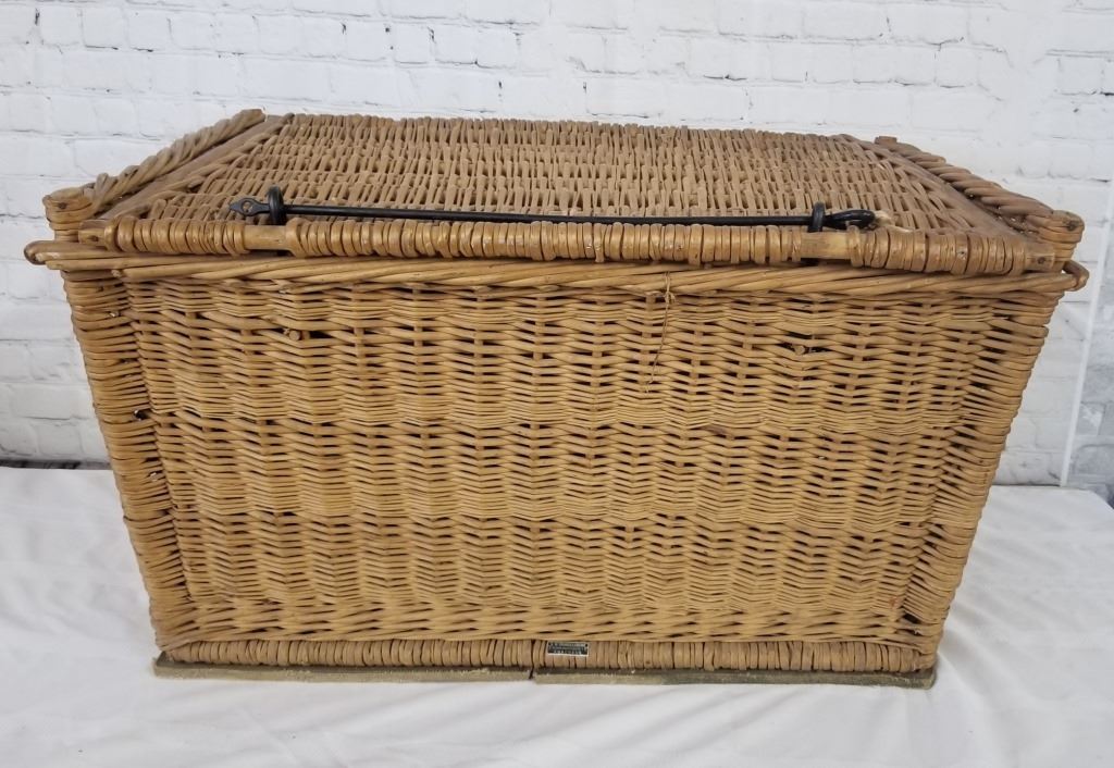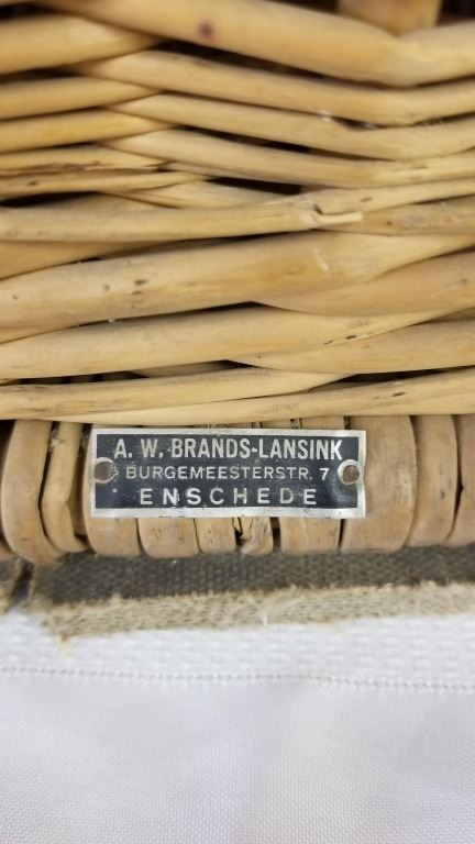 Stunning!! Made entirely of woven wicker, with a cast-iron bar to allow the chest to be locked, and strips of mat added to the top and bottom edges (likely to reduce wear). Maker's mark on the chest reads: "A W. BRANDS-LANSINK, BURGEMEESTERSTR. 7, ENSCHEDE", which pegs it as having been manufactured on or before the 1950s by the Lansik factory in the Netherlands. Approximately 32" x 22" x 18.5". On the cast
