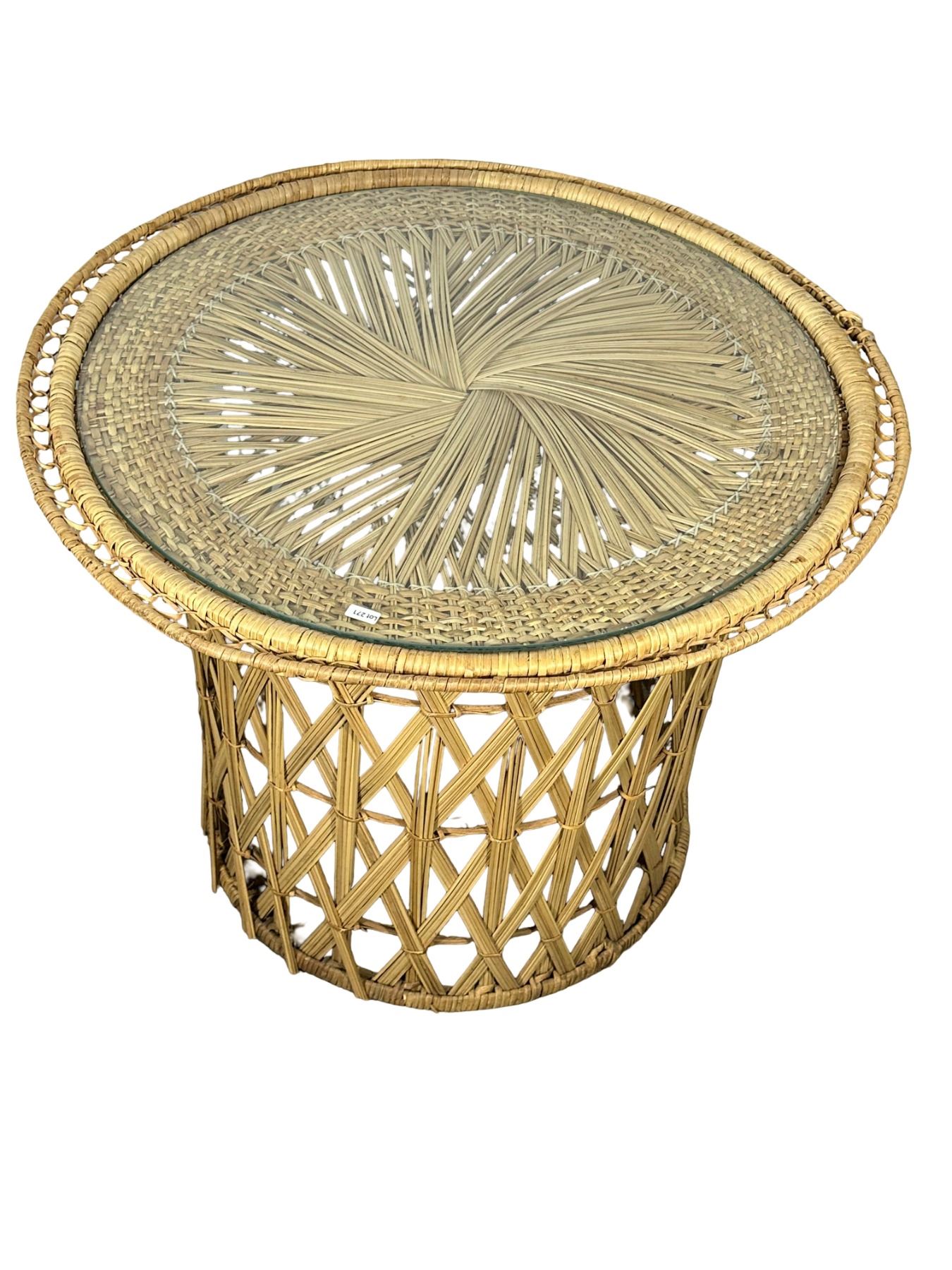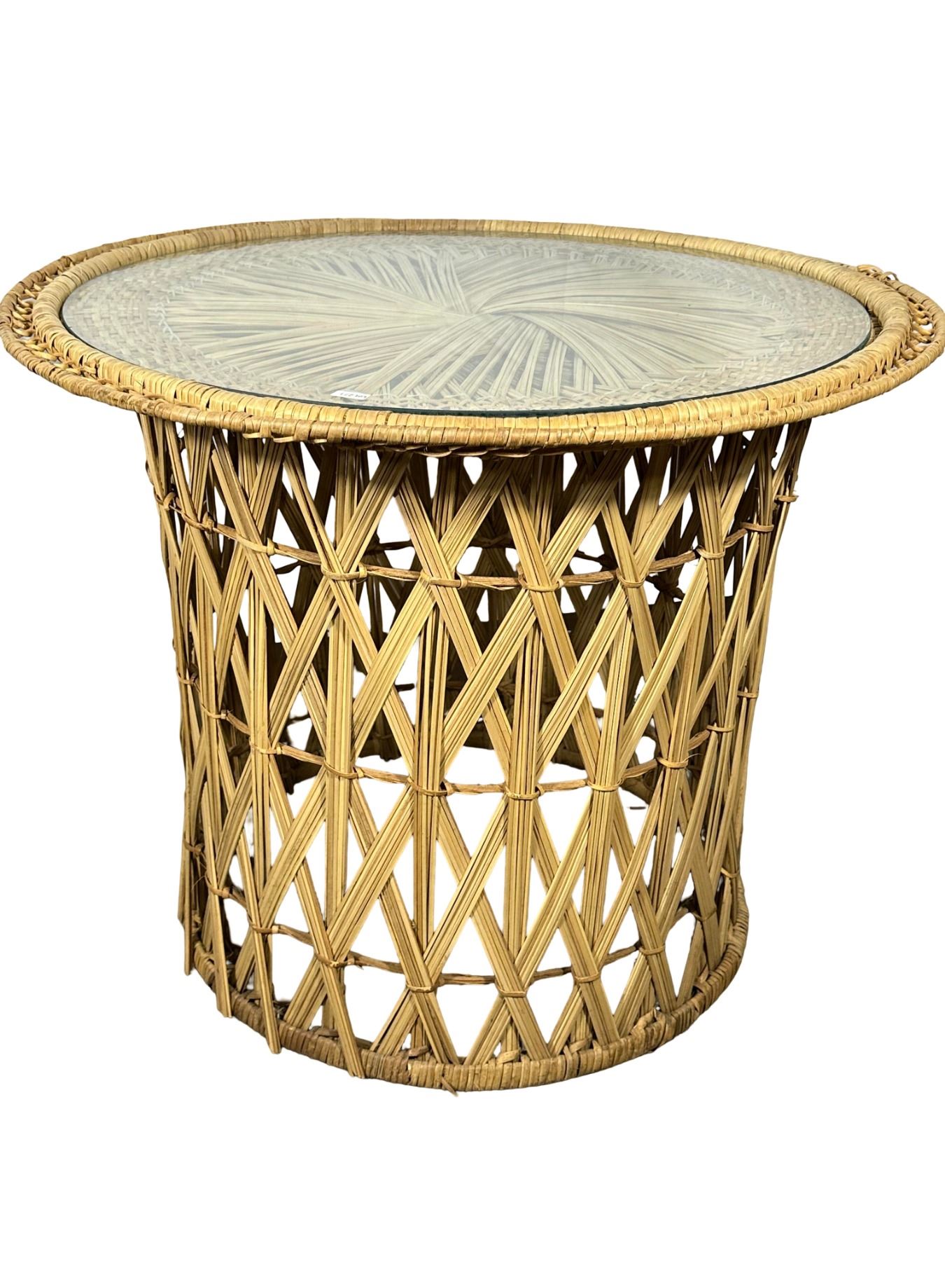 Circular wicker base with woven lattice pattern, topped with glass surface featuring a decorative palm-style woven design beneath. A stylish bohemian accent table.25"H x 30"W