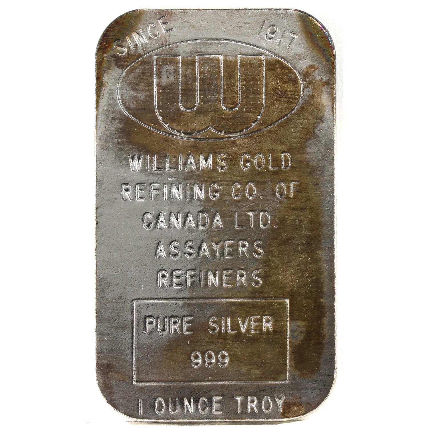 Vintage! Williams Gold Refining Co. of Canada Ltd. Assayers Refiners Since 1917 1oz Fine Silver Bar (Tax Exempt)