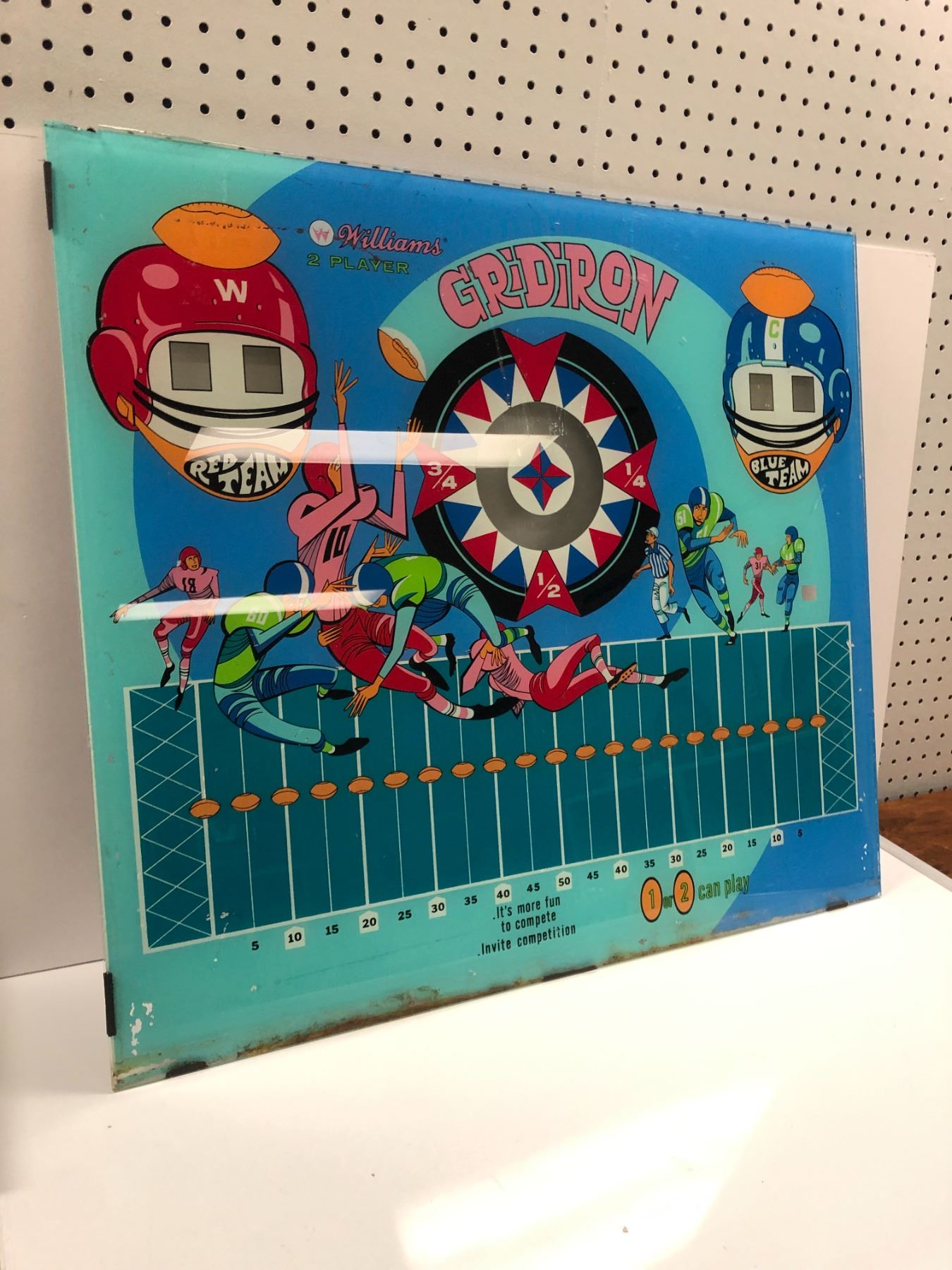 Vintage Williams "Gridiron" pinball machine back glass (one small chip top left corner) - 28 1/2in x 25 1/2in