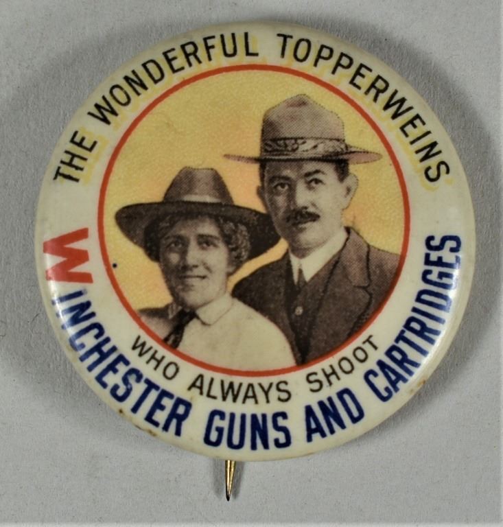 Advertising Celluloid Pinback for Winchester Guns and Cartridges. Depicting "The Wonderful Topperweins", exhibition shooters ca. 1951. Made by Whitehead & Hoag Co. Badges, Novelties and Signs, Newark, NJ. Excellent condition. 1 1/4 inch diameter.