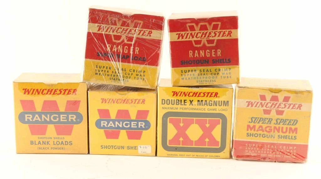 Includes (1) Winchester Ranger Shotgun Shells box (1) Winchester Ranger Super Trap Load Box, (1) Winchester Super Speed Magnum Shotgun Shells Box, (1) Winchester Ranger Blank Loads Shotgun Shells Black Powder box, (1) Winchester Double X Magnum Box, (1) Winchester Ranger Shotgun Shells Box, and (1) Winchester Super Speed Magnum Shotgun Shells. All boxes are empty.