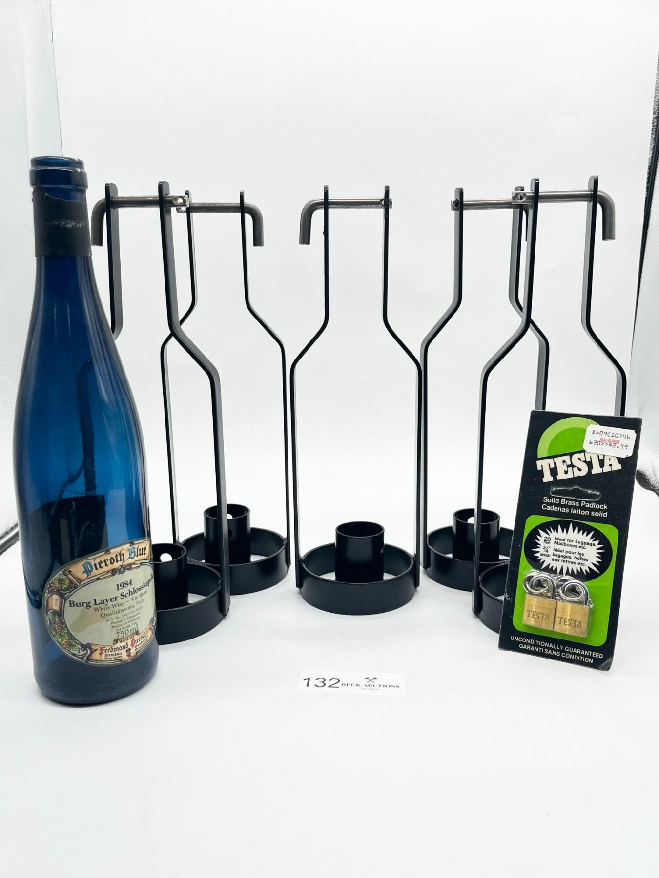 Five bottle holders with two locks, and one vintage wine bottle from 1984.