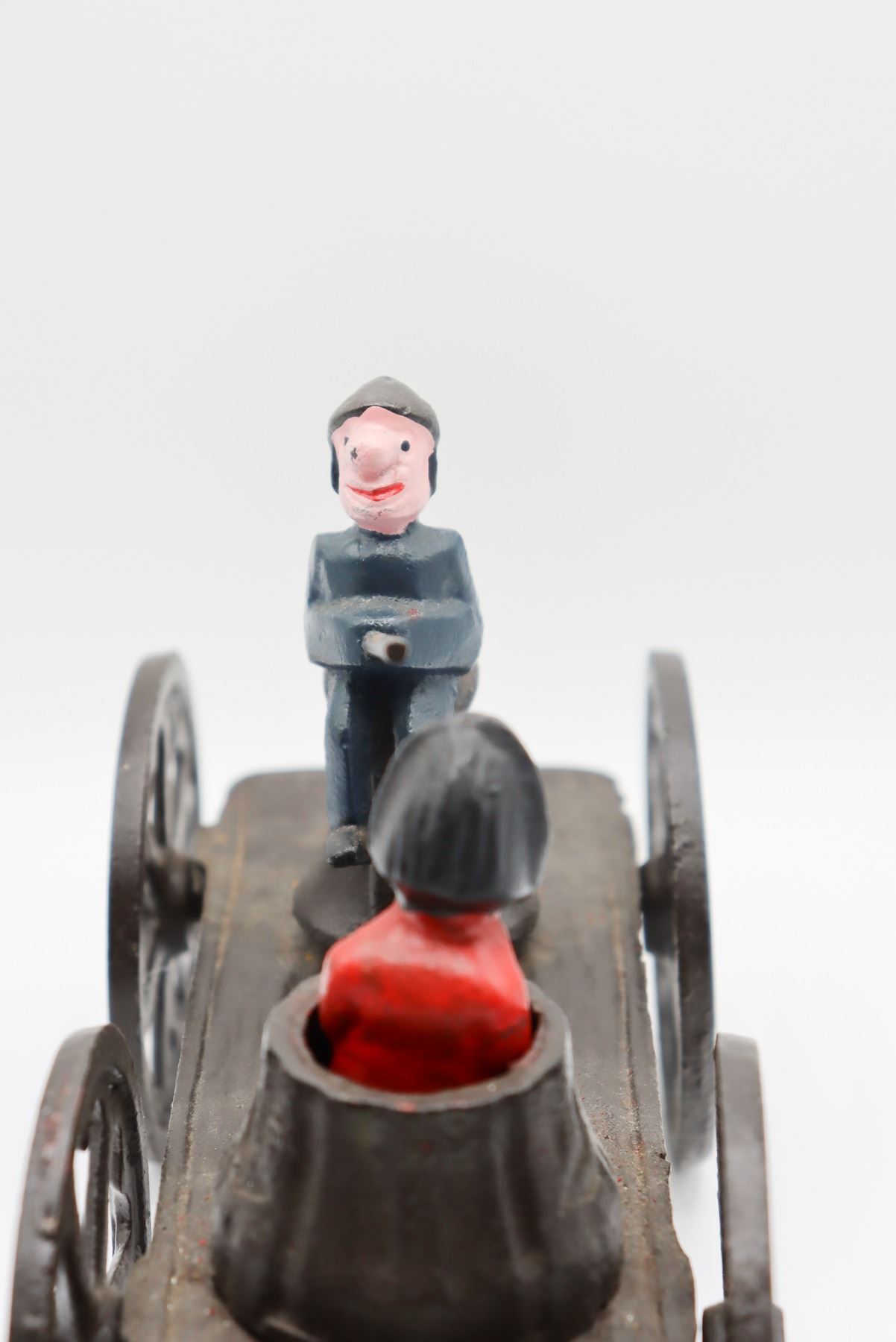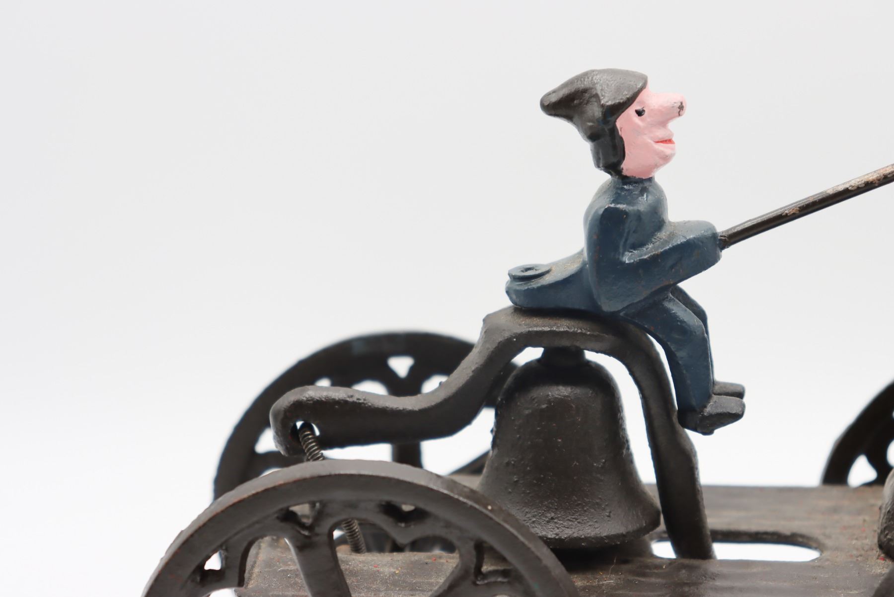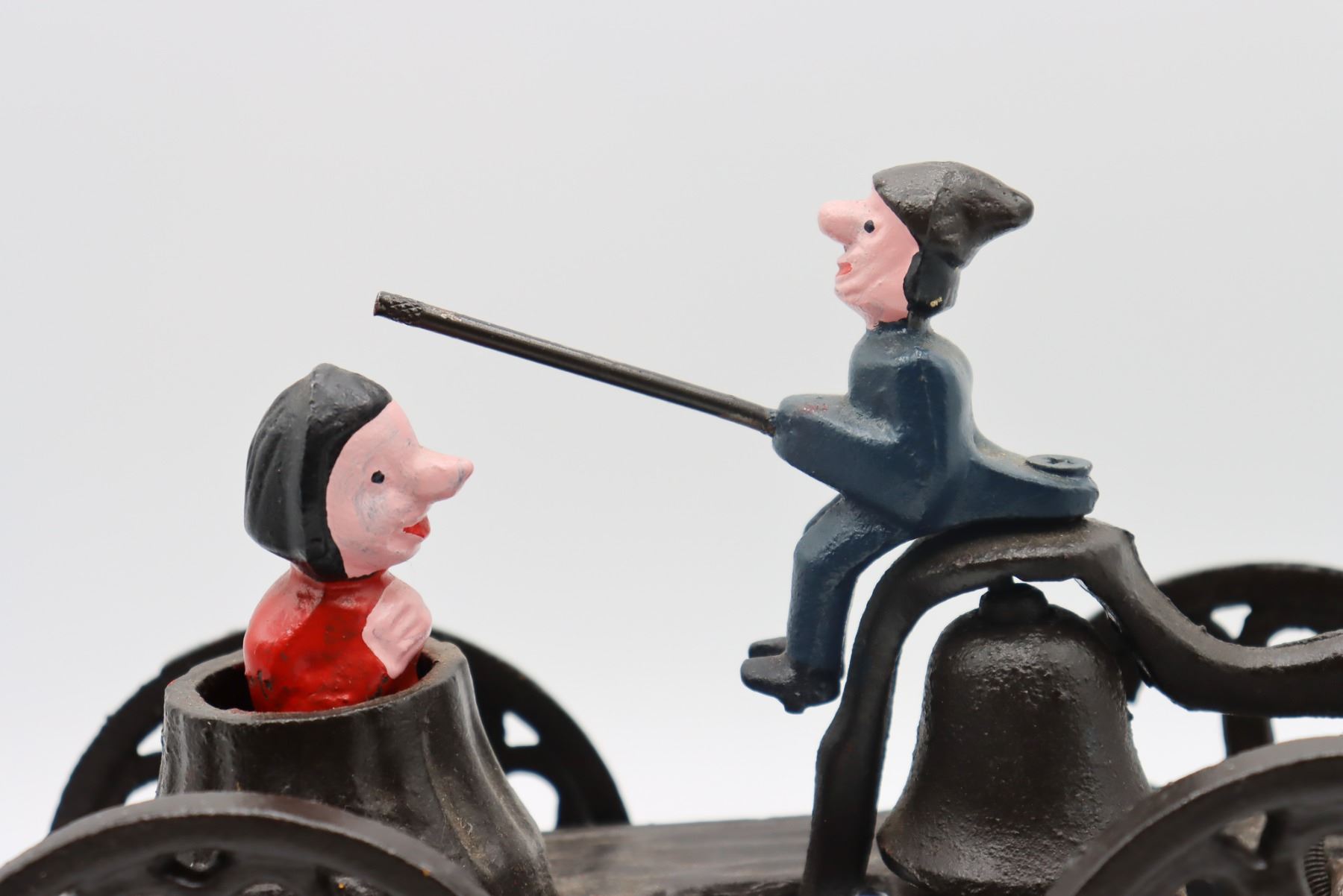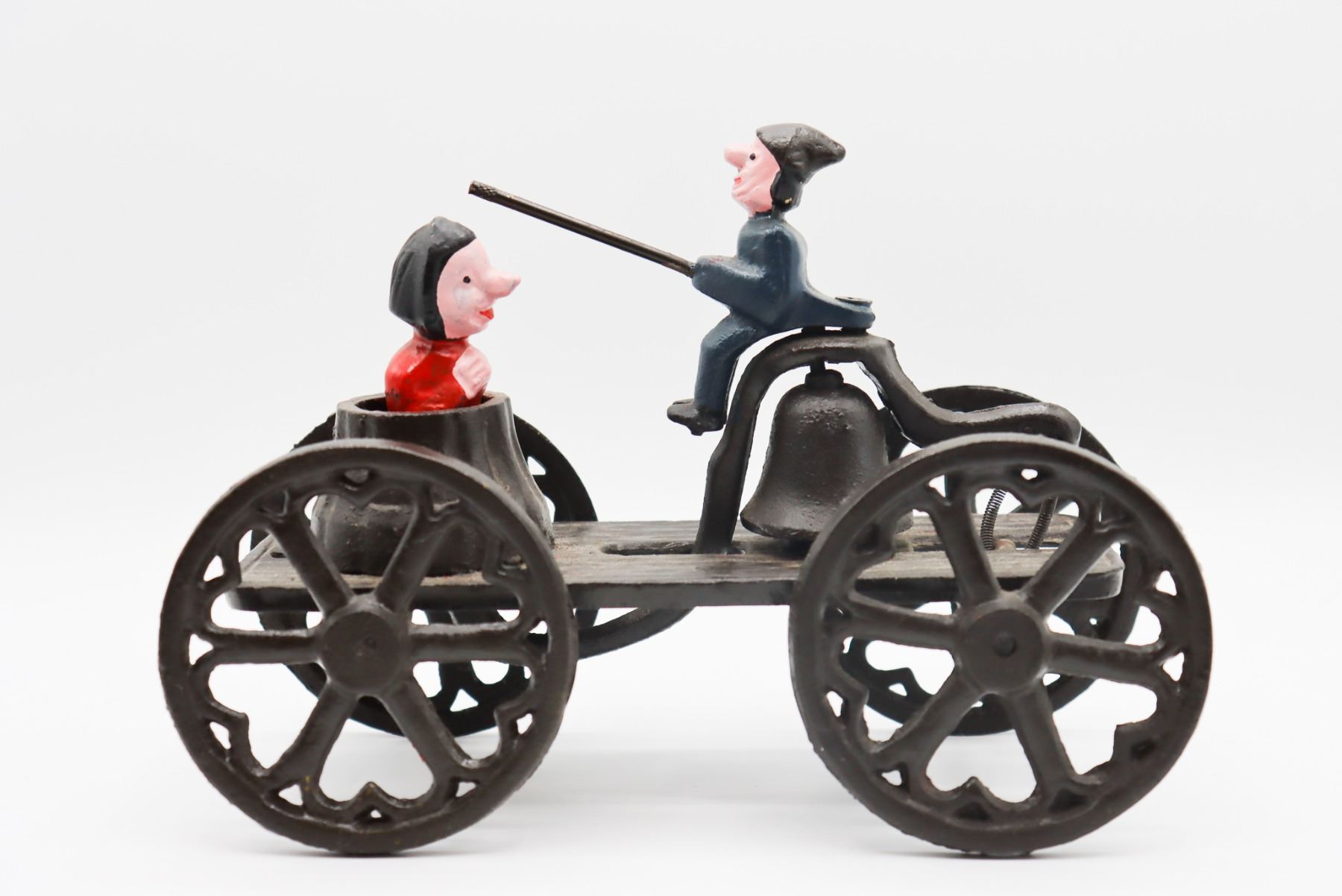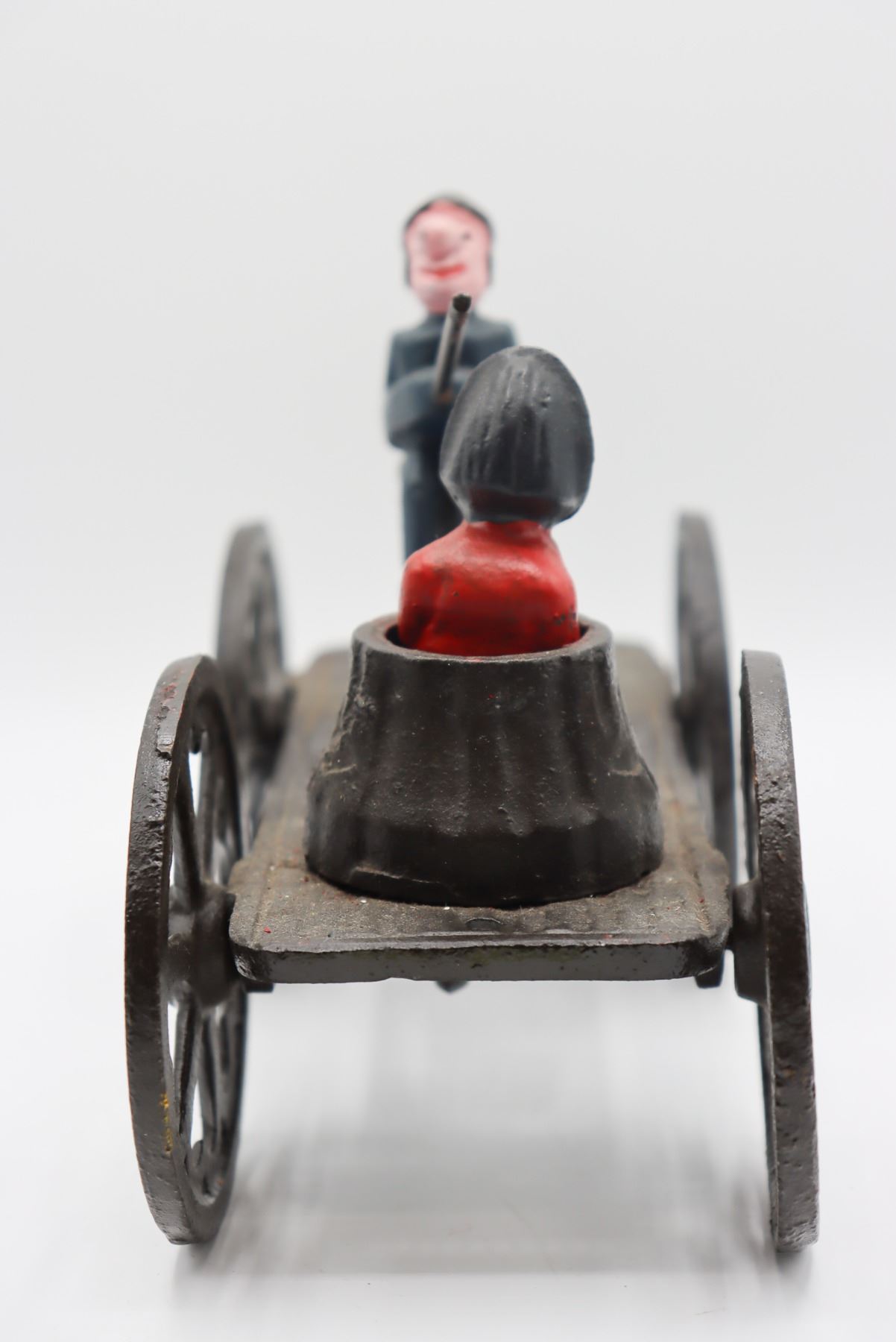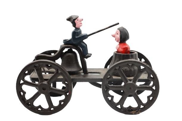 Unusual and unique reproduction toy cart, that of a witch being dunked by a man with a long stick . Likely made by the Kenton Toy Manufacturing Company of Kenton, Ohio, which created close to ten thousand cast iron toy designs. At one time it was the largest iron toy factory in the world. Size: 6 x 8 1/2 x 4 in.