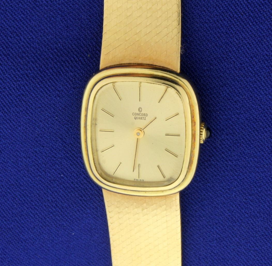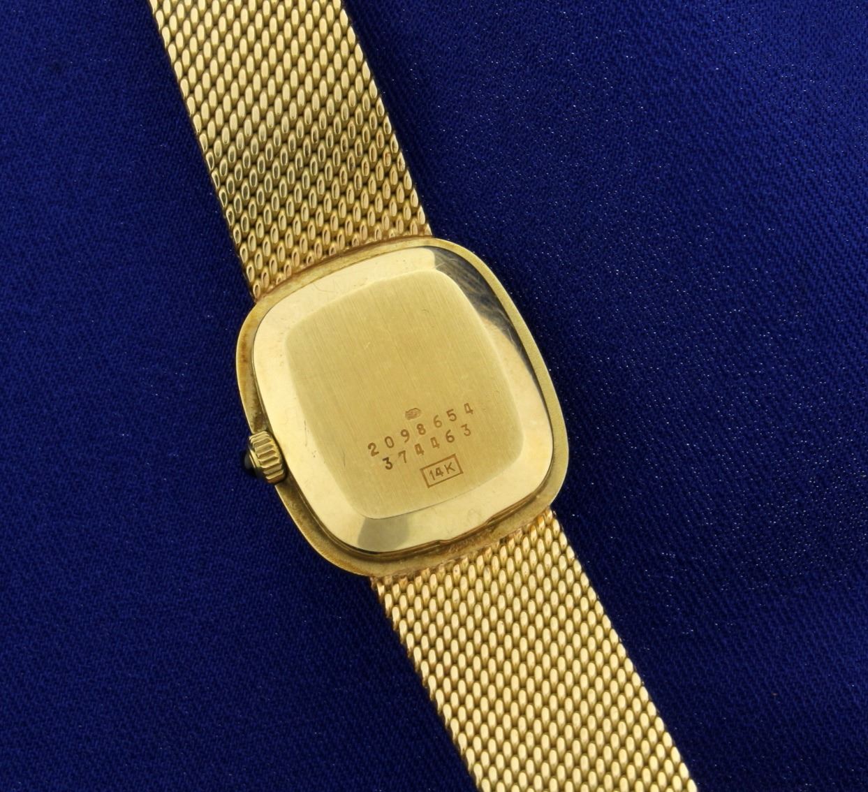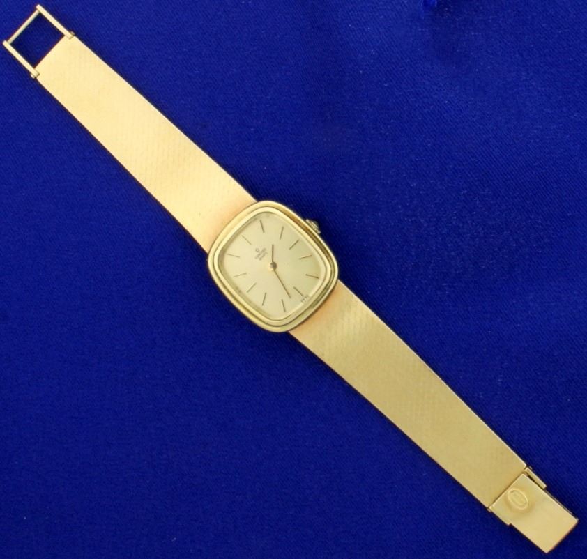 In 14k yellow gold. Watch is in excellent condition with no scratching on crystal and very minimal scratching on band and case. Quartz Swiss movement runs great with new battery. 6 1/4" long with a 2.5mm cabochon sapphire on crown. Solid 14k gold band and case. 45.6g