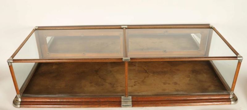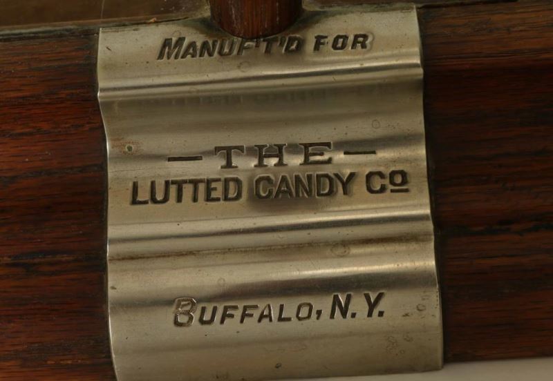 measures 72" W x 28" D x 16" H, flat backed with two sliding wood panels at rear. Labeled on front "Made for the Lutted Candy Co, Buffalo NY".
