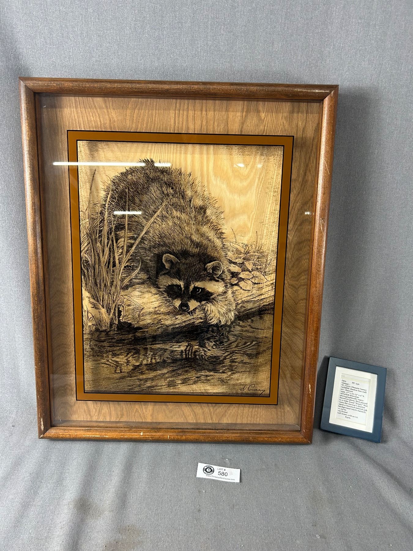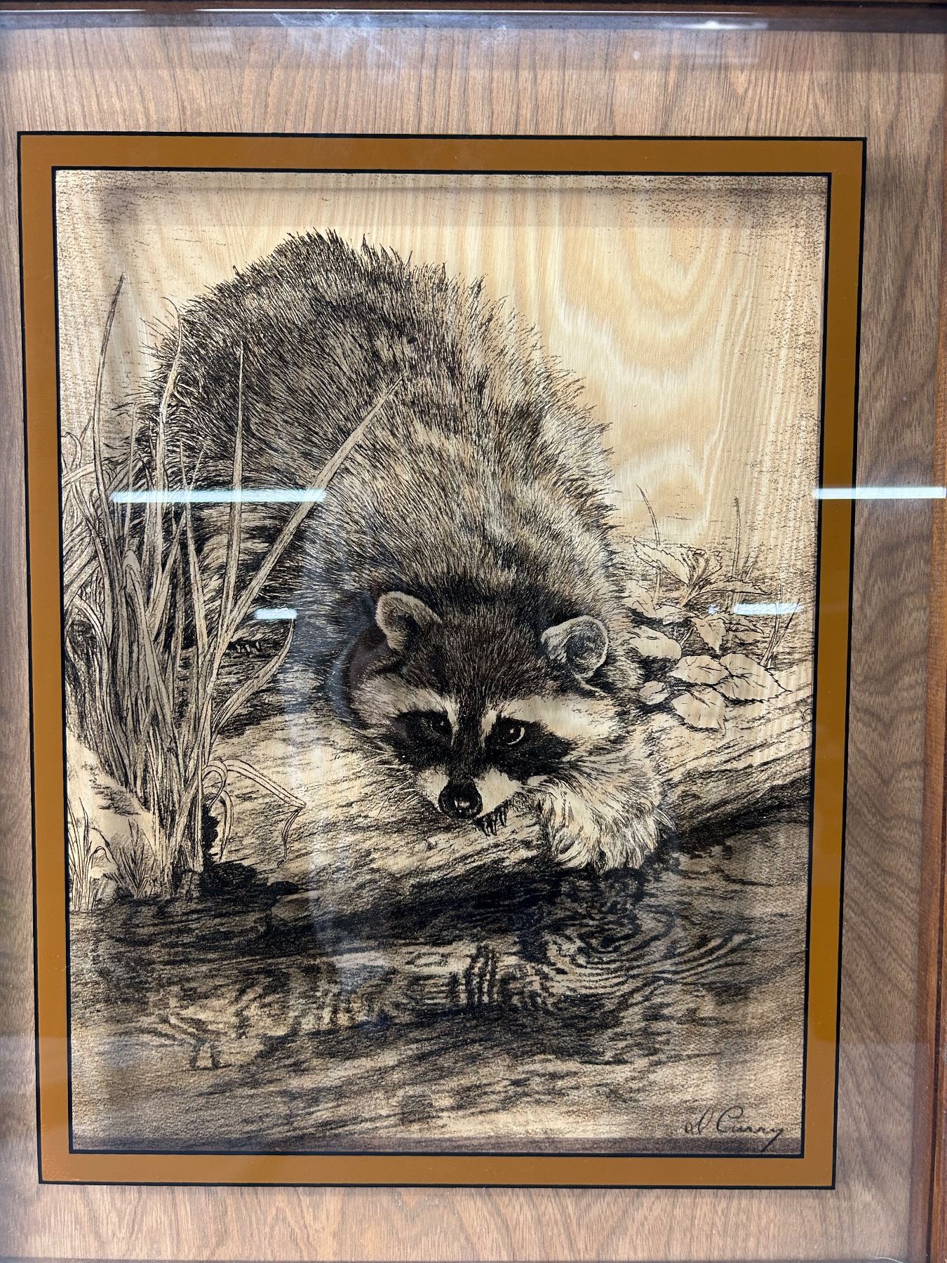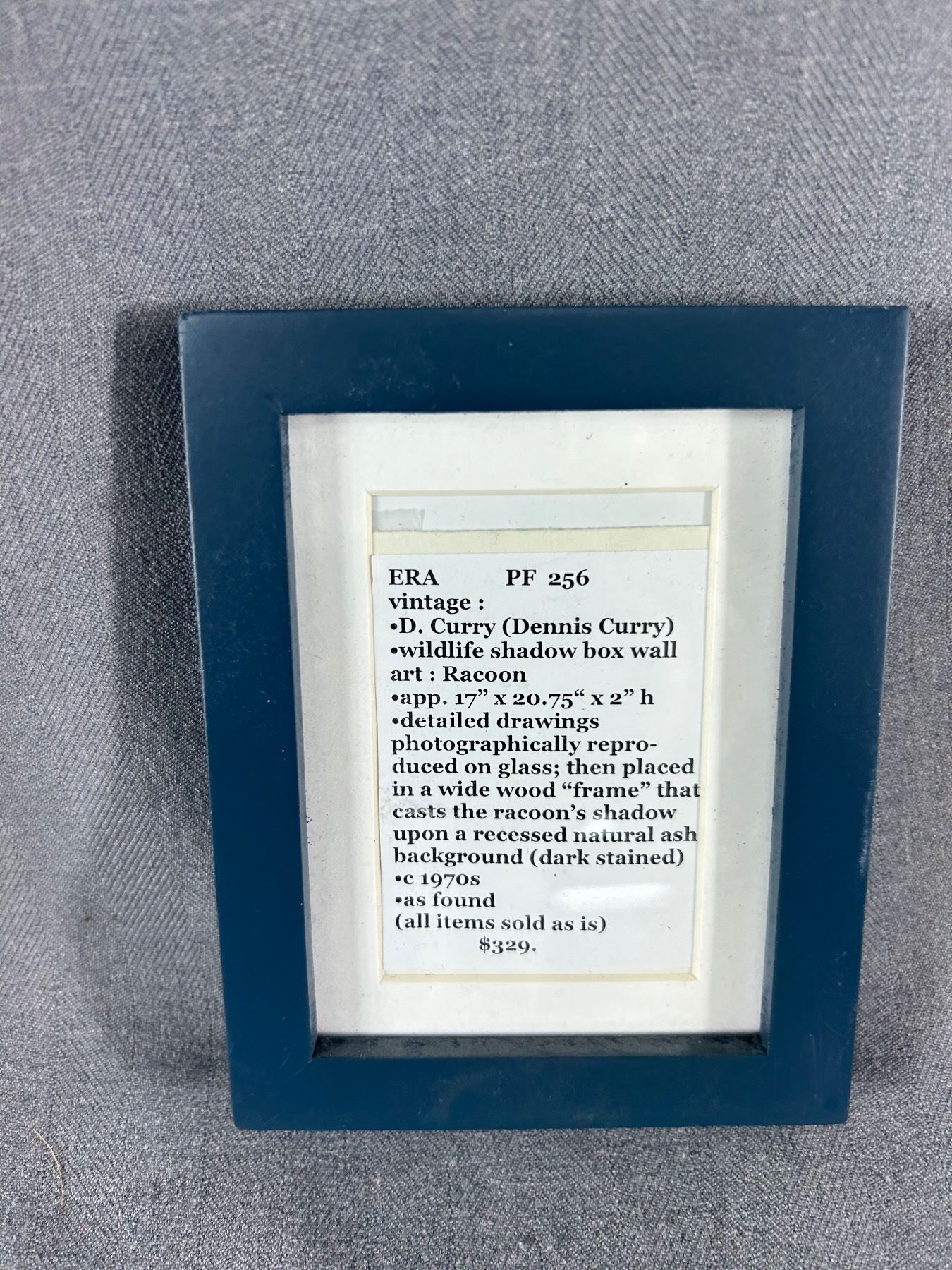 Vintage Wood Framed Shadow Box Floating Glass Raccoon Drawing By Dennis Curry. Approx. 20" x 20 3/4" x 2