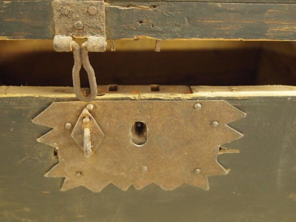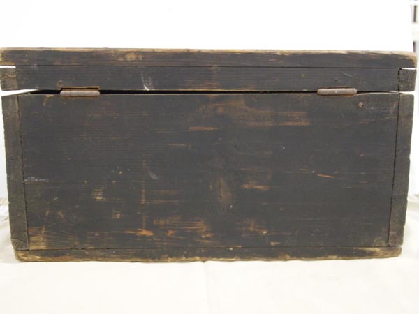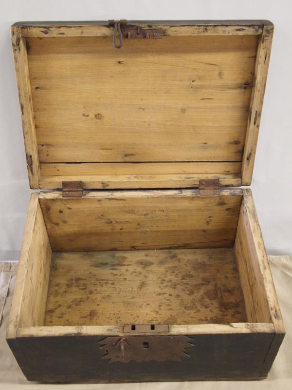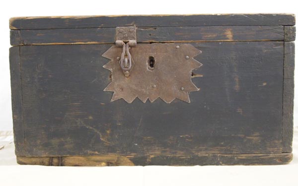 Vintage Wood Storage Box from Lithuania. Metal plate around lock opening. Also a hinged lock has been added. Measures 17''Lx12''Dx9.5''H. Buyers pay actual shipping and handling charges (see terms and conditions for more information).