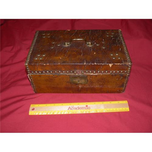 This great old wooden box has a leather covering and is studded on top and along the top sides. It has a great handle and metal clasp. The inside is rough as it has seen much use. The outside is the same, it is well used but in good condition. The bottom is wood without any covering. One side of the box has been covered differently as the leather does not quite match. It is a very nice historical box holding lots of old wonderful items I am sure.
