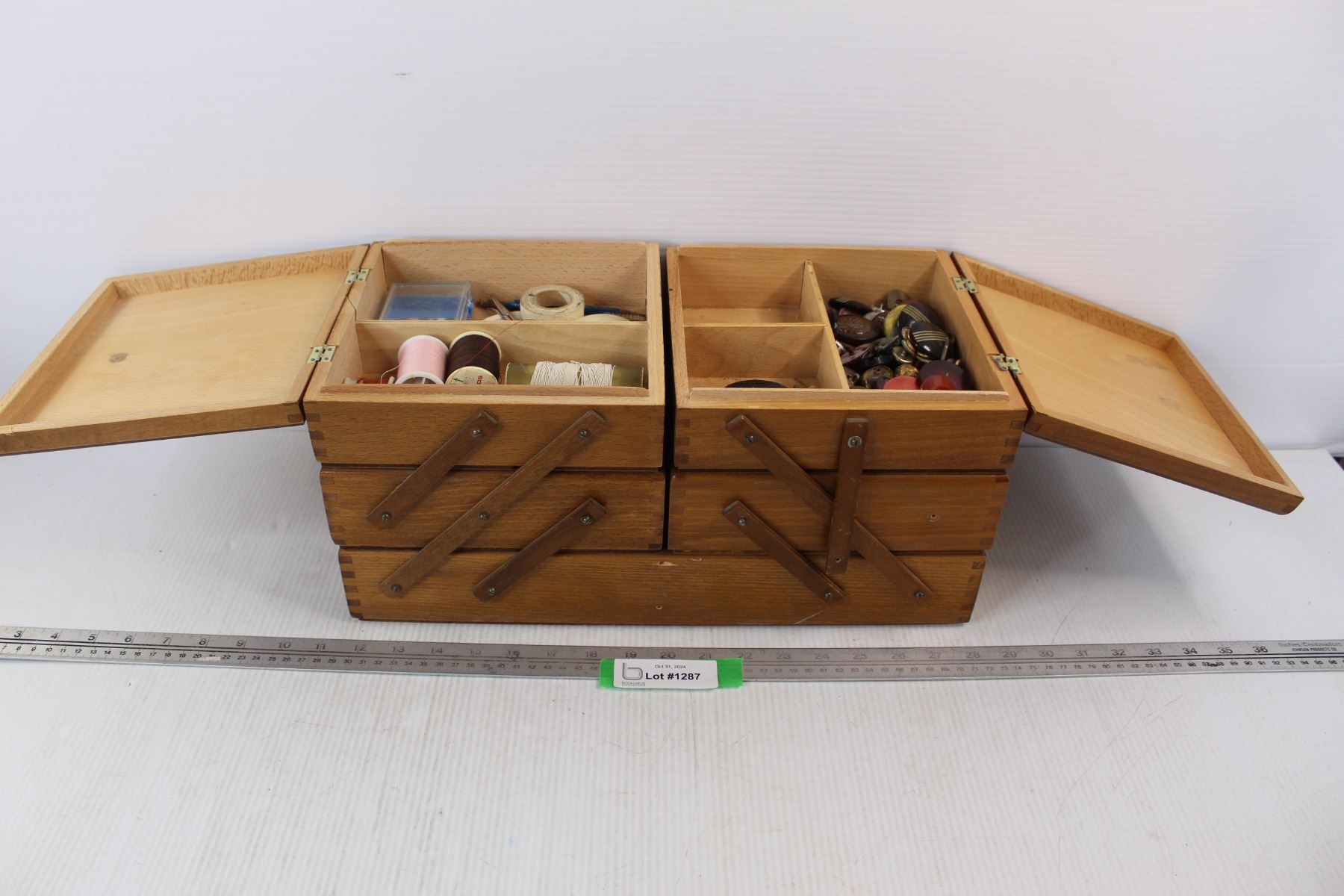 Vintage Wooden Accordion Sewing Kit, w/ Contents - Some Damage