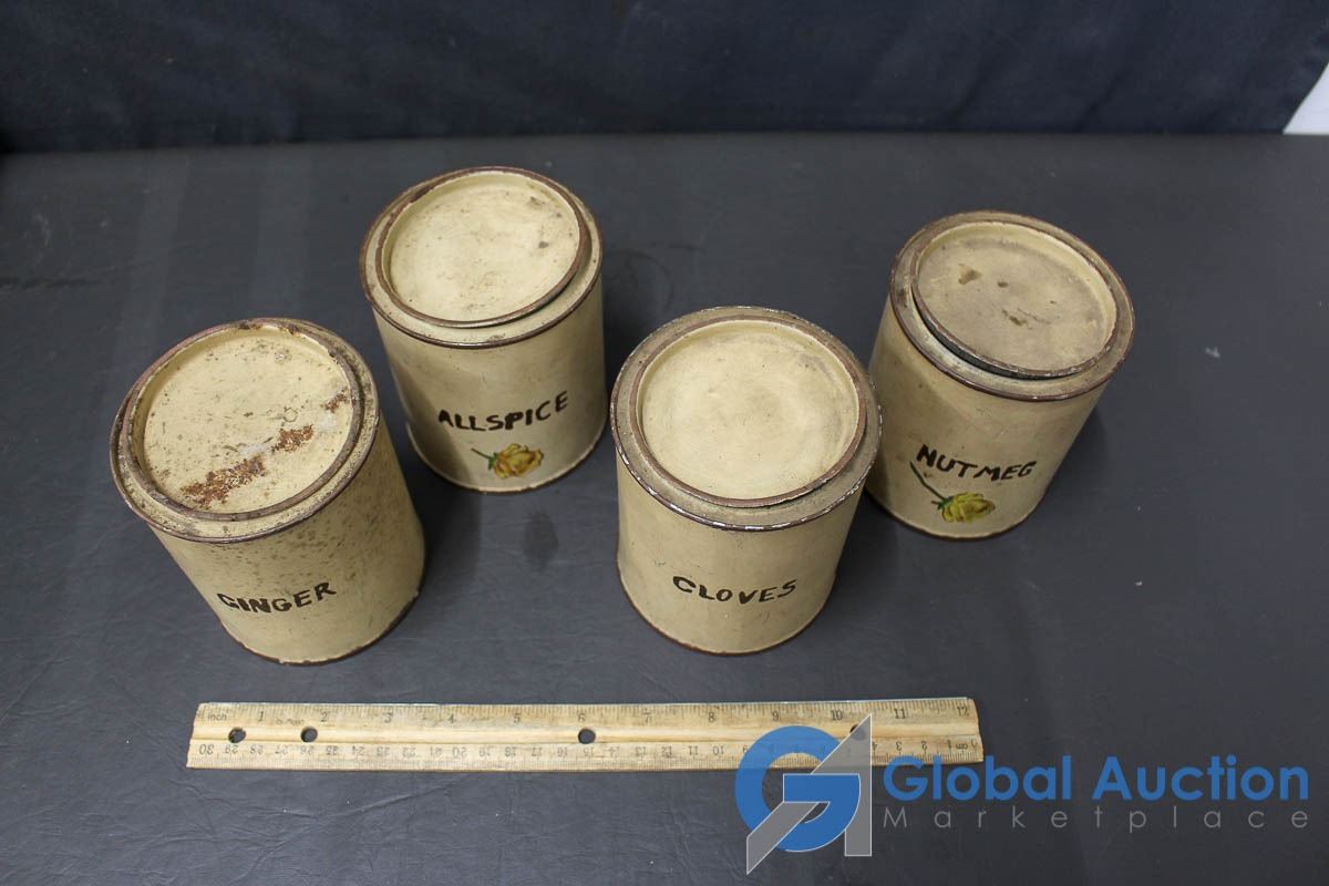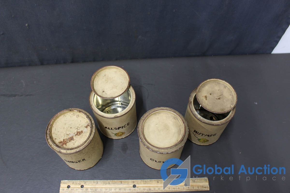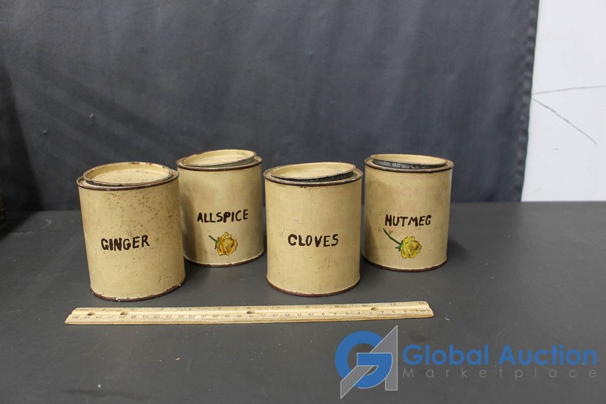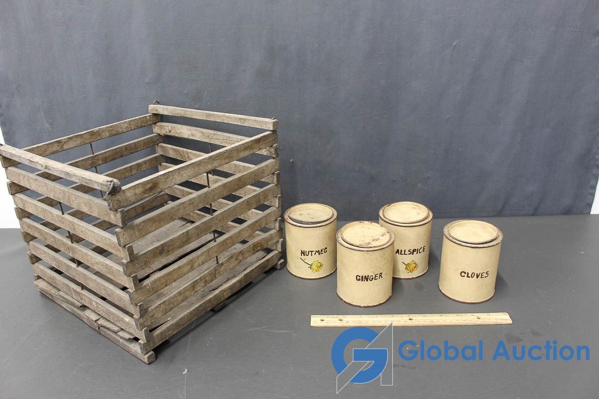 Vintage Wooden Crate With (4) Spices Tin Cans