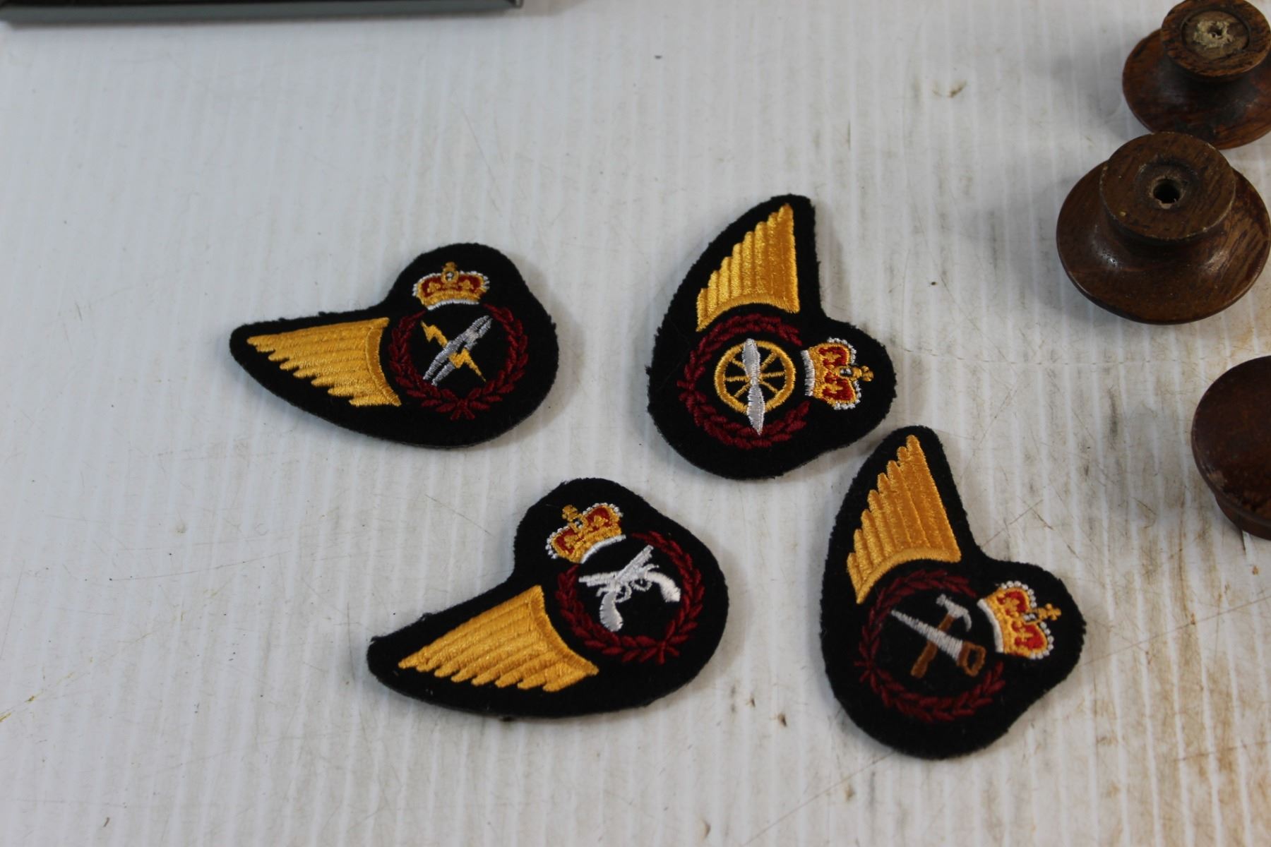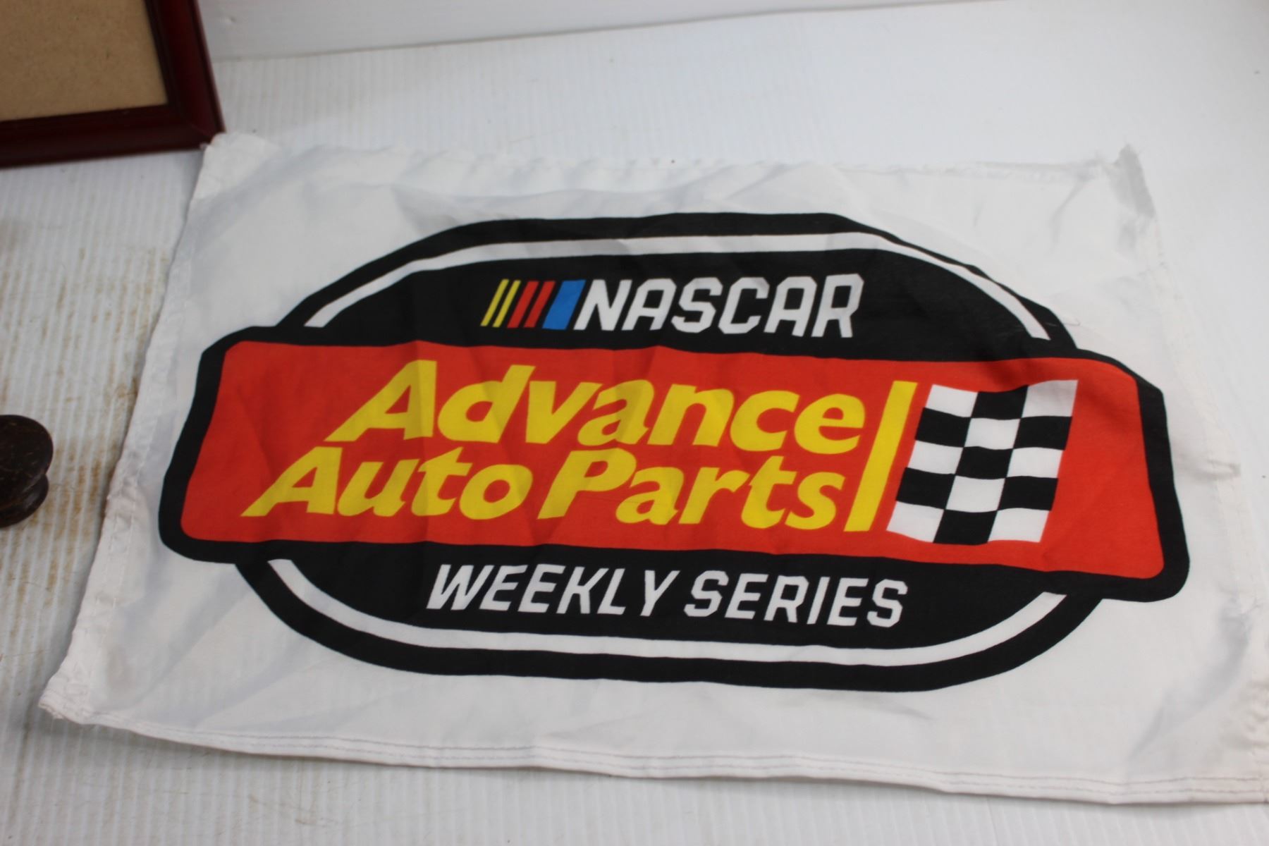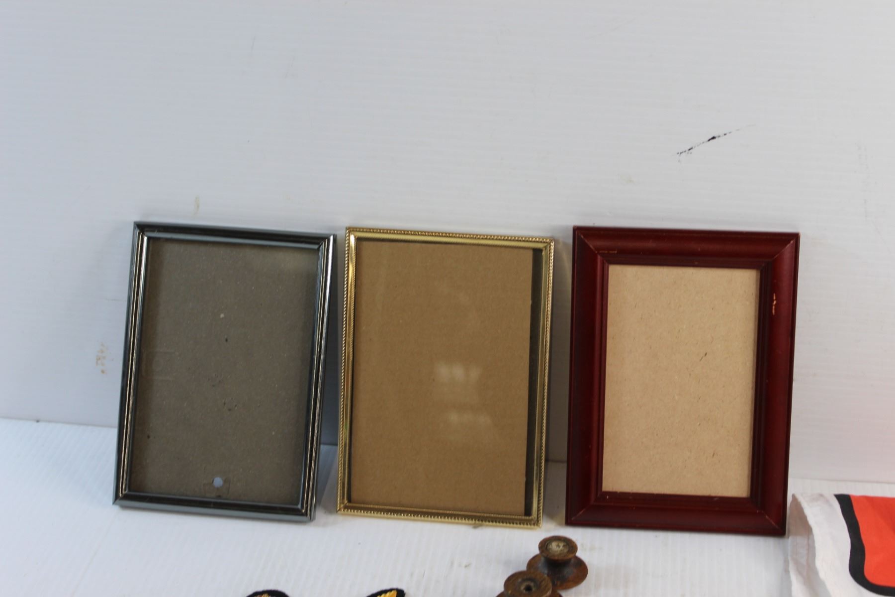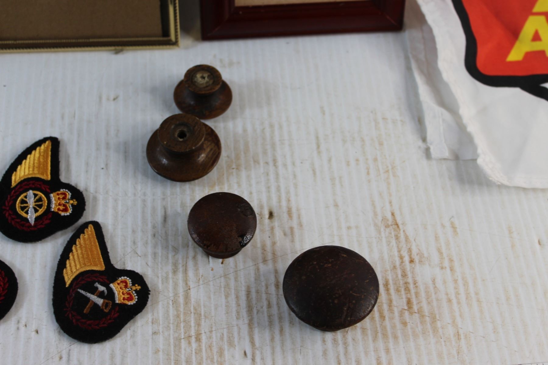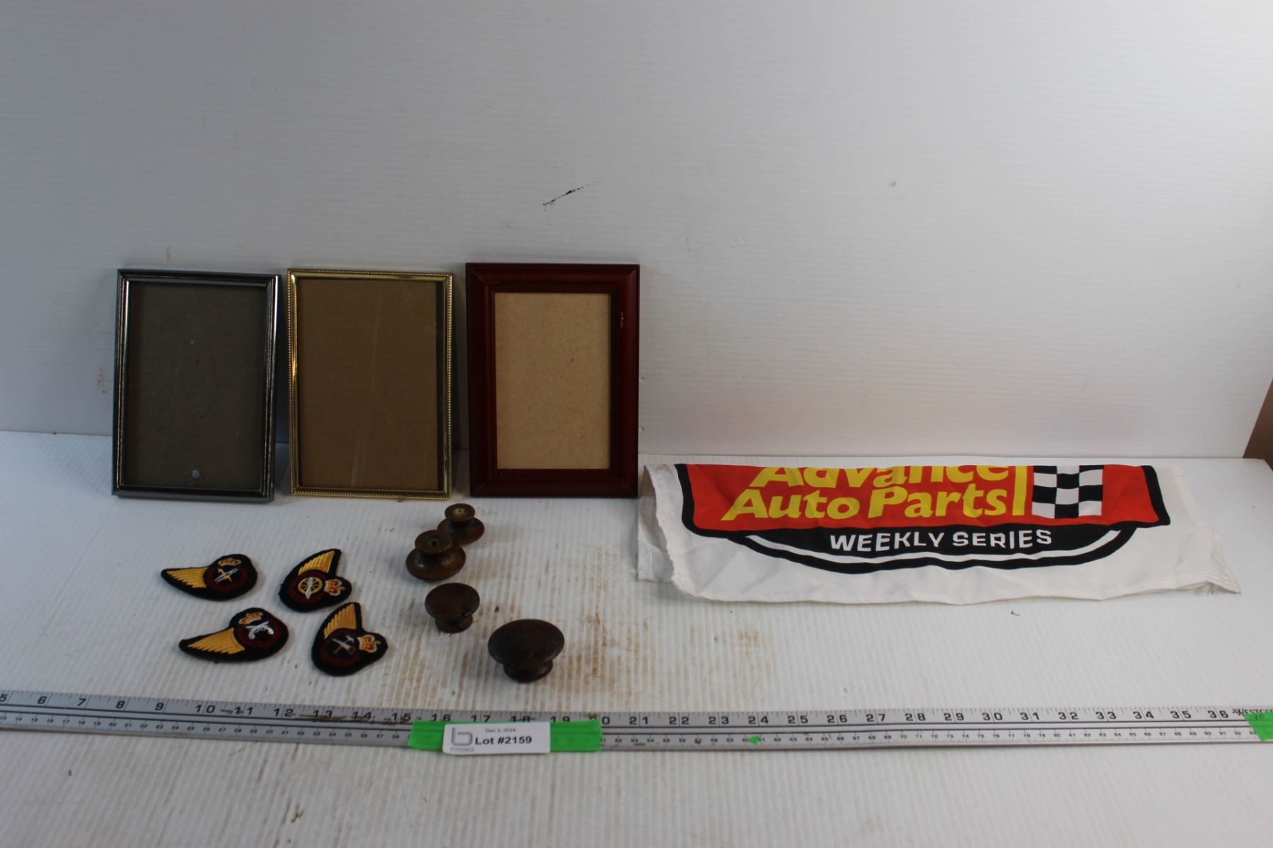Vintage Wooden Door Knobs, Canadian Army/Forces Trades Patches, Picture Frames 7'' x 5'' and Nascar Flag