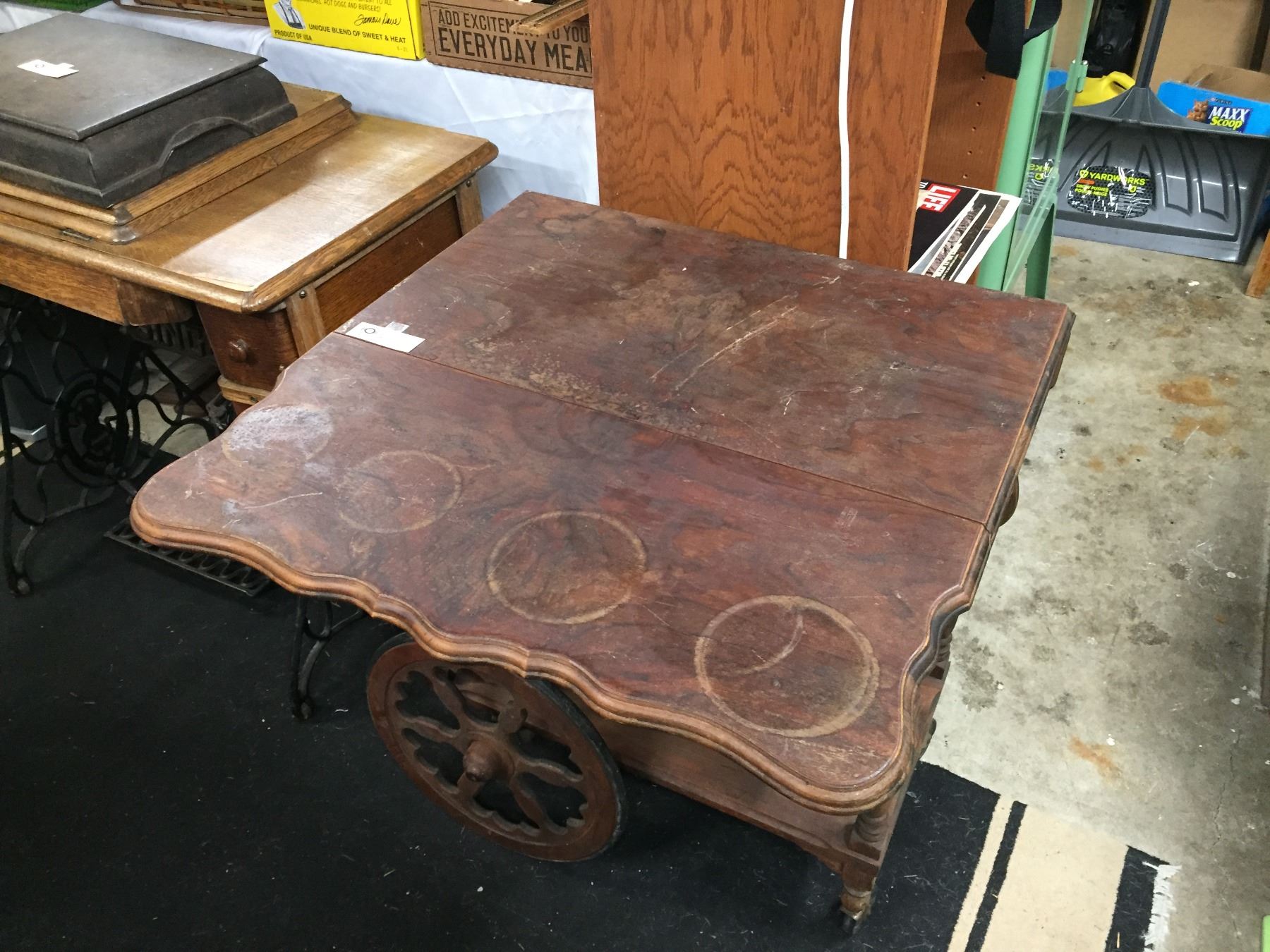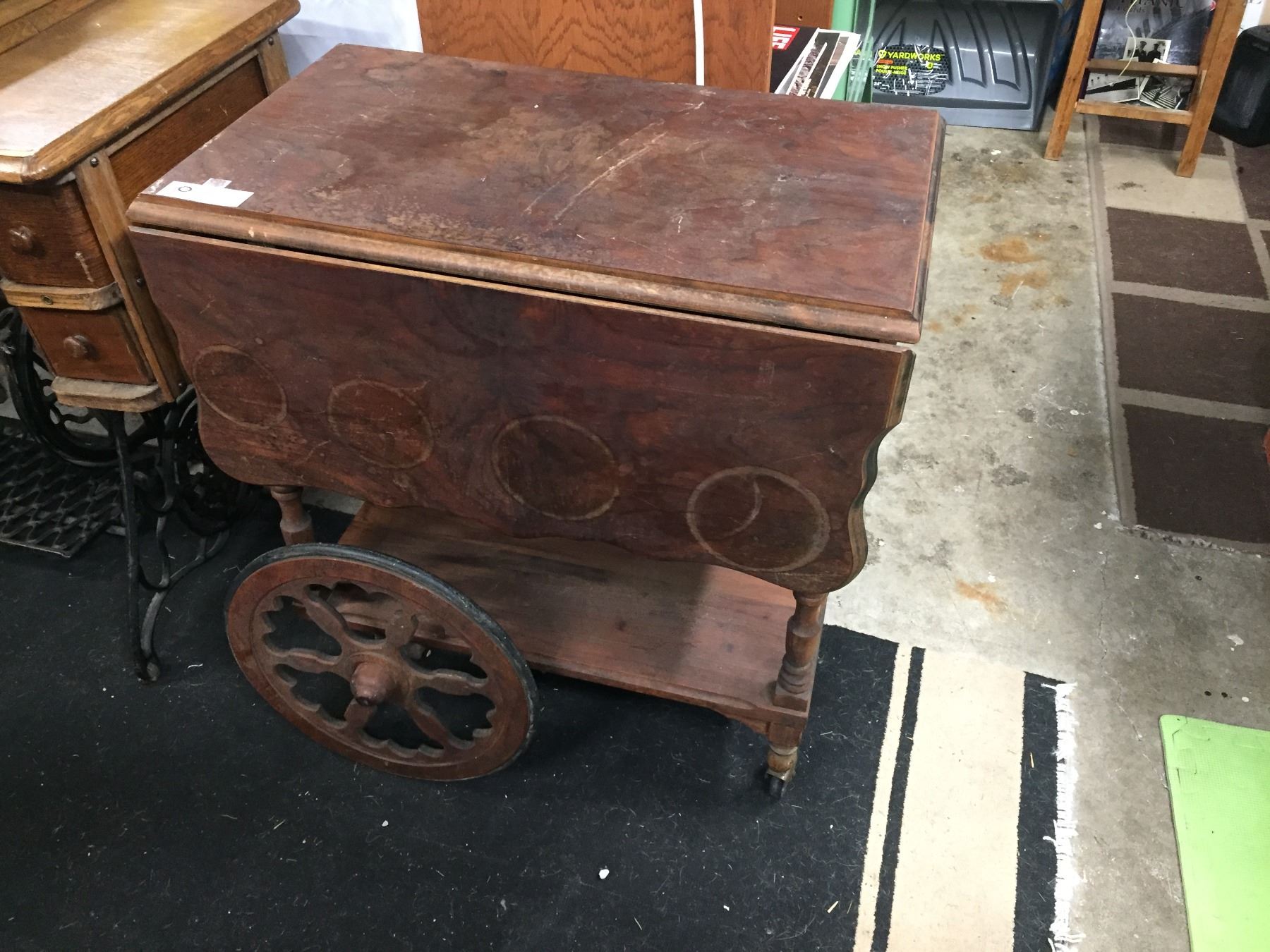 Vintage Wooden Trolley with Wooden Wheels. Has 2 Leaves that Fold Up to Make a Table. Very Nice No Shipping.