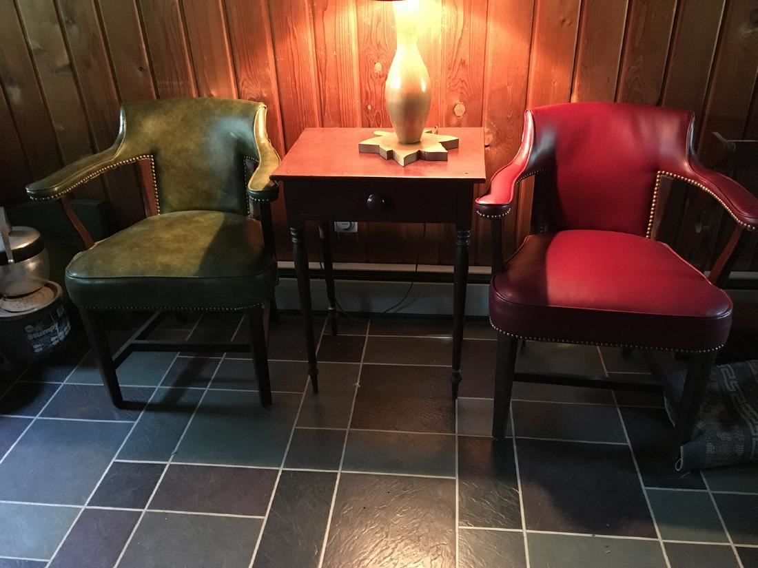 Vintage work table and 2 leather office chairs by Myrtle Chair Co., High Point North Carolina, one green and one red, both with brass rivets. Reportedly from the estate, was a gift from the U.S. Ambassador to Shanghai in the 1940-50's. (RL)