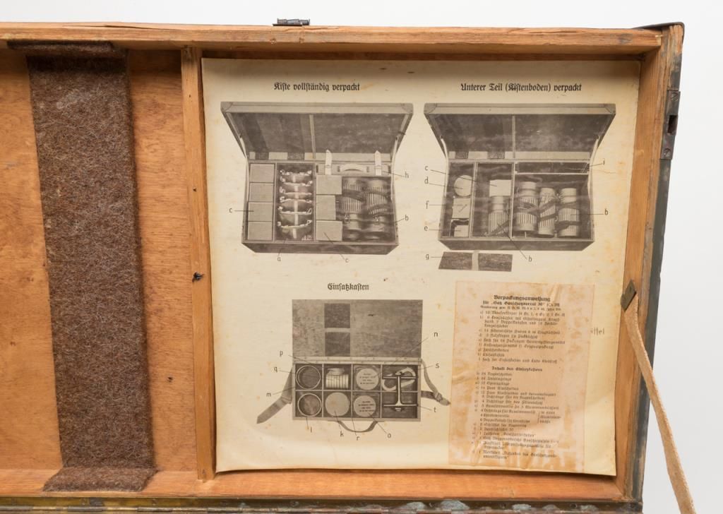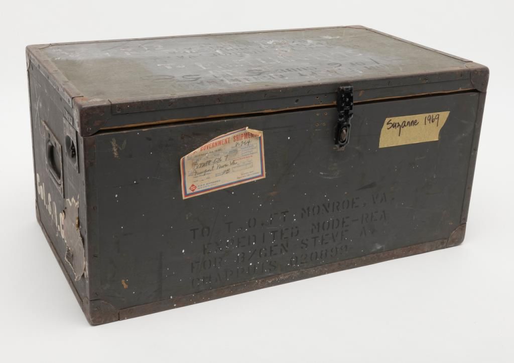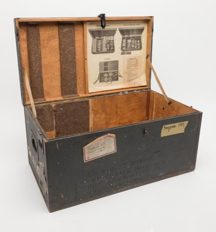 Vintage World War II field trunk belonging to Brigadier General Steve Chappuis. The field trunk is in overall good condition, measuring 28 ½” long, 16” wide and 14” deep. It bears numerous marks indicating shipment to Brig. GeneralChappuis at various locations including Fort Monroe, VA. The interior of the trunk is also in good condition and has instructions for packing what appear to be mess kits printed in German inside the lid. An interesting piece of World War II militaria that deserves further research. Est.: $75-$150