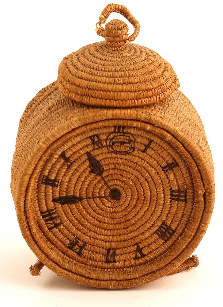Vintage Native American woven "Clock". Good condition, one of feet bent. Roman numerals and hands are embroidered. 6" x 4.25" x 2.5". Very unusual! Date: Location: HWAC # 52150