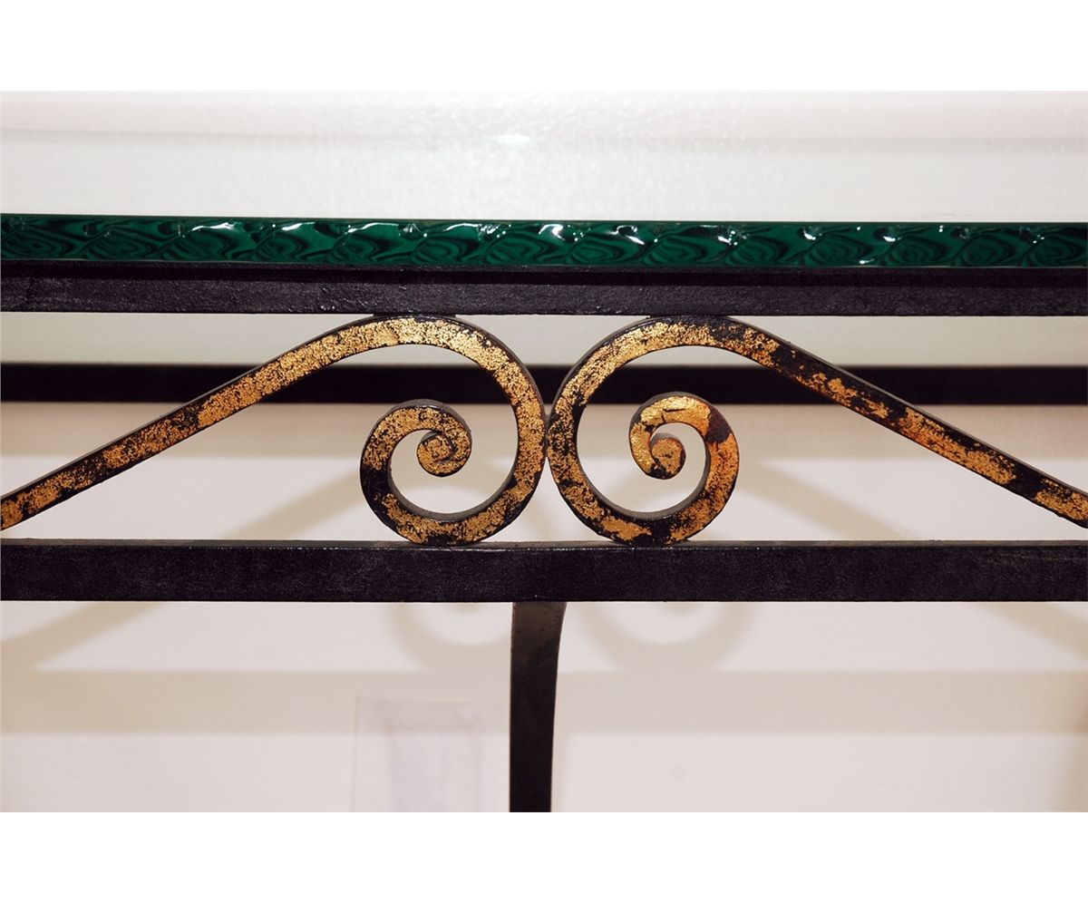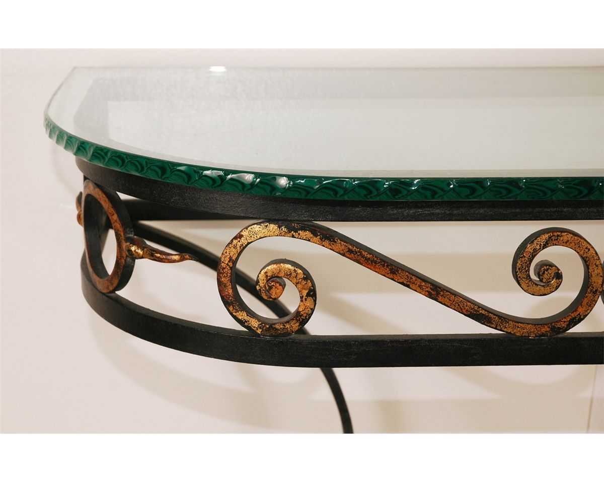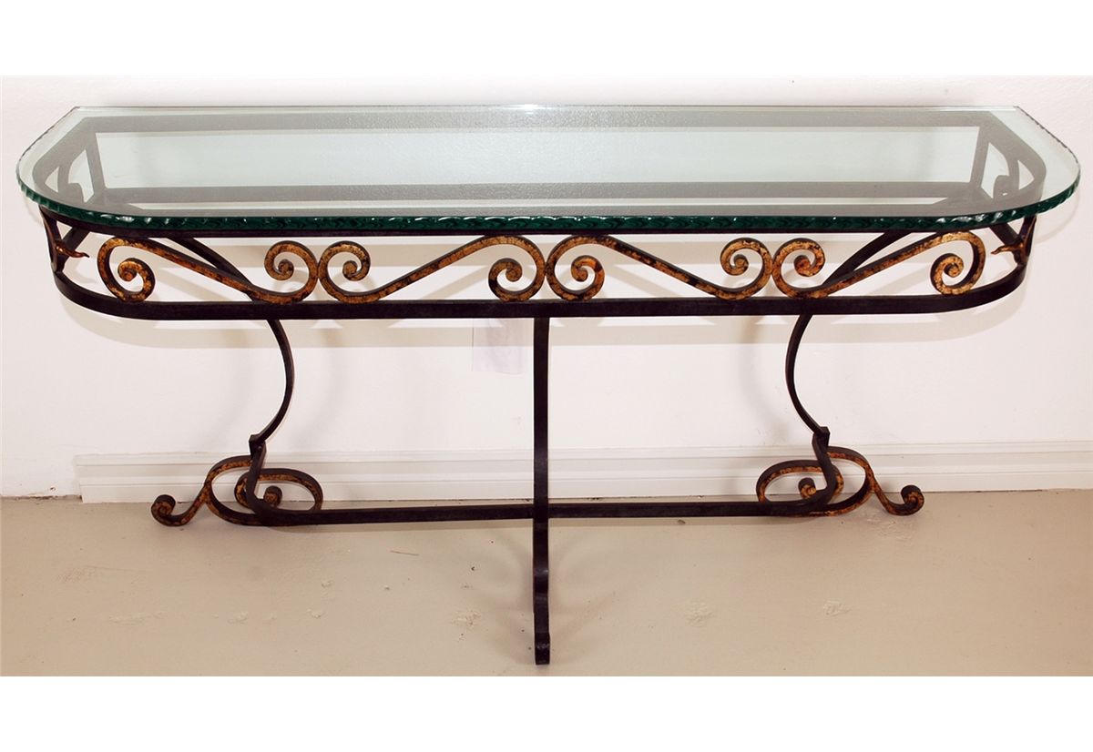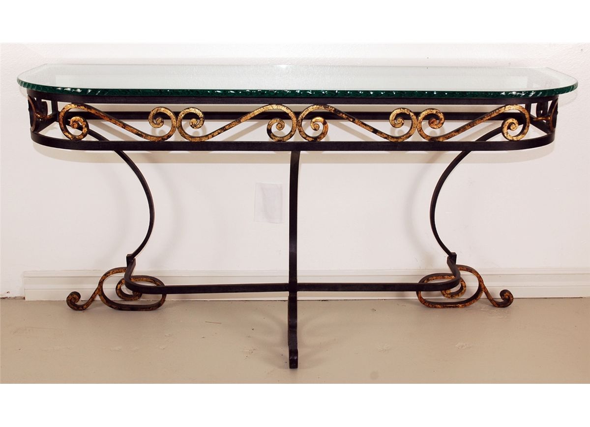 Vintage Wrought Iron Base / Glass top Console Table. Base has a black finish with antique gold accents. Glass top has a polished wave edge. Dimensions: 5'4" x 20" Glass top, base 33"H
