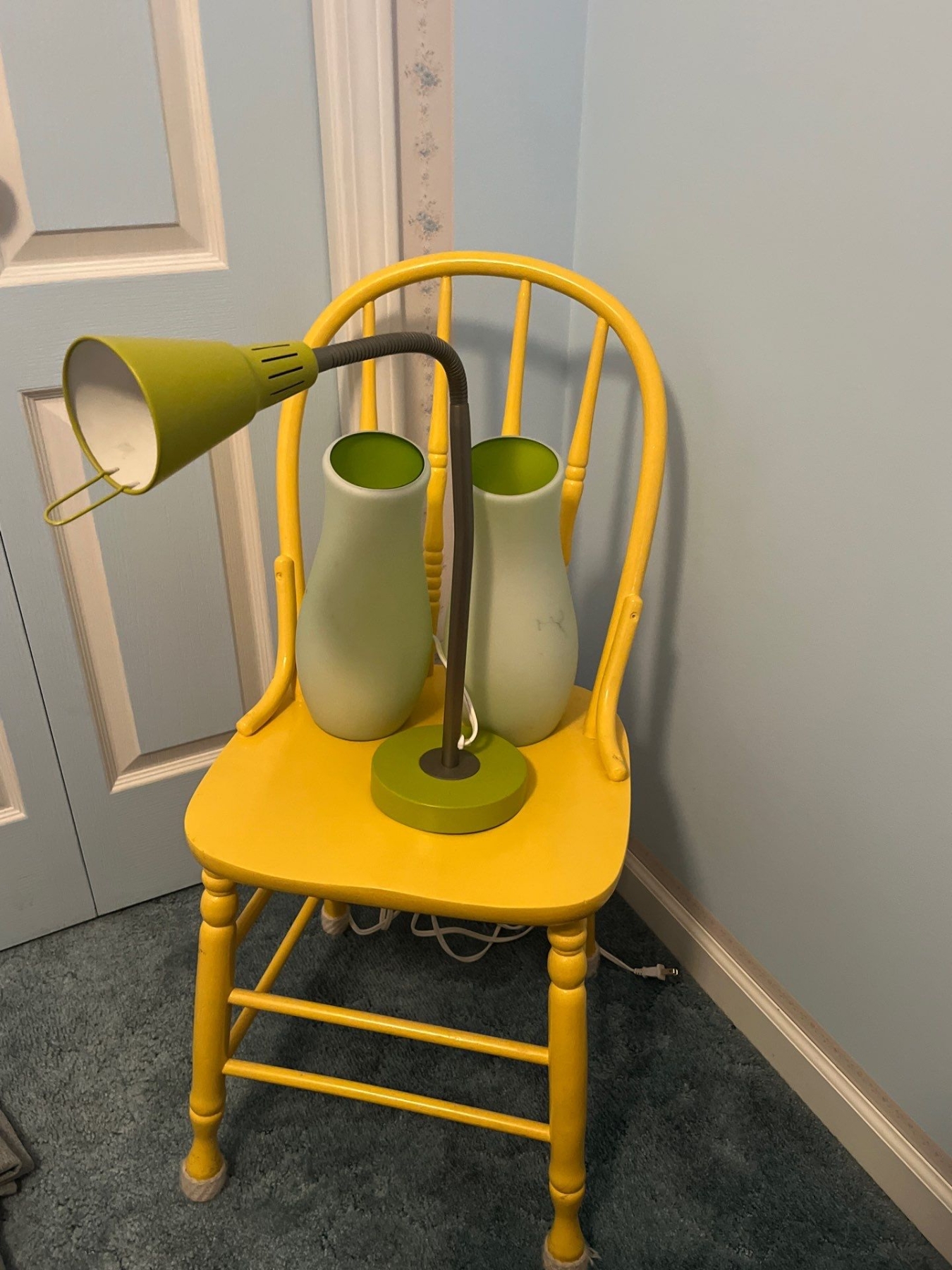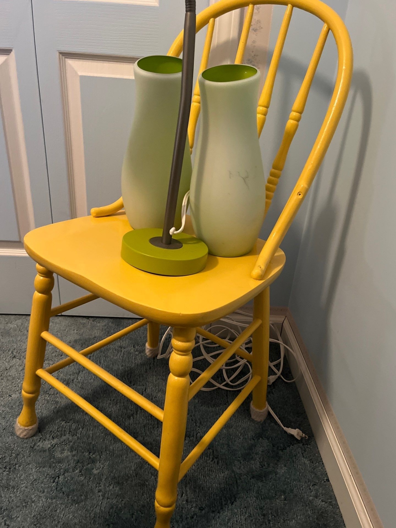 Vintage Yellow Chair with one pedestal light and 2 matching green side table lamps