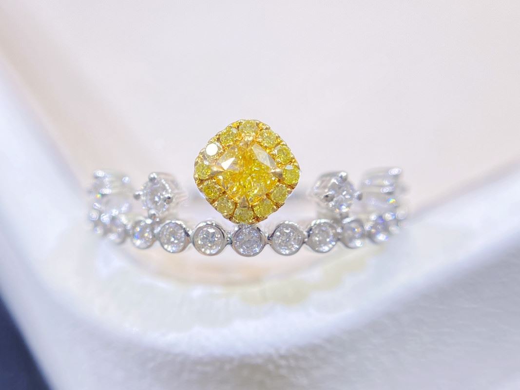 A brilliant yellow diamond crowns the center, surrounded by round white diamonds in a delicate crown-inspired design. The ring blends vintage charm with playful elegance and radiant sophistication.Ring size: 6, circumference: 52 mm, diameter: 16.6 mm, main stone: 0.136ct, side diamonds: 0.255ct. Note: Comes with an AGL certificate and a domestic jewelry identification certificate.