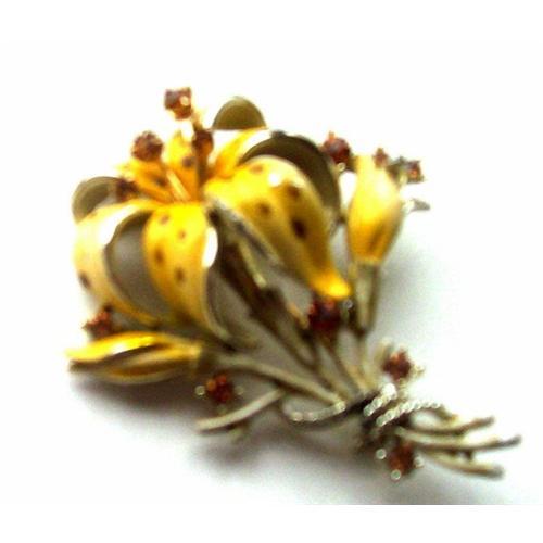 Stamens are set en tremblant with topaz colored rhinestones, accents of silver, green and gold paint on enamel. Safety clasp on back. 2" W x 2.5" L. Braided silver wire wrapped around stems.