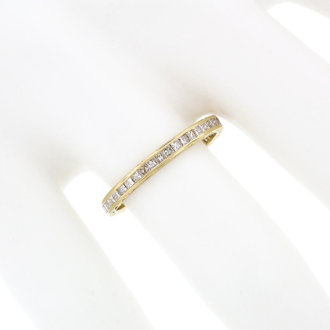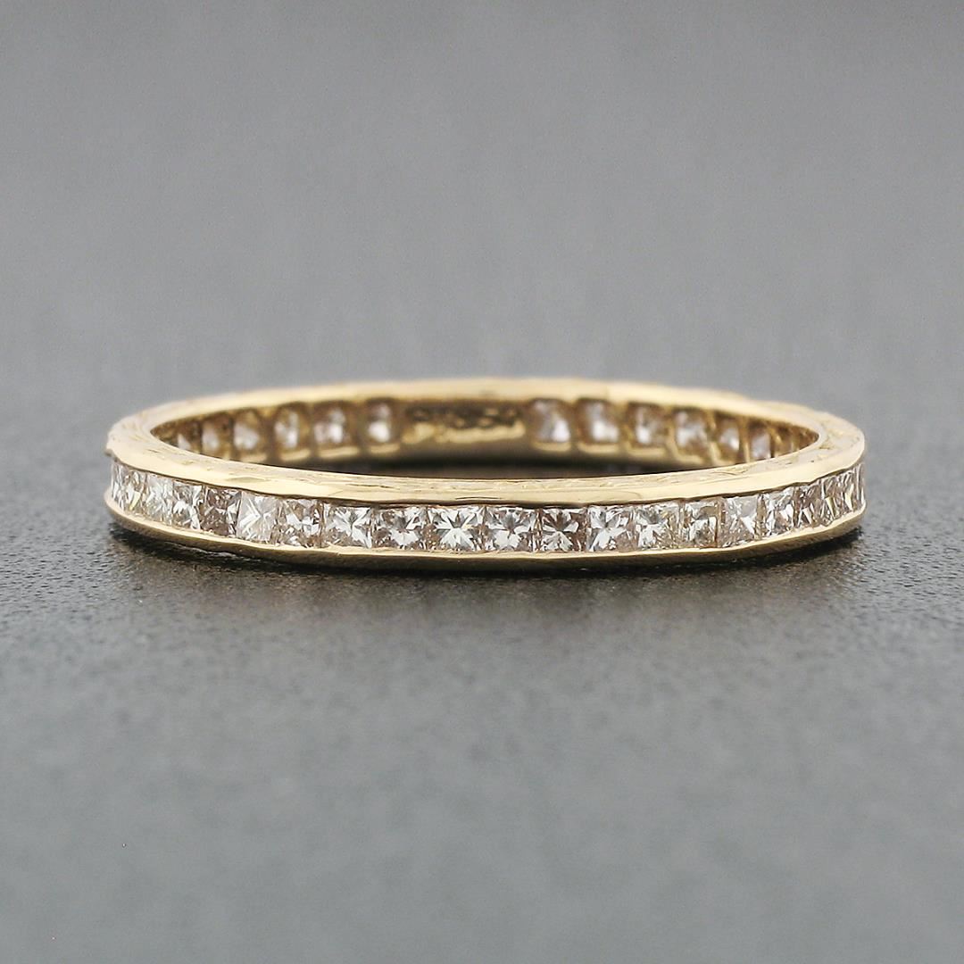A vintage solid 20k yellow gold eternity band ring, with 45 princess cut natrual diamonds (H/I - VS2/SI1 ; 0.70 ctw). The ring is size 6.5, weighs a total of 1.2 grams, and measures 2.3mm wide.