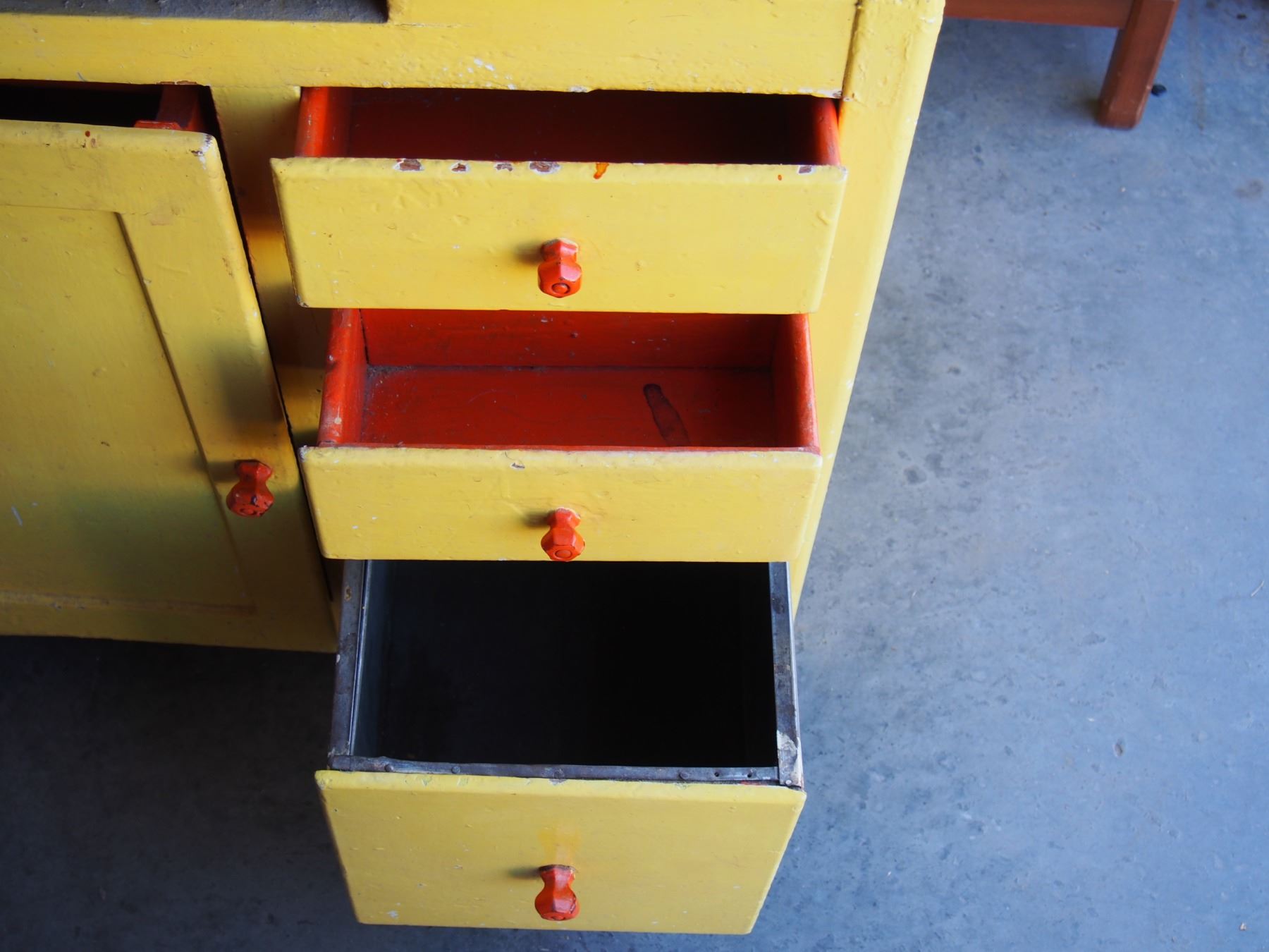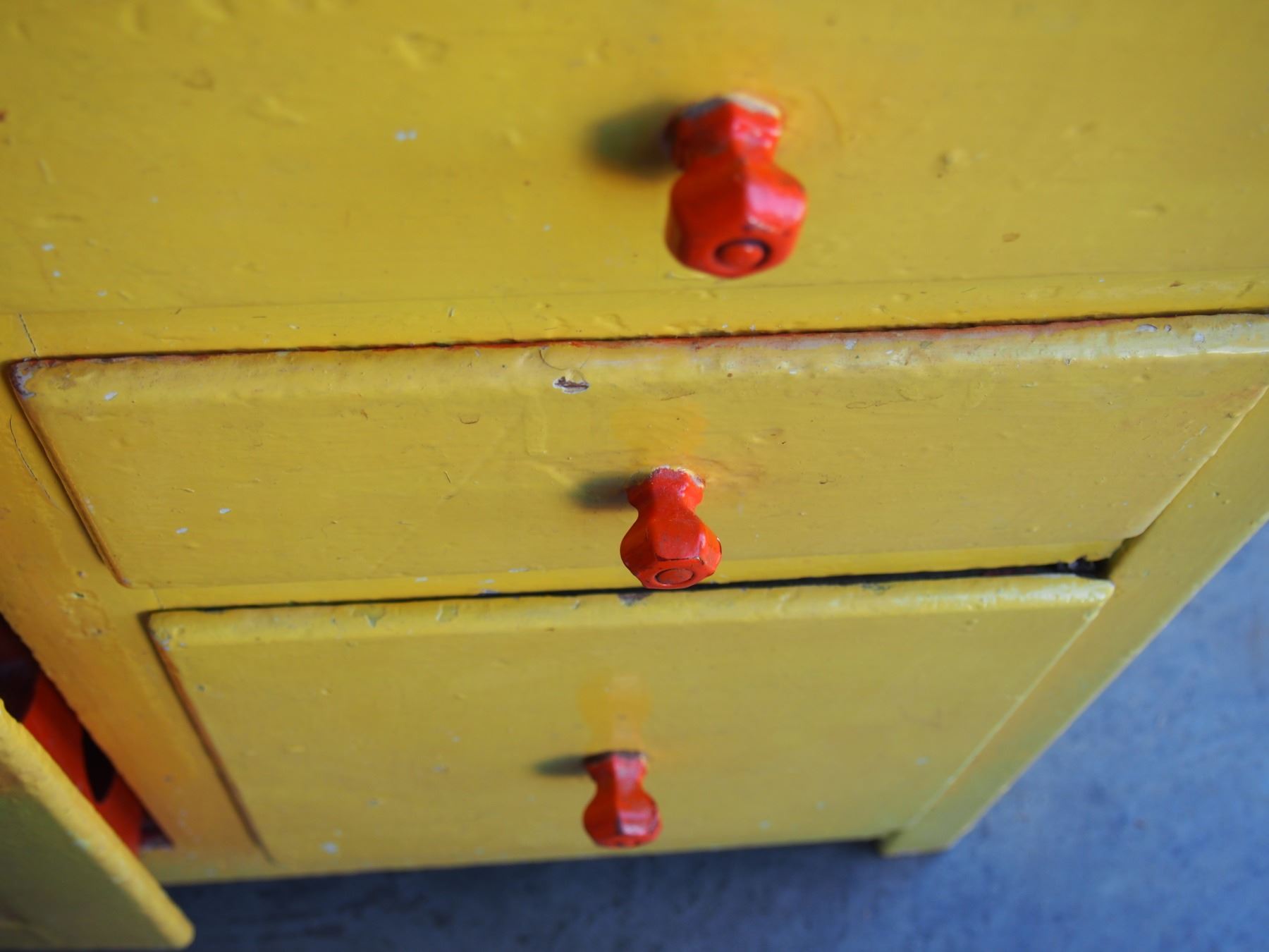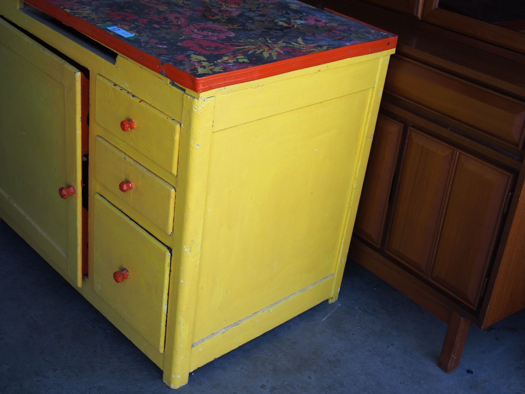 Vintage Yellow Wooden Cabinet on Casters (Missing 1) 39 by 24 by 31" T
