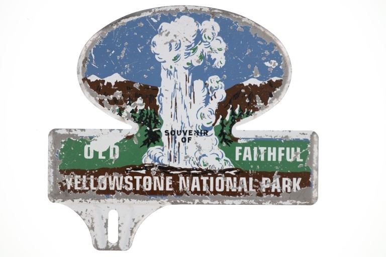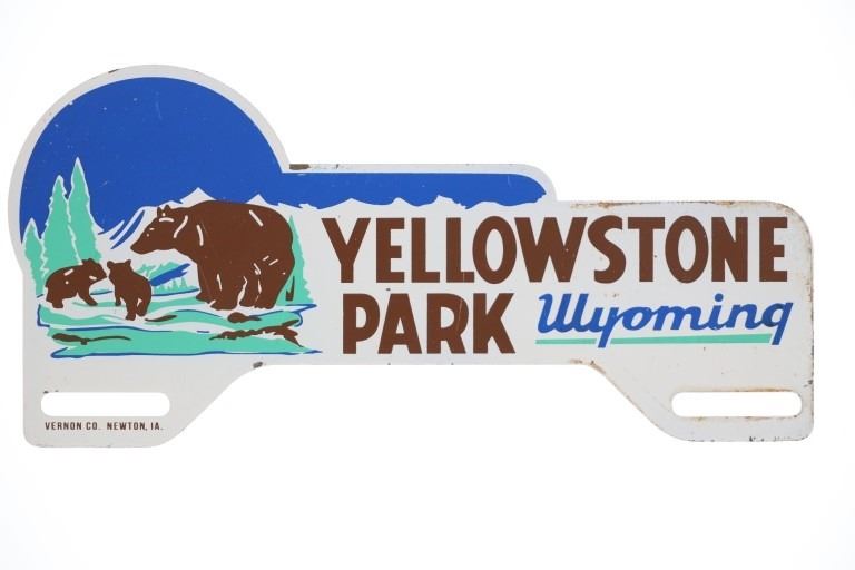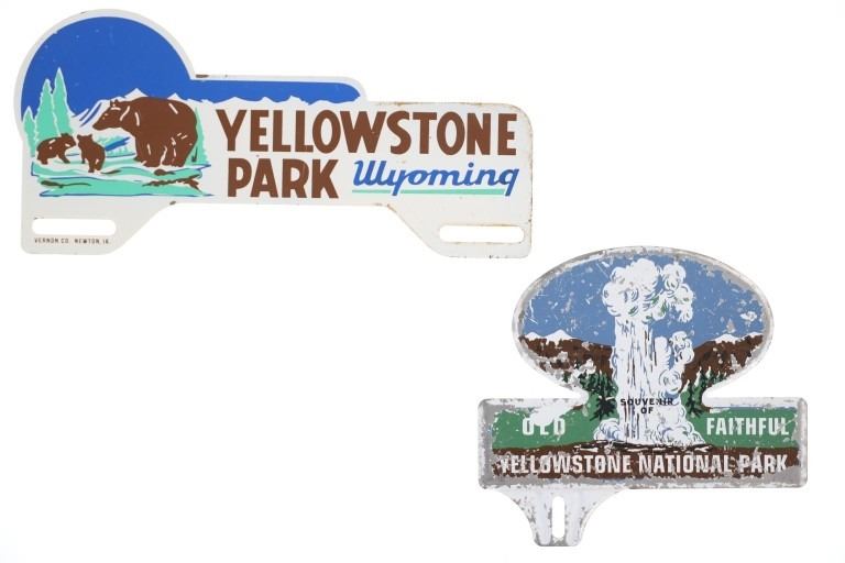 Offered in this lot are Vintage Yellowstone National Park License Plate Toppers, circa 1940s to 1960s. The first polychrome metal topper displays the image of a bear and two cubs standing on a grassy sub-alpine slope against a blue sky background on the left side of the sign with the text, "Yellowstone Park Wyoming" on the right side. Vibrant colours used are brown, green and blue against a white background, mounting slots are on the bottom corners. At the bottom left corner is the manufacturer's name, "Vernon Co. Newton, IA." The second metal topper displays the iconic image of Old Faithful Geyser erupting in white steam against the backdrop of green trees, brown coloured snowcapped mountains and blue sky. Text along the bottom reads, "Souvenir of Old Faithful Yellowstone National Park". Mounting slot at bottom left corner. Known as "America's First National Park", most of Yellowstone Park sits in the state of Wyoming, with smaller portions in both Idaho and Montana. Proudly advertising places visited on cars is a tradition that began with license plate toppers in the 1920s and 1930s. As many of America’s favorite destinations, national parks quickly became part of the trend. The peak popularity for license plate toppers was generally the 1930s through the 1950s. They were largely replaced by license plate frames after the 1950s. The Vernon Company was established in 1902 in Newton, Iowa. The company made calendars, advertising glass mirrors, metal signs, and vinyl, plastic, and metal advertising specialties. Yellowstone National Park toppers marked for the Vernon Company would date after 1955. The first topper is in good overall condition with minimal paint loss. Exhibits scratches and light oxidation from normal use and handling. Second topper is in poor to fair overall condition, paint loss and scratches throughout. Respective measurements are 4.75"W x 10"L and 5.75"W x 6.25"L. Combined weight is 171.5 grams.