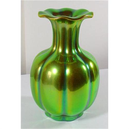 Green iridescent Eosin vase made by the Zsolnay factory of Pecs, Hungary. The vase is fluted with a flared rim, narrow neck, large round body, and a small base. In different light, the vase's green color shows highlights of yellow and blue. Marked on base with Zsolnay logo, Zsolnay Hungary/1868/Pecs/Hand Painted.