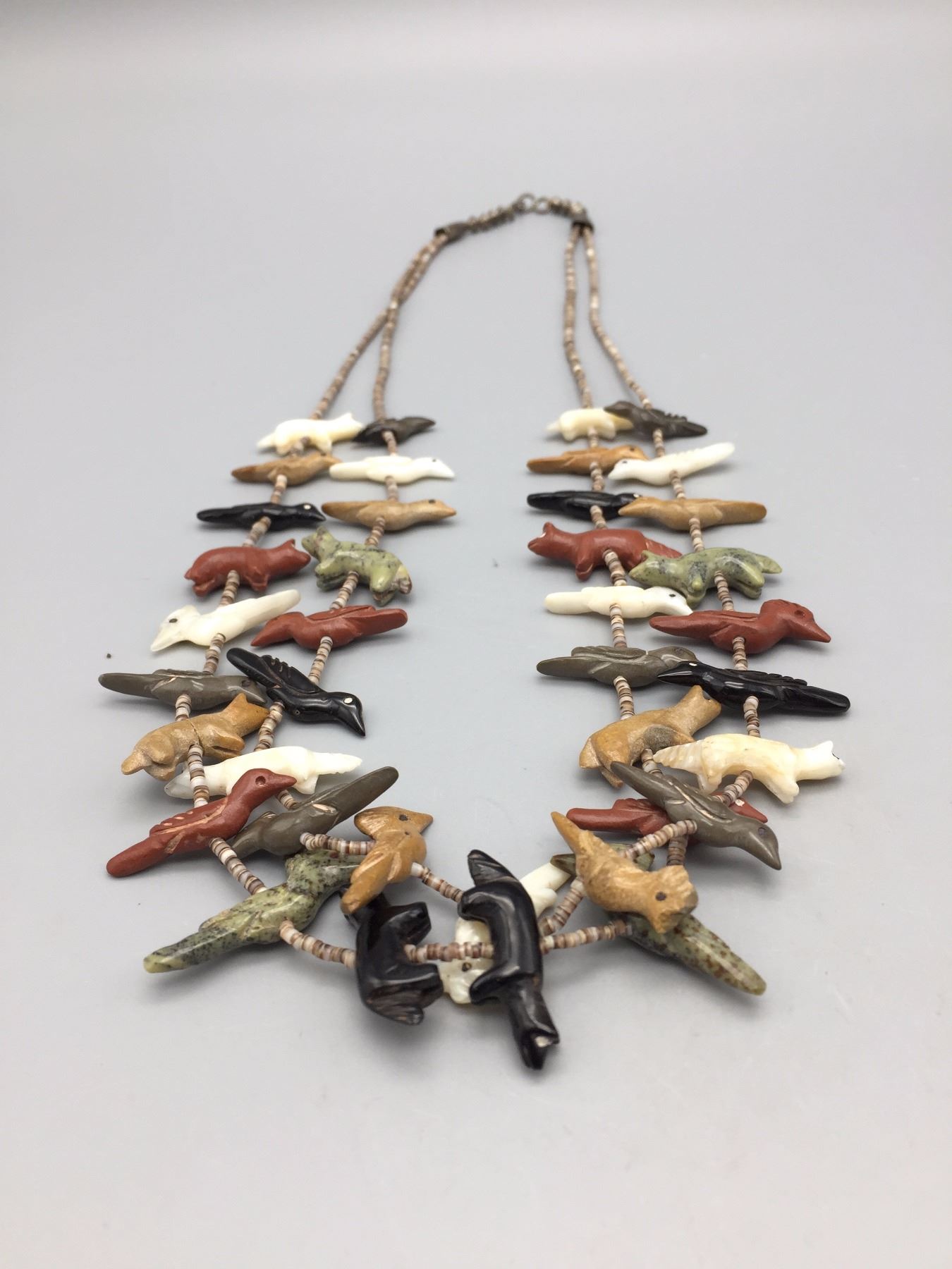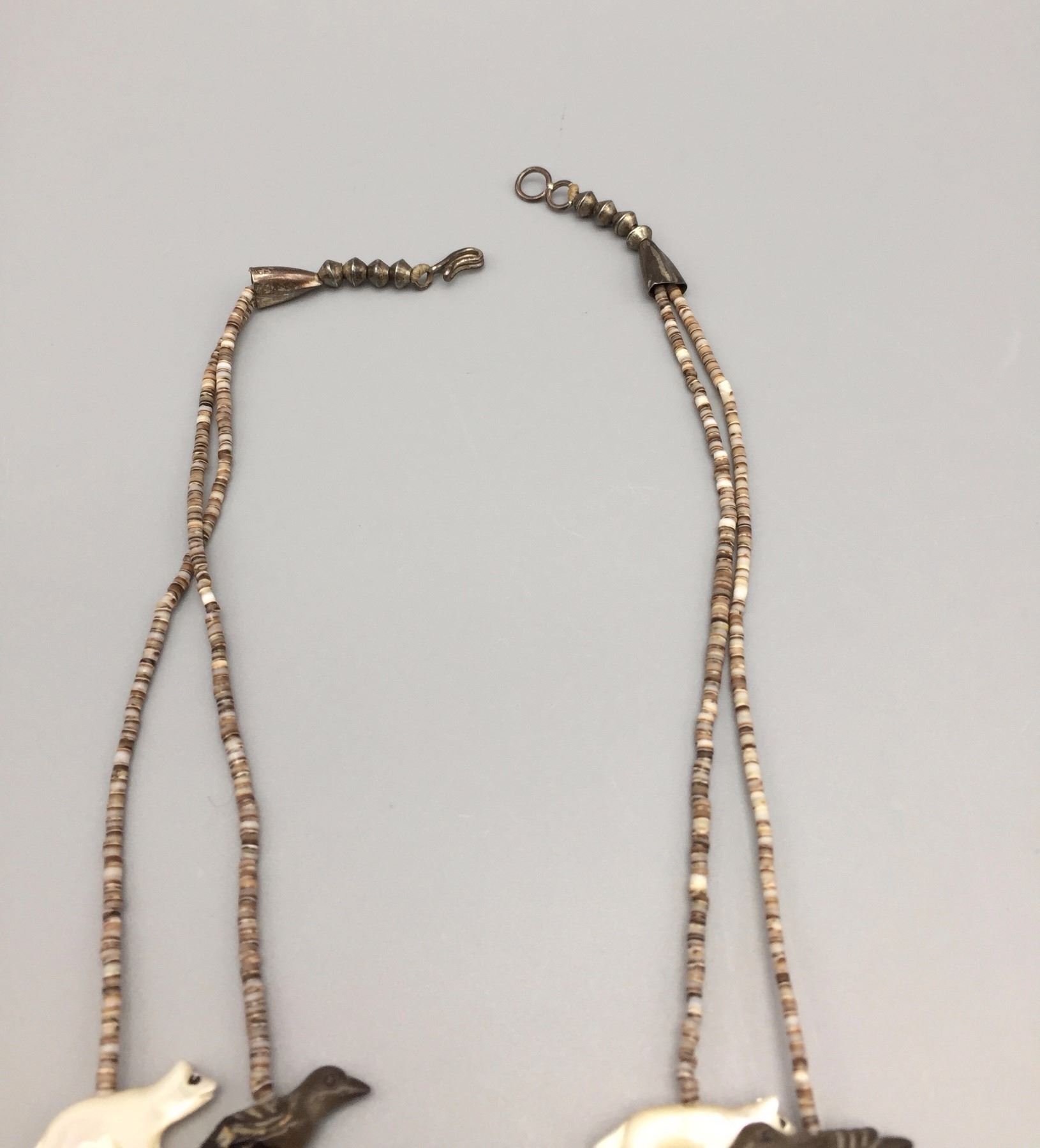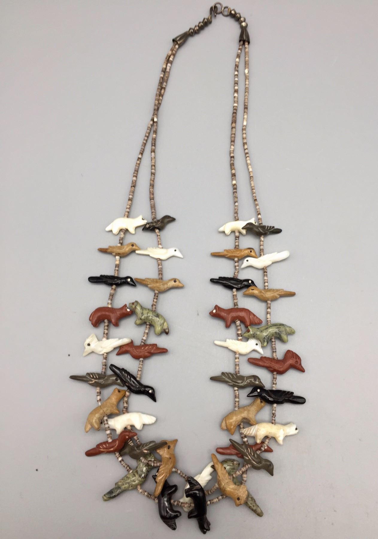 Maker: Unknown, but is vintage Zuni style. One Zuni fetish expert sent us this info as to identification, "Tsikewa family. 70s-Early 80s". Approx. Age: Circa 1970s. (Seller said they bought it in late 60s or early 70s). Size: Measures approx. 22” around the neck and weighs 44.8 g. Additional Info: 2-strand fetish and heishi necklace with sterling silver accents. Hand carved fetishes. Strung on waxed nylon cord. Condition: Good for it’s age, normal wear expected and there are 2 small fetishes with hairline cracks that may be old repairs. They are barely noticeable, but there. Please look closely at the pictures - they are an important part of our description. Shipping: There will be a $5 handling / packaging fee for shipping this lot. The actual cost of postage will be added on top of that.