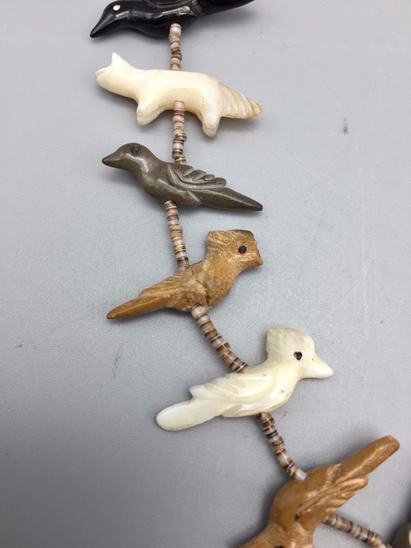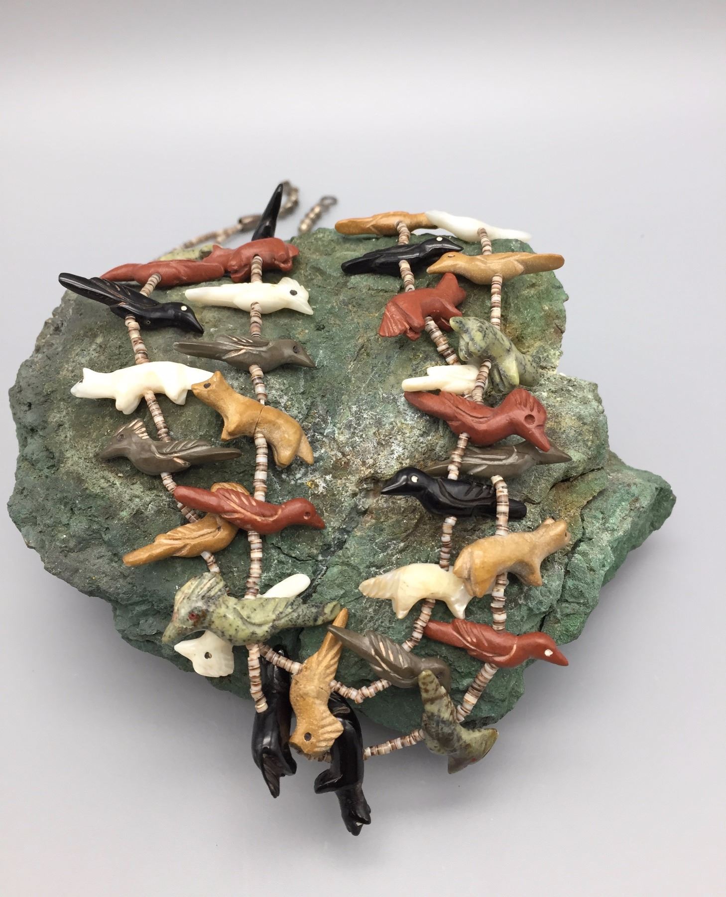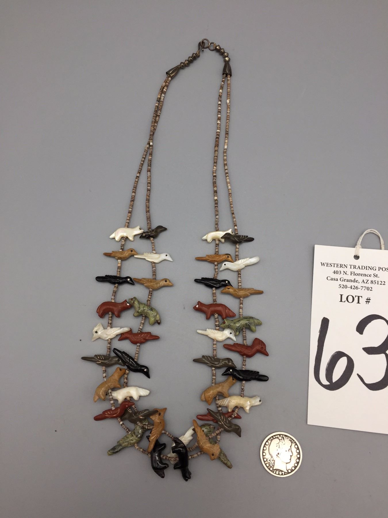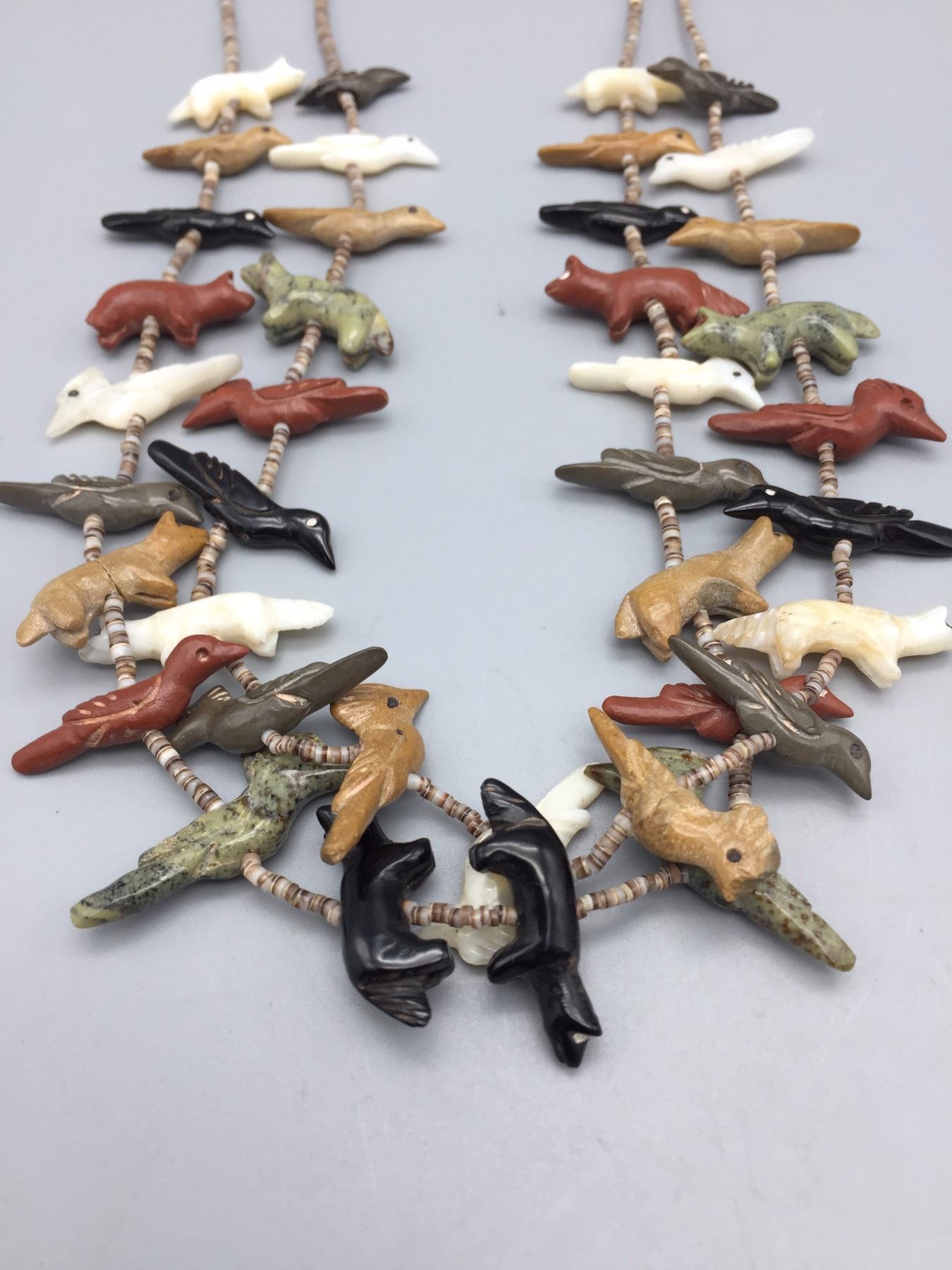 Maker: Unknown, but is vintage Zuni style. One Zuni fetish expert sent us this info as to identification, "Tsikewa family. 70s-Early 80s". Approx. Age: Circa 1970s. (Seller said they bought it in late 60s or early 70s). Size: Measures approx. 22” around the neck and weighs 44.8 g. Additional Info: 2-strand fetish and heishi necklace with sterling silver accents. Hand carved fetishes. Strung on waxed nylon cord. Condition: Good for it’s age, normal wear expected and there are 2 small fetishes with hairline cracks that may be old repairs. They are barely noticeable, but there. Please look closely at the pictures - they are an important part of our description. Shipping: There will be a $5 handling / packaging fee for shipping this lot. The actual cost of postage will be added on top of that.