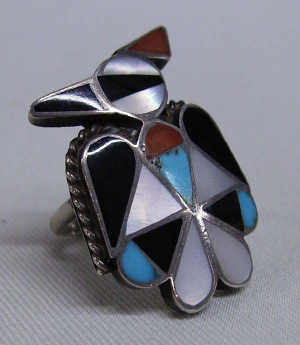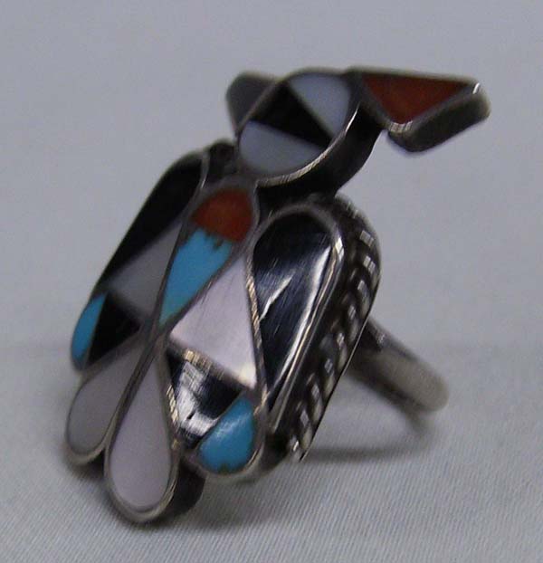 Vintage Native American Zuni Inlaid ''Knifewing'' Dancer Silver Ring. Inlaid turquoise, coral, jet, shell. Size 4. Knifewing figure measures 1-1/8''Hx 4.75''W. Buyers Pay Actual Shipping and Handling Charges(see terms and conditions for more information).