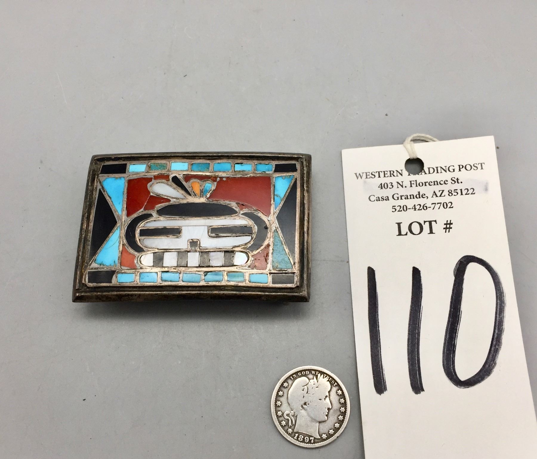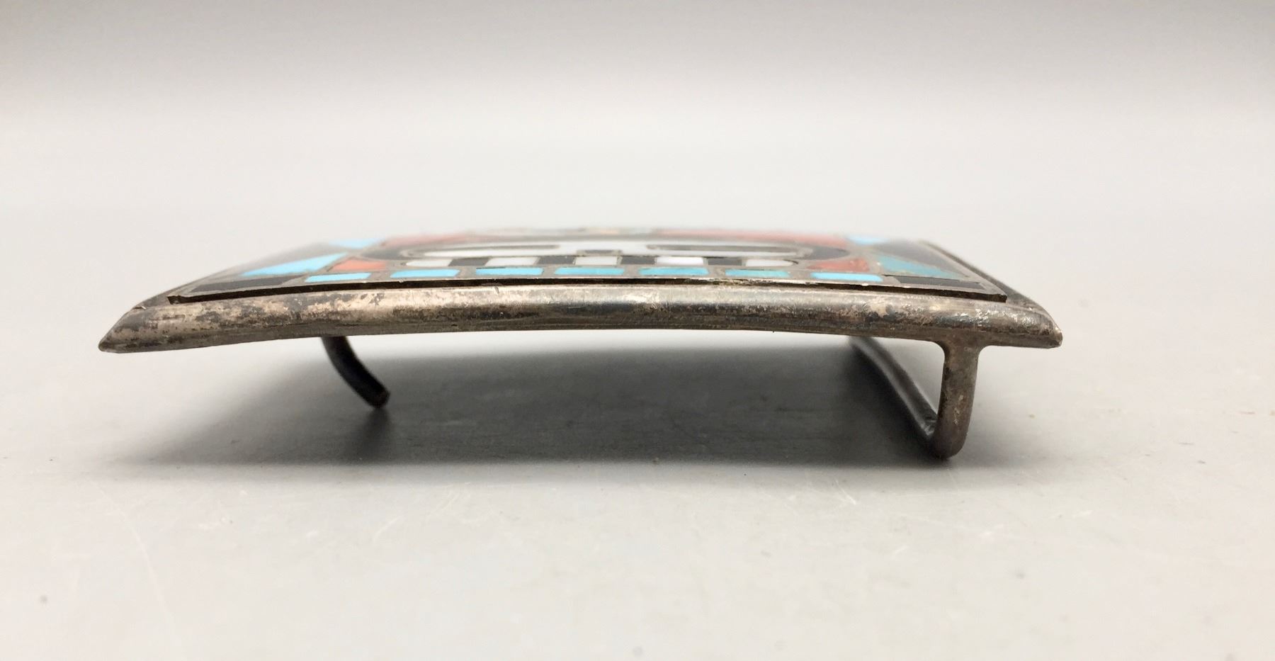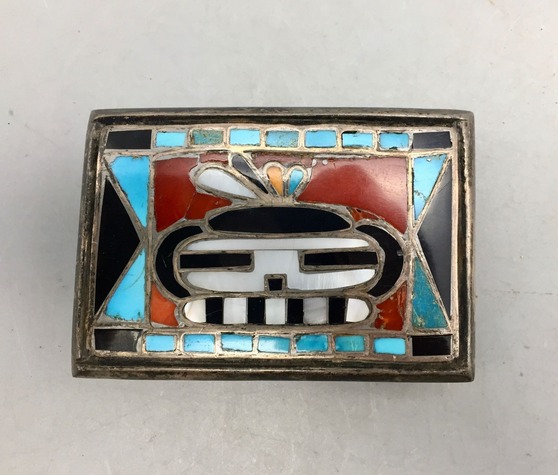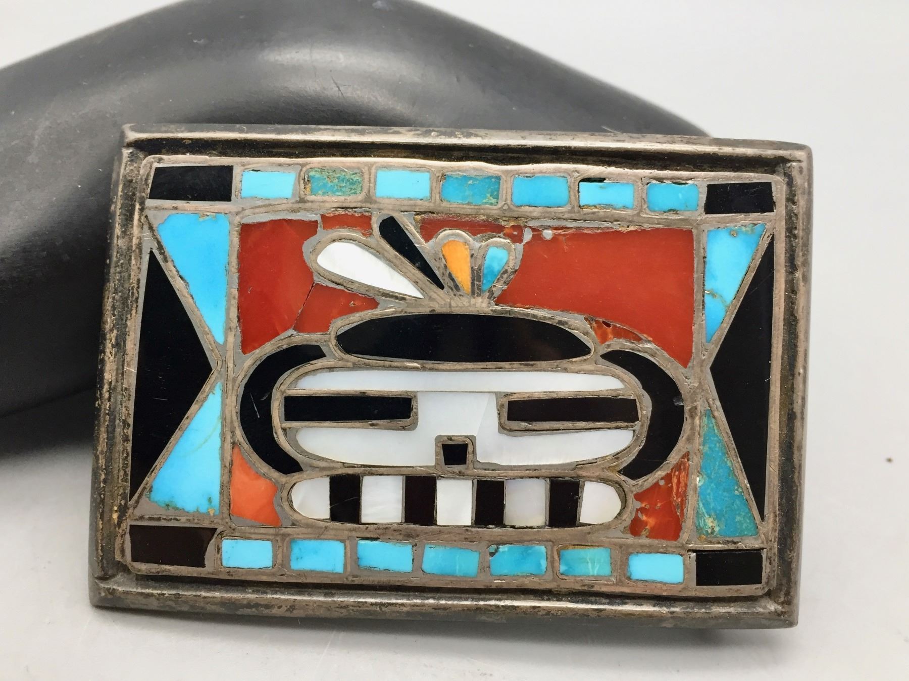 Description: Offered in this lot is a vintage Zuni inlay belt buckle featuring coral, turquoise, black onyx and mother of pearl. It tested as sterling silver. Maker: No hallmark, but vintage Zuni style. Approx. Age: Circa 1960s vintage. Size: 3” wide x 2” tall. Weighs 73.5 grams. Condition: Good for its age, normal wear expected. Please look closely at the pictures - they are an important part of our description. Shipping: There will be a $5 handling / packaging fee for shipping this lot. The actual cost of postage will be added on top of that.