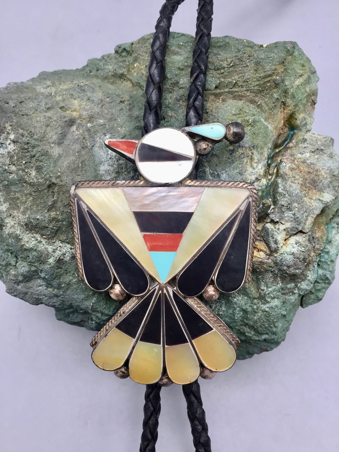 Description: Offered for sale in this lot is a vintage, Zuni, bolo created in a Thunderbird design. It features a multi-stone inlay design. Tested as sterling silver. Maker: No hallmark, but vintage Zuni style. Approx. Age: Circa 1970s - 80s. Size: Fits a 39” neck. Slide measures 2” wide x 3” tall. Weighs 47.6 grams. Condition: Good for its age, normal wear expected. Please look closely at the pictures - they are an important part of our description. Shipping: There will be a $5 handling / packaging fee for shipping this lot. The actual cost of postage will be added on top of that.