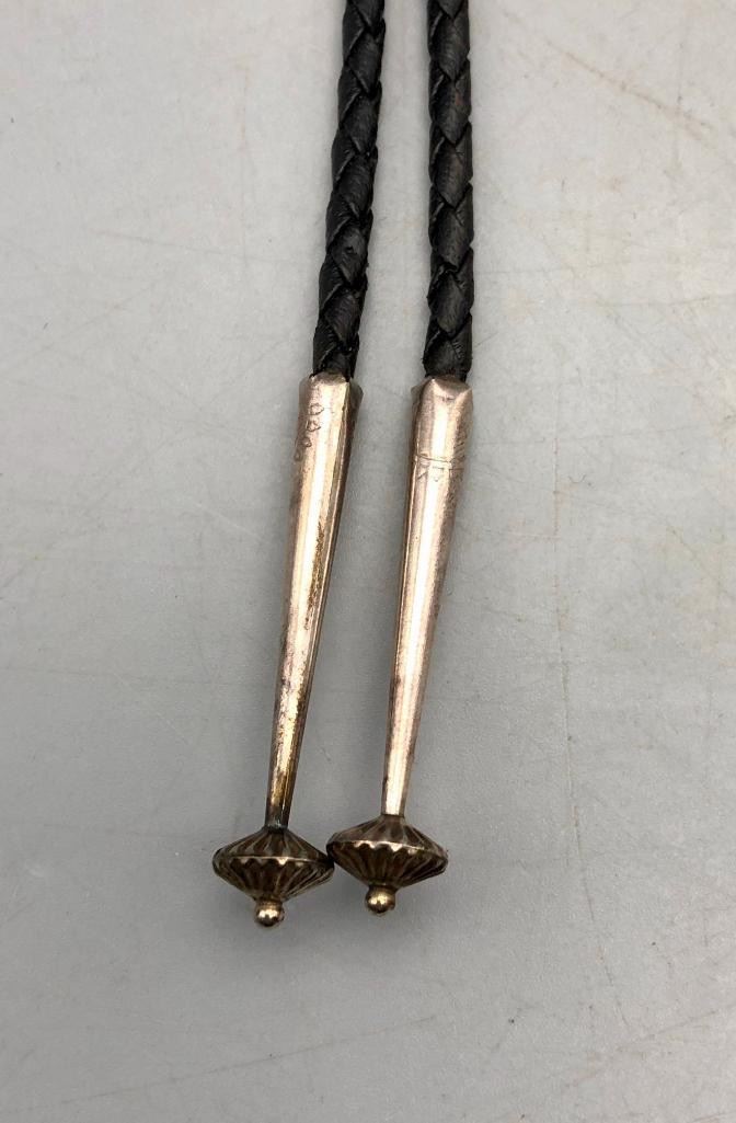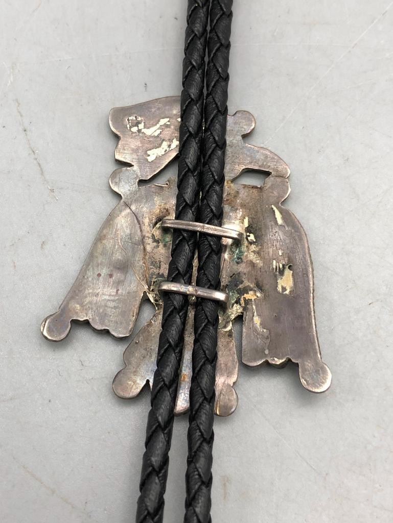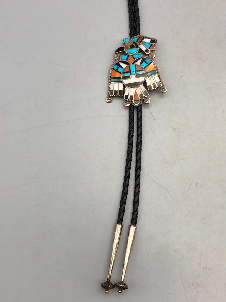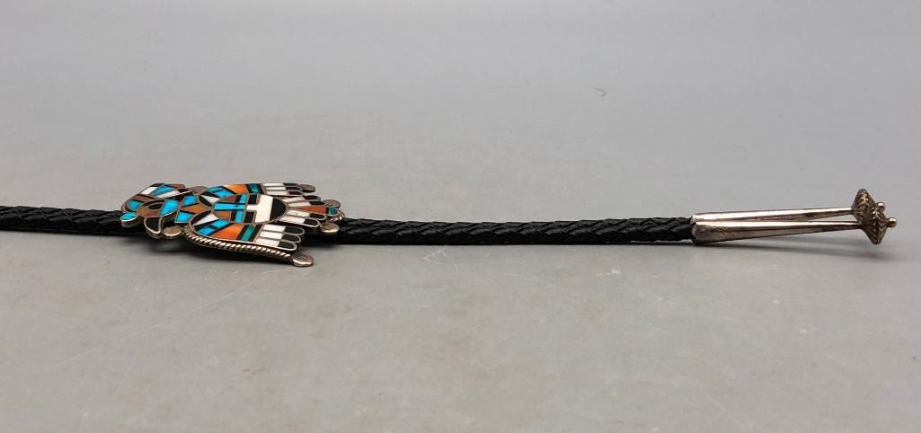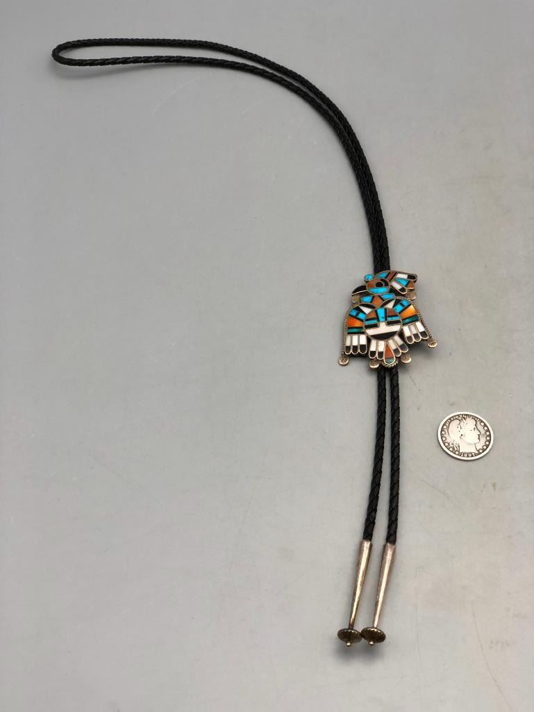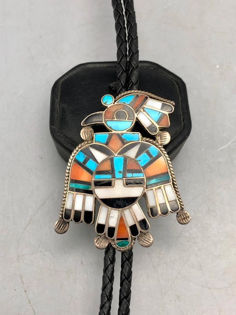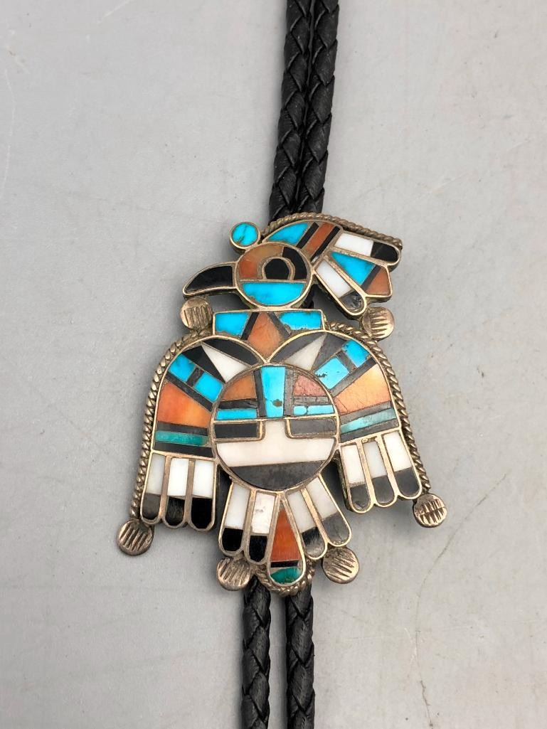 For your consideration is this vintage Zuni inlay bolo, circa 1950s. The slide is a thunderbird design. It is set with coral, turquoise, black onyx, and mother of pearl. It is sterling silver and is on a black leather cord with sterling silver tips. Maker: Unmarked. Approx. Age: 1950s. Size: Braided cord measures 36 inches long. Slide measures 2-1/8 inches long X 1-7/8 inches wide. Weighs 26 grams. Condition: Good for its age, normal wear expected. Please look closely at the pictures - they are an important part of our description. Shipping: There will be a $5 handling / packaging fee for shipping this lot. The actual cost of postage will be added on top of that. BUY IT NOW: If you would like to buy this item now without waiting for the auction to end (this option is only available up to 48 hours before the auction starts to close), the “Buy it Now” price is the high estimate of this lot. If you would like to end the auction early and pay the high estimate (plus applicable fees), please contact us by phone or email and reference this lot number.