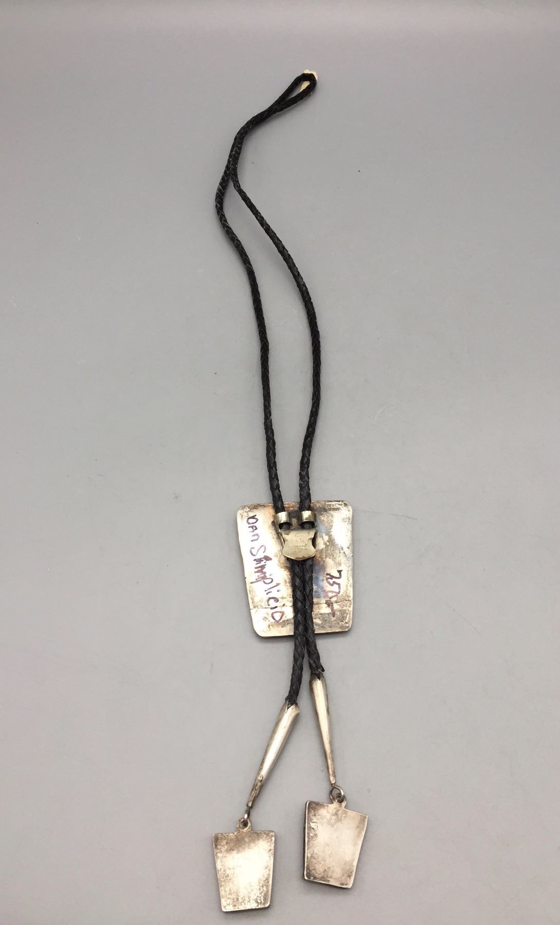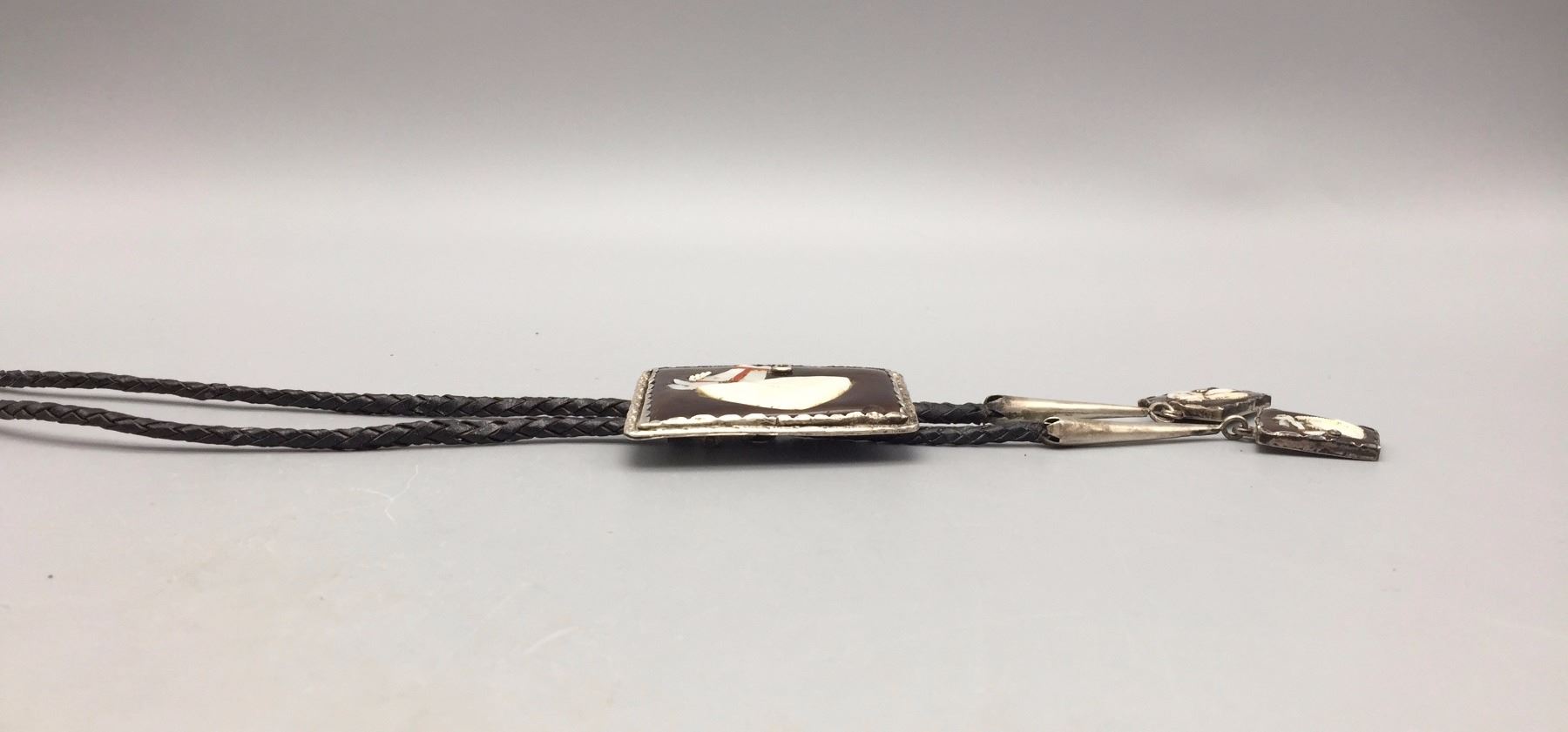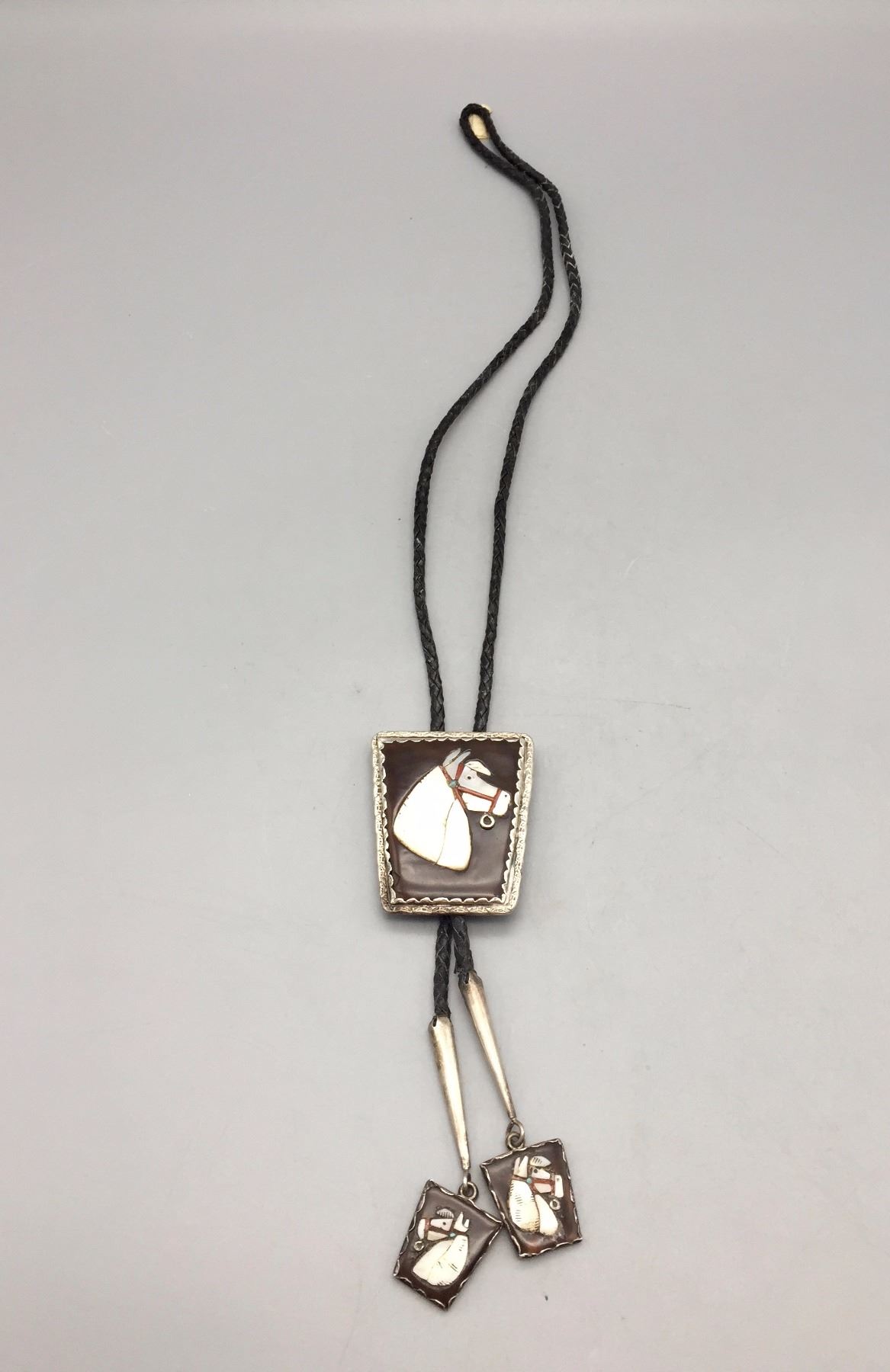 Description: Vintage Zuni inlay bolo tie featuring a horse design. Cord is braided black leather with matching sterling silver tips. Maker: Attributed to Mike Simplicio, even though it is marked as Dan Simplicio on the back (by a previous owner). Approx. Age: Vintage, circa 1960s or early 70s (based on style and it has a Bennett, C-31 clasp on the back which was produced from about the mid-50s thru mid-60s). Size: Fits a 40” neck. Slide measures 2”w x 2-1/2”h. Weighs 58.1 grams. Condition: Good for its age, normal wear expected. Please look closely at the pictures - they are an important part of our description. Shipping: There will be a $5 handling / packaging fee for shipping this lot. The actual cost of postage will be added on top of that.