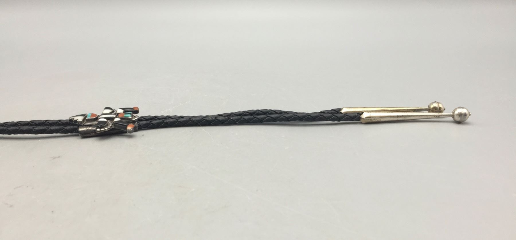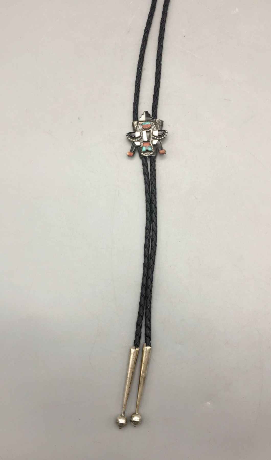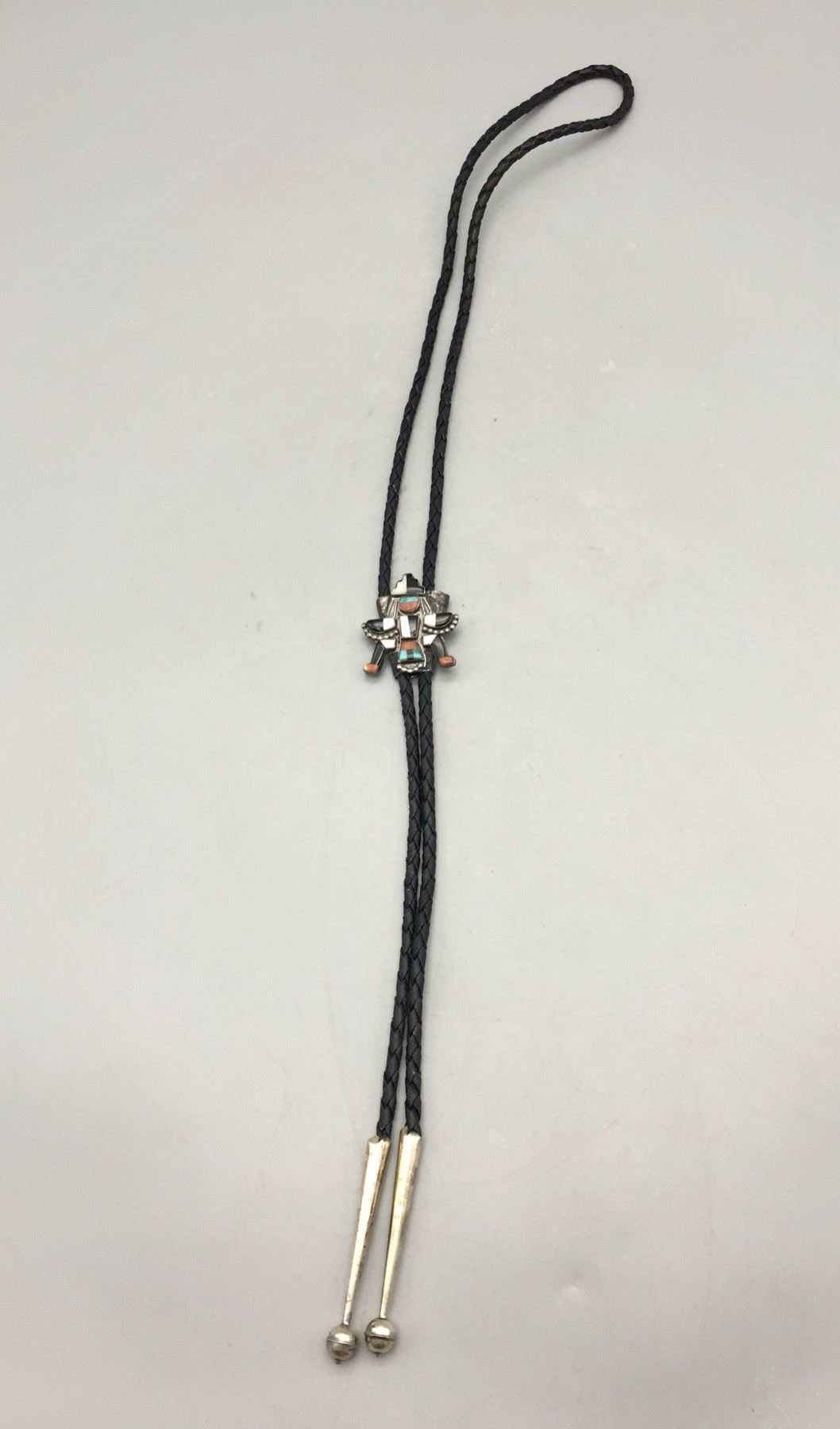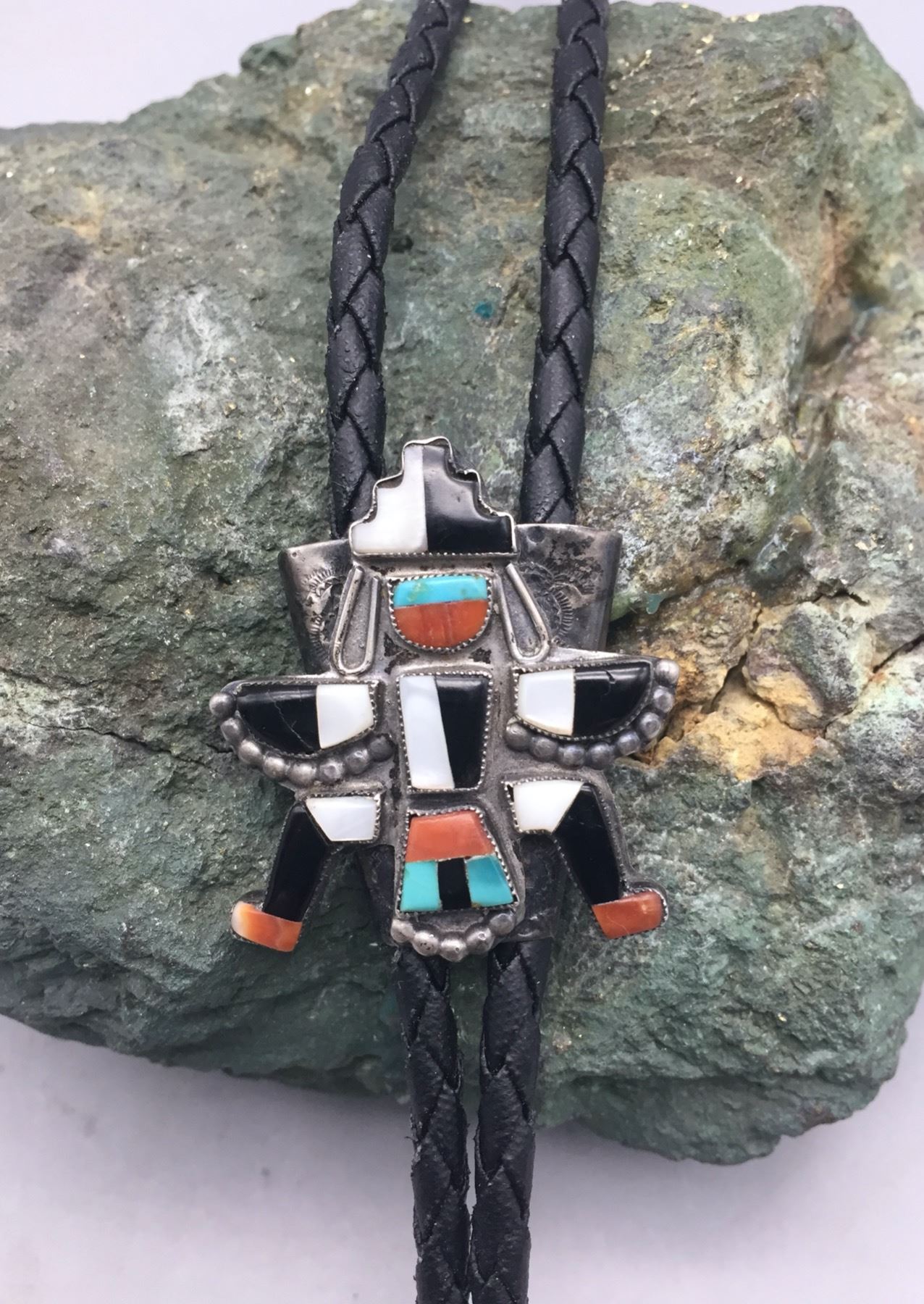 Description: For sale in this lot we have a vintage Zuni inlay bolo tie featuring the knifewing design. The inlay uses turquoise, mother of pearl, onyx, and coral all set in in sterling silver. Maker: Unmarked. Approx. Age: Circa 1960s. Size: Black braided cord measures 38 inches long. Slide measures 1-3/8 inches long x 1-1/4 inches wide. Weighs 22.3 grams. Condition: Good for its age, normal wear expected. Please look closely at the pictures - they are an important part of our description. Shipping: There will be a $5 handling, packaging fee for shipping this lot. The actual cost of postage will be added on top of that.