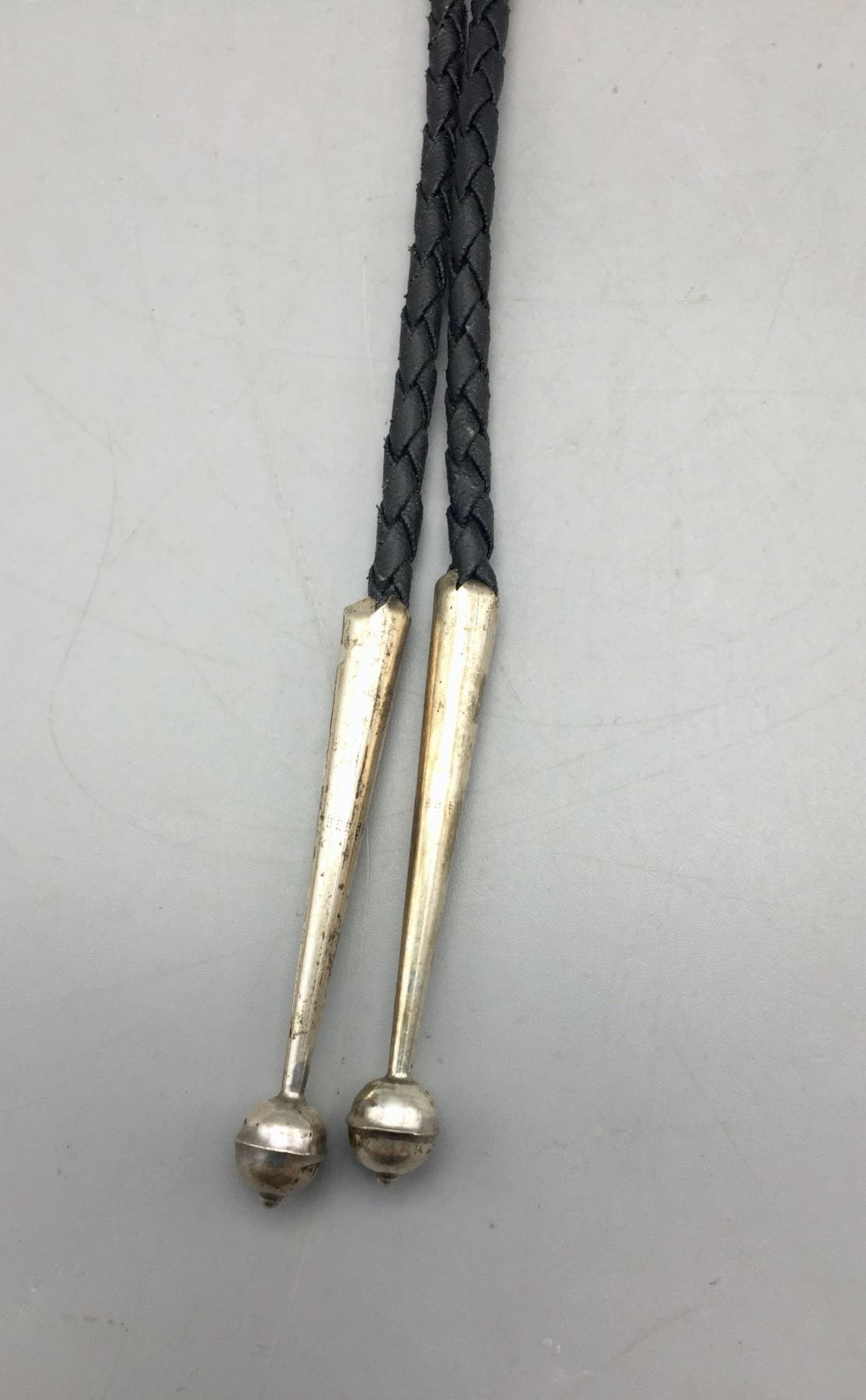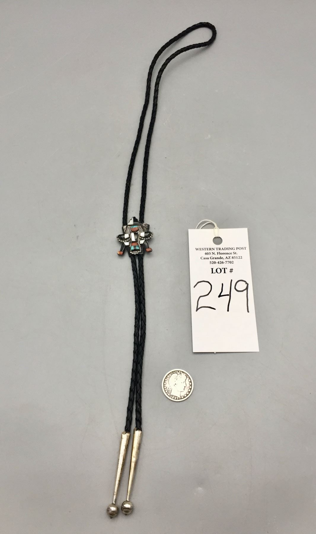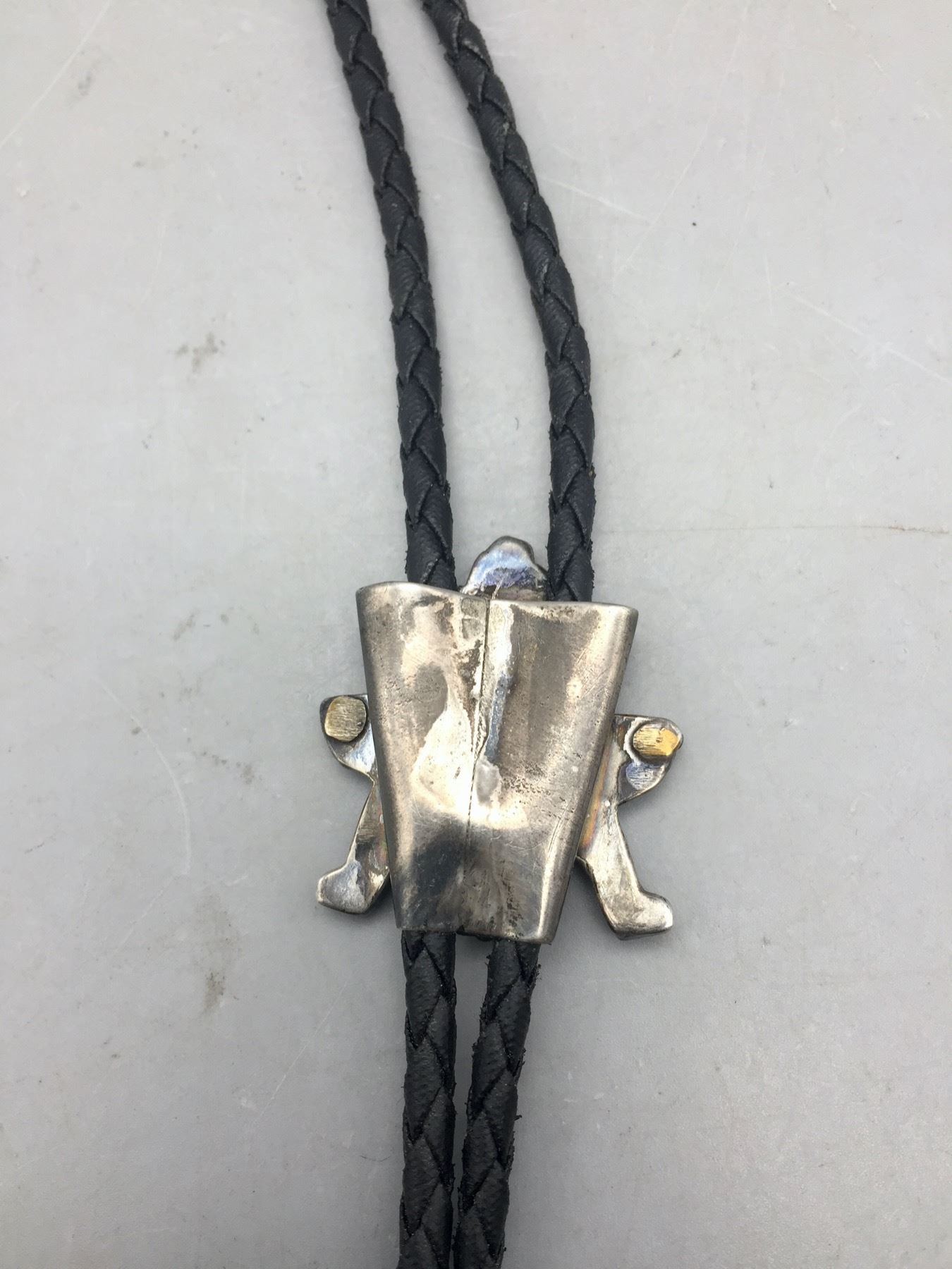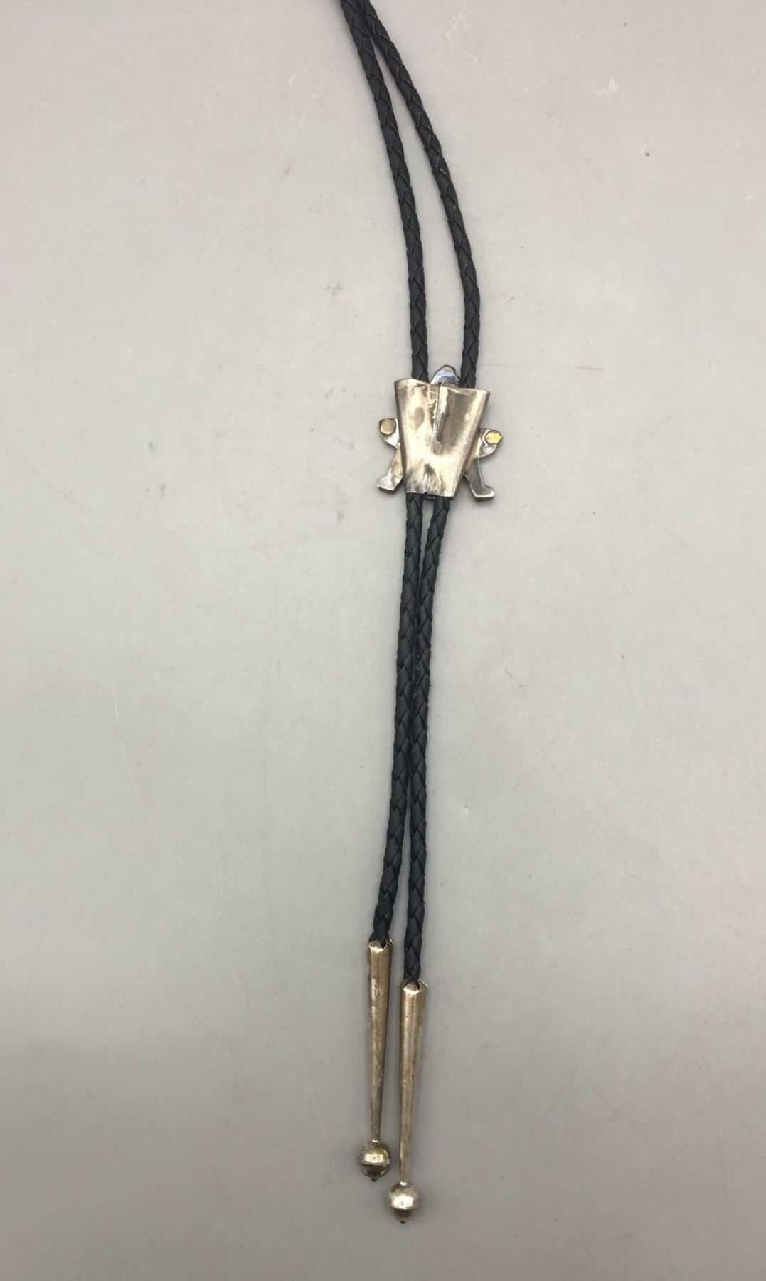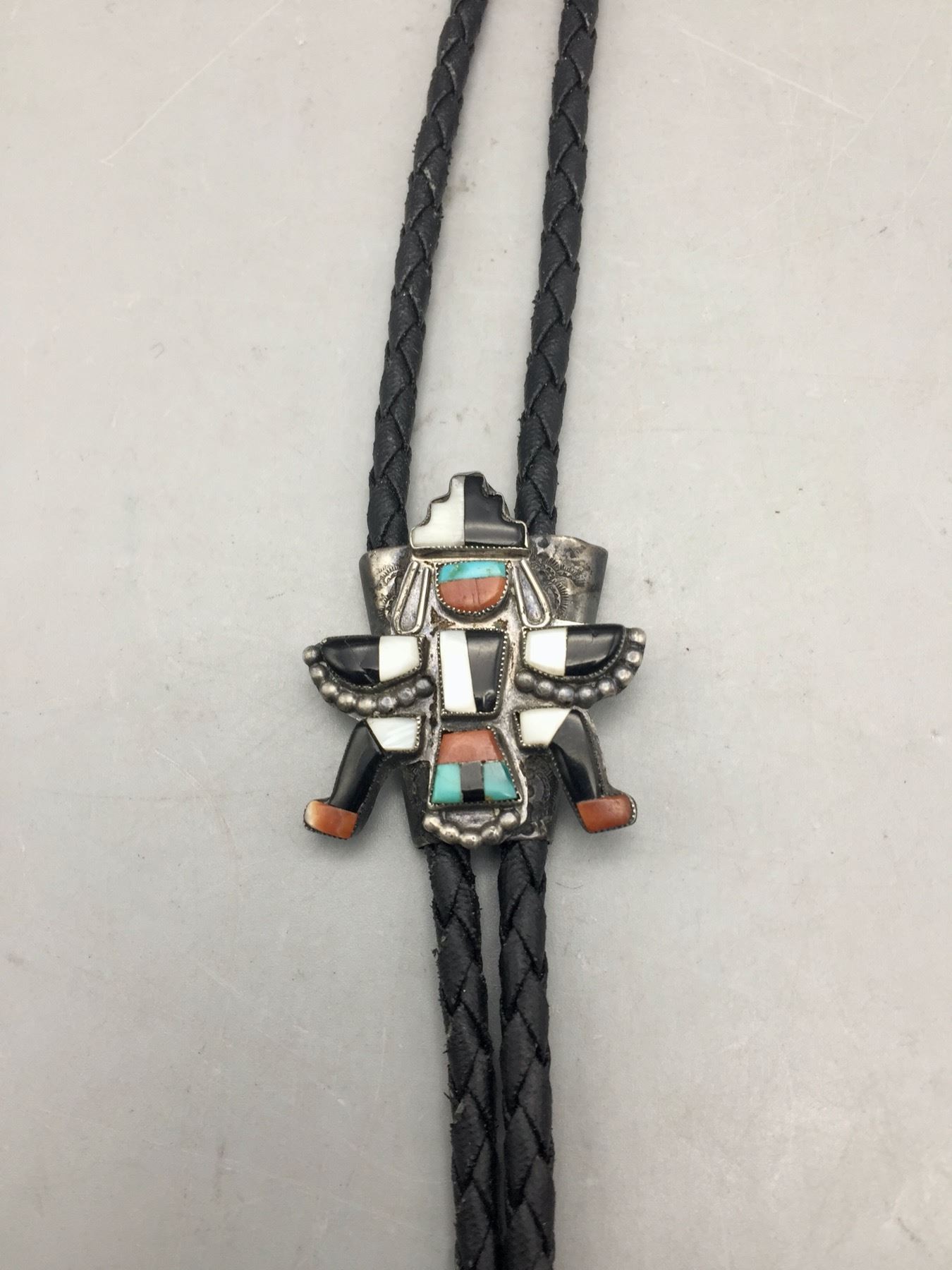 Description: For sale in this lot we have a vintage Zuni inlay bolo tie featuring the knifewing design. The inlay uses turquoise, mother of pearl, onyx, and coral all set in in sterling silver. Maker: Unmarked. Approx. Age: Circa 1960s. Size: Black braided cord measures 38 inches long. Slide measures 1-3/8 inches long x 1-1/4 inches wide. Weighs 22.3 grams. Condition: Good for its age, normal wear expected. Please look closely at the pictures - they are an important part of our description. Shipping: There will be a $5 handling, packaging fee for shipping this lot. The actual cost of postage will be added on top of that.