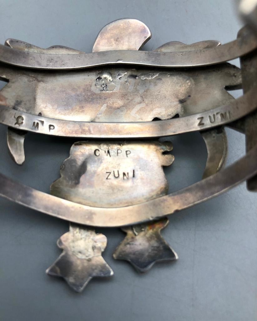 For sale in this lot is a vintage Zuni inlay bracelet. This great bracelet features an eagle dancer, set with turquoise, coral, onyx, shell, and carved turquoise. It also has great, hand stamped silverwork designs on the sides. Maker: Hallmarked CMP, Zuni. Charles and Mary Ann Poncho (Zuni). Active since 1950s. Approx. Age: 1960s. Size: Inside circumference is 5-1/4 inches long. Opening is an additional 1-1/8 inch, fitting a 6-3/8 inch wrist. Width is 2-3/4 inches. Weighs 70 grams. Condition: Good for its age, normal wear expected. Please look closely at the pictures - they are an important part of our description. Shipping: There will be a $5 handling / packaging fee for shipping this lot. The actual cost of postage will be added on top of that. BUY IT NOW: If you would like to buy this item now without waiting for the auction to end (this option is only available up to 48 hours before the auction starts to close), the “Buy it Now” price is the high estimate of this lot. If you would like to end the auction early and pay the high estimate (plus applicable fees), please contact us by phone or email and reference this lot number.