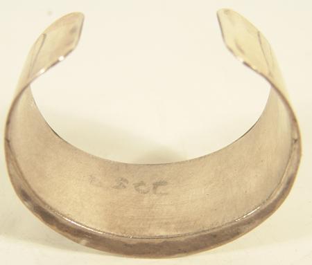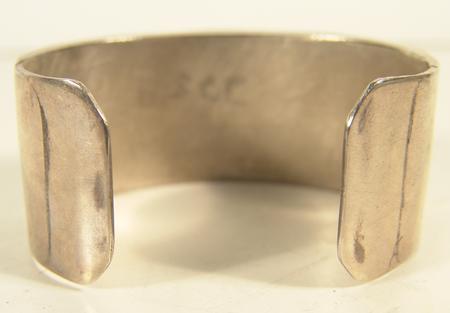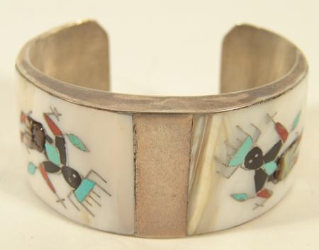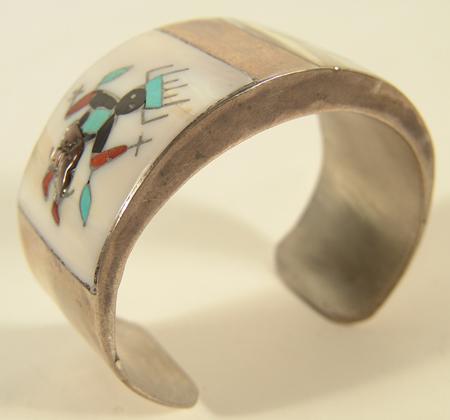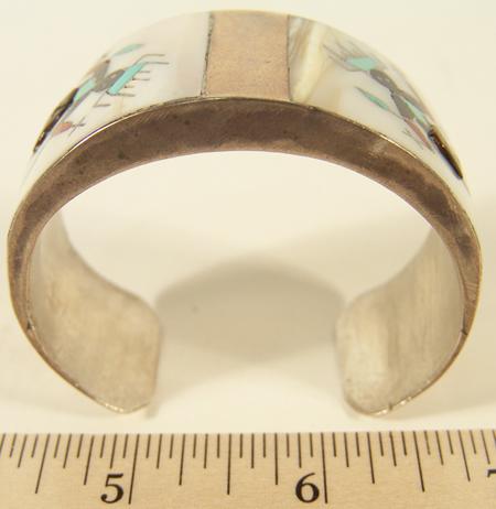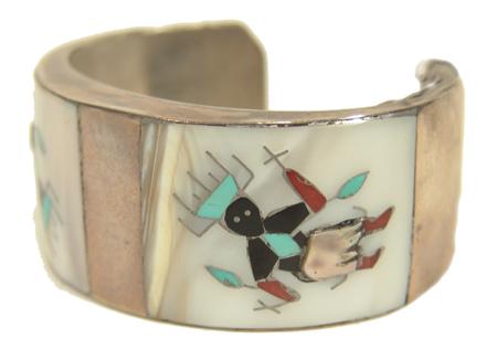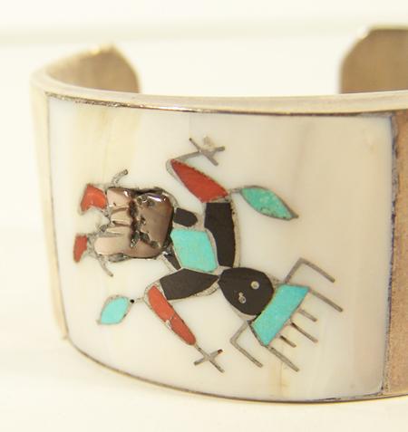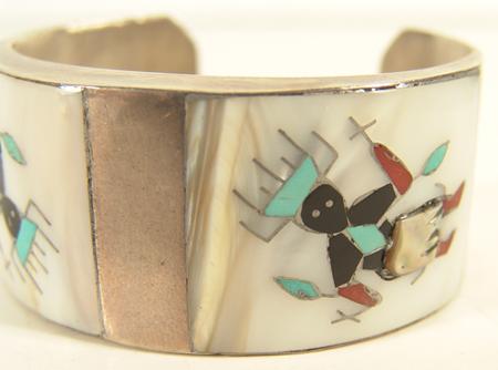 Classic Zuni bracelet done in silver with two inlaid Devil Dancers set in mother-of-pearl. Purchased from Foutz's Indian Room in 1973 for $225. 5-3/8" plus 1-1/8" gap x 1-1/8" wide