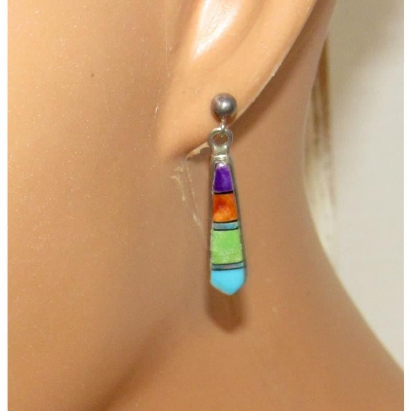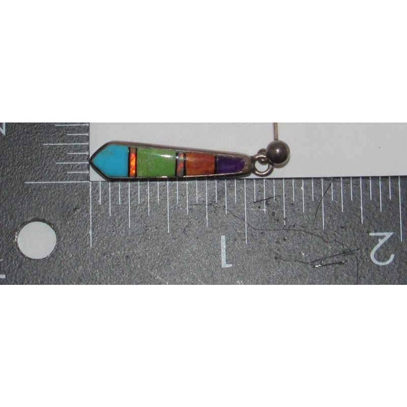 Vintage Zuni Inlay Dangle Earrings. Turquoise, Spiny Oyster, Opal, Sterling Silver. Measure about 1 1/4". FREE SHIPPING ON ALL JEWELRY ORDERS WITHIN THE US! WE SHIP ALL ITEMS IN-HOUSE!