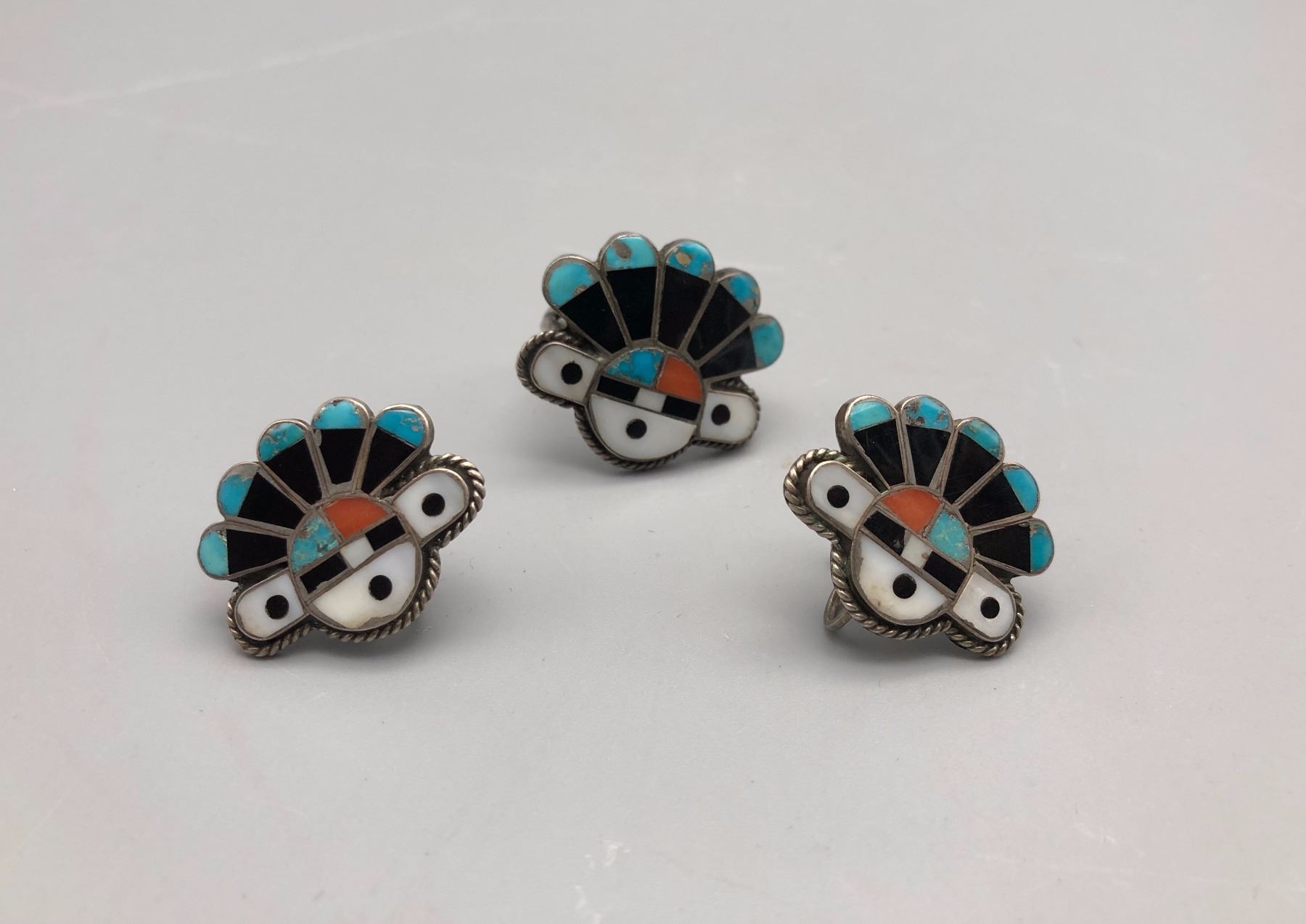 Maker: Unknown Zuni maker. Approx. Age: Vintage (Circa 1960s). Size: Ring size is 8. Earrings are 1” w x 7/8” long. Lot weighs 18.5 g. Additional Info: Vintage sterling silver ring and earrings that match the bracelet in lot 20. They have turquoise, onyx, MOP and coral inlay, Zuni Sunface design. Condition: Good for it’s age, normal wear expected. Please look closely at the pictures - they are an important part of our description. Shipping: There will be a $5 handling / packaging fee for shipping this lot. The actual cost of postage will be added on top of that.