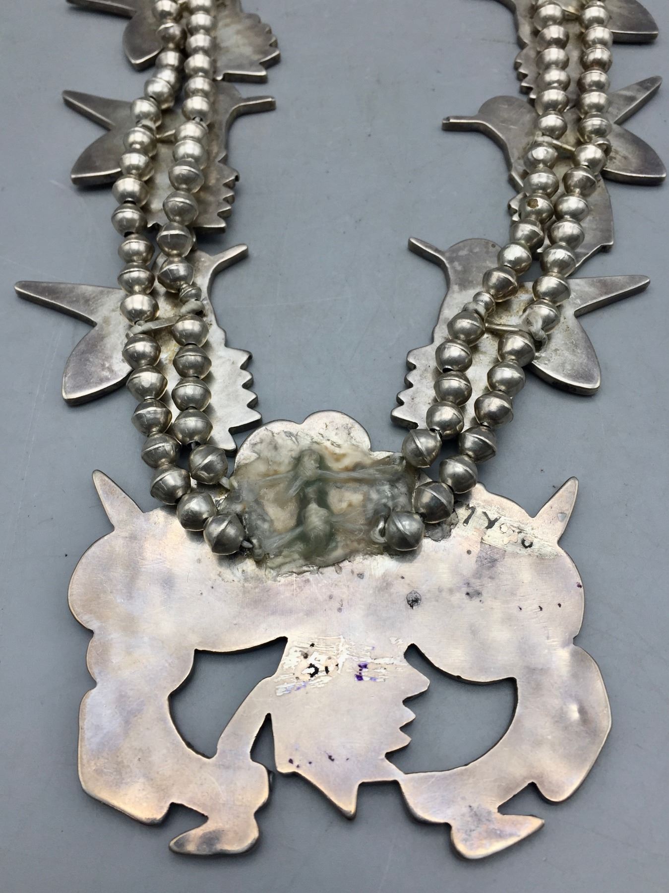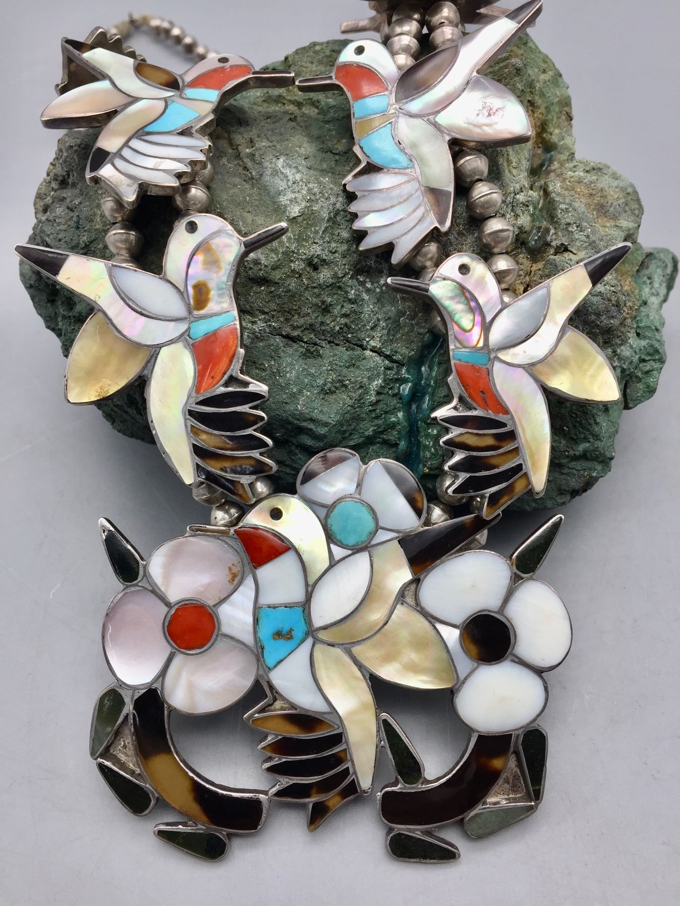 Description: Available for your bidding pleasure is this vintage, Zuni inlay, squash blossom style necklace featuring coral, turquoise, black onyx, mother of pearl and tortoise shell inlay, all in a hummingbird design. Has handmade beads! This is a good one! Maker: No hallmark. Approx. Age: Circa 1960s or early 1970s vintage. Size: Fits a 26” neck. Pendant measures 3”w x 2” long. Weighs 59.7 grams. Condition: Good for its age, normal wear expected. Please look closely at the pictures - they are an important part of our description. Shipping: There will be a $5 handling / packaging fee for shipping this lot. The actual cost of postage will be added on top of that.